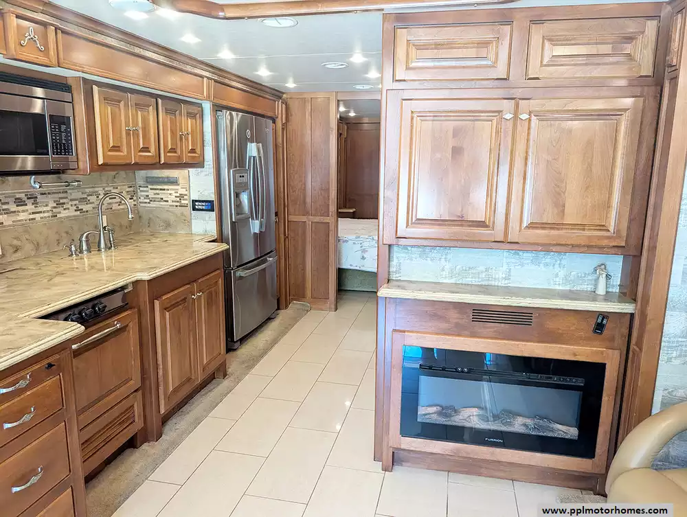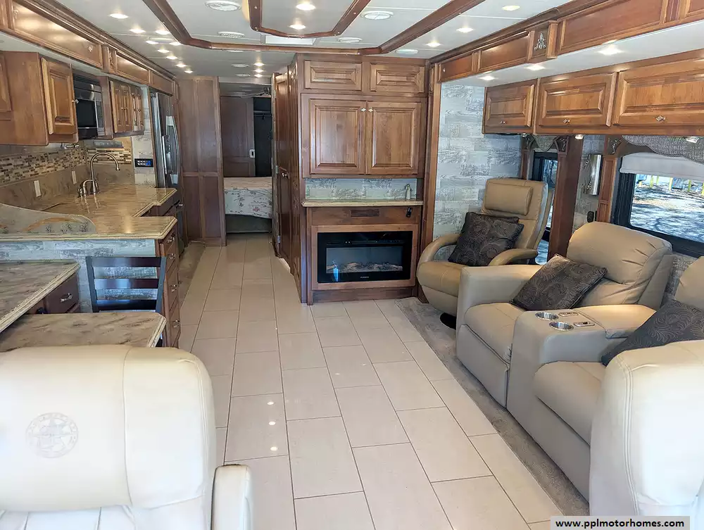 The interior is a showcase of residential comfort, featuring a chef's kitchen equipped with a residential Whirlpool refrigerator, in-fridge ice maker, dishwasher, convection microwave, and a 3-burner range. Whether you are relaxing by the fireplace or hosting guests, the entertainment options are endless with a satellite receiver and four TVs located throughout the coach, including a dedicated outside entertainment system. Designed for ultimate convenience and climate control, this motorhome includes an Onan diesel generator, three ducted air conditioners, automatic levelers, and an outside shower. From the automatic main and slide/door awnings to the meticulous attention to detail, this Phaeton 40AH offers the perfect balance of luxury and performance for the discerning traveler.