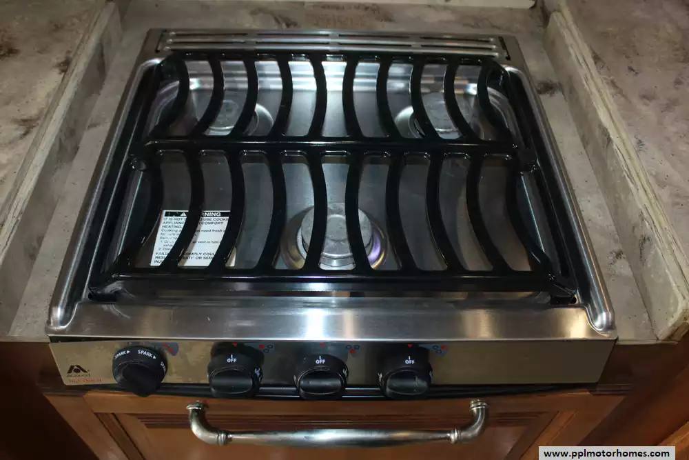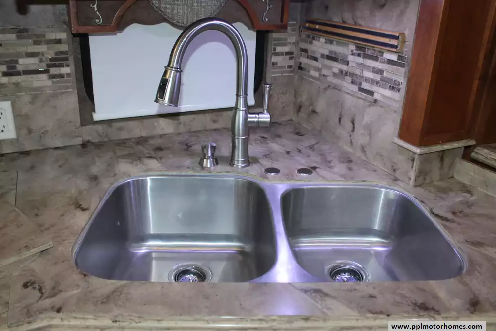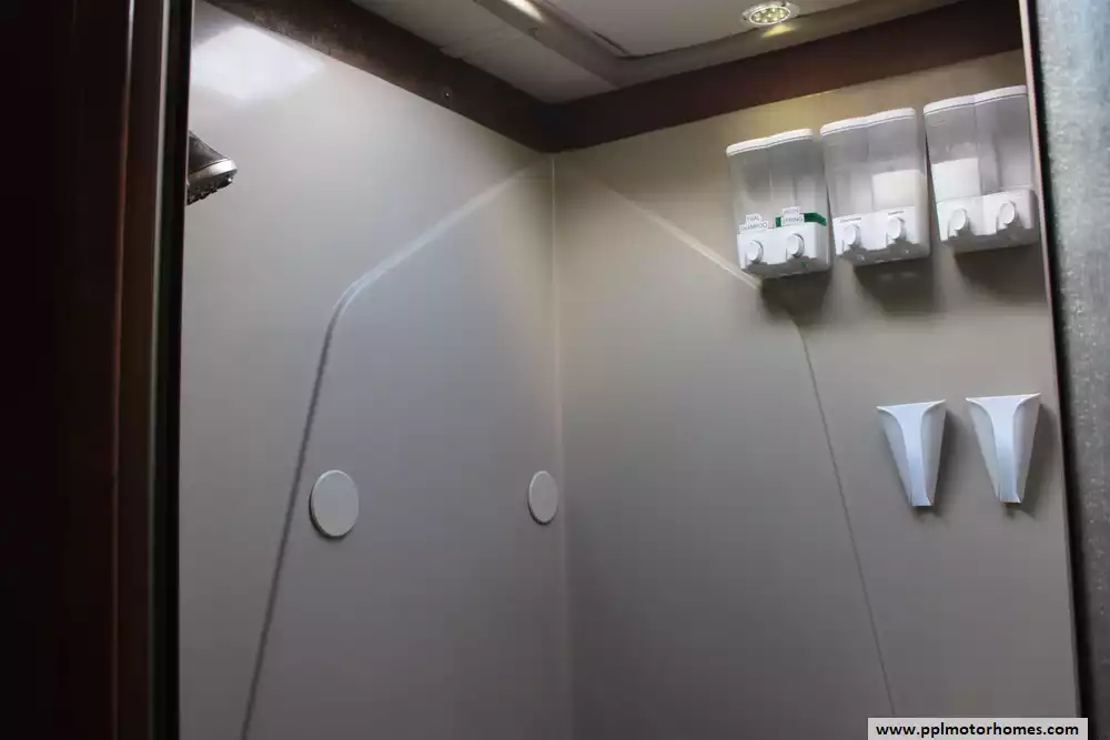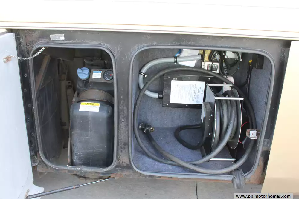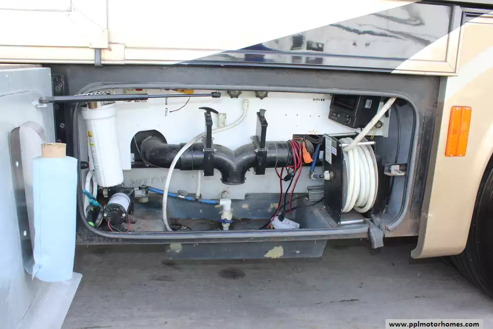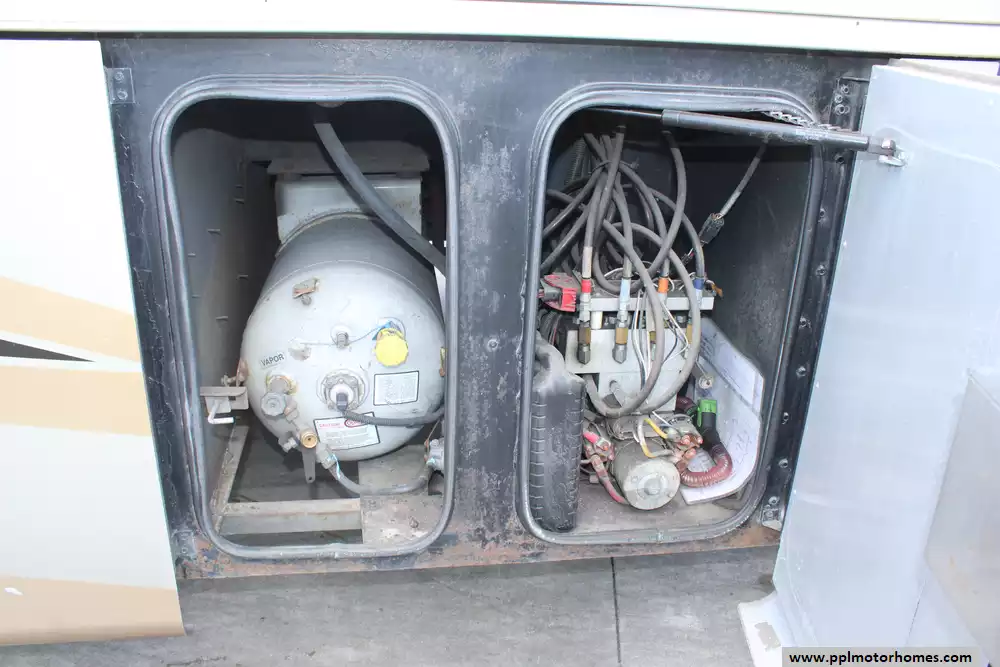 Specs: Length: 40.5 ft., Width: 8.41 ft., Height: 12.7 ft., Interior Height: 7 ft., Interior Width: 8 ft., Fuel Capacity: 100 gal., Total Fresh Water Tank Capacity: 90 gal., Total Gray Water Tank Capacity: 66 gal., Total Black Water Tank Capacity: 50 gal., Total Propane Tank Capacity: 35.7 gal.