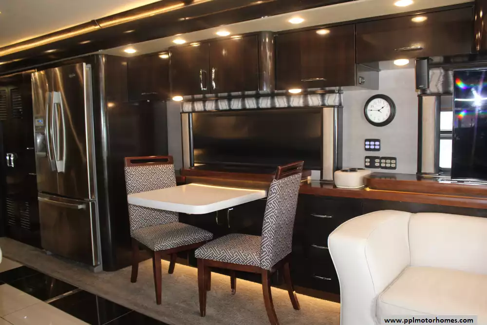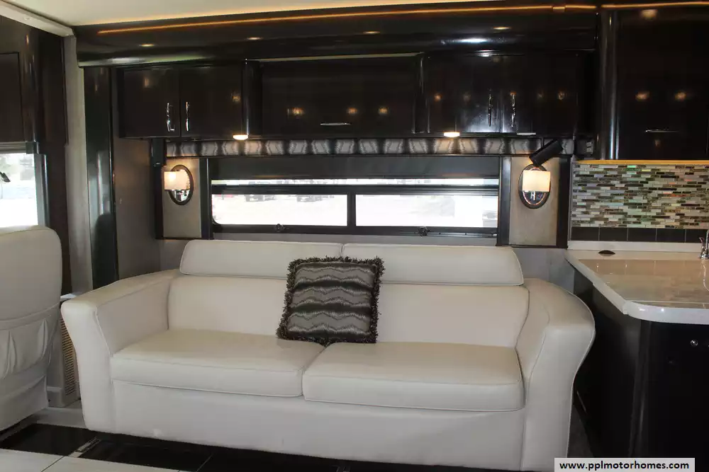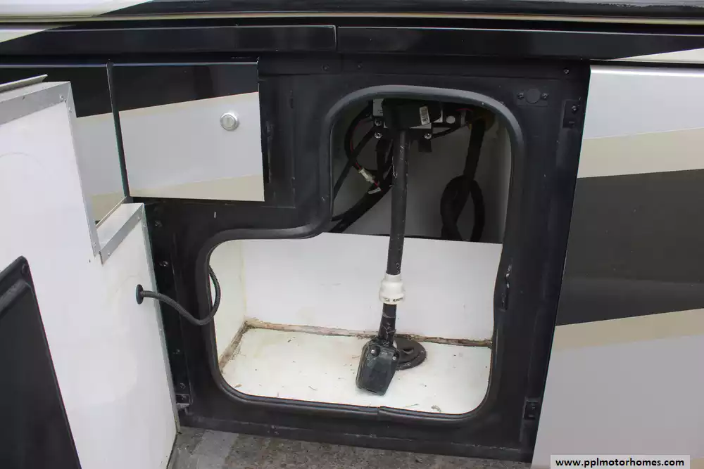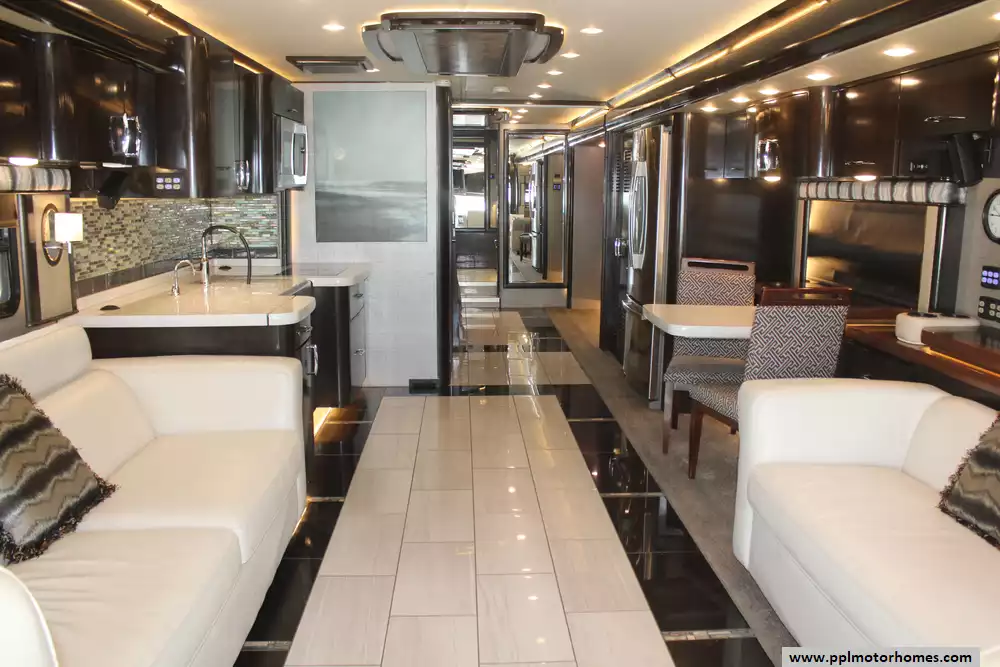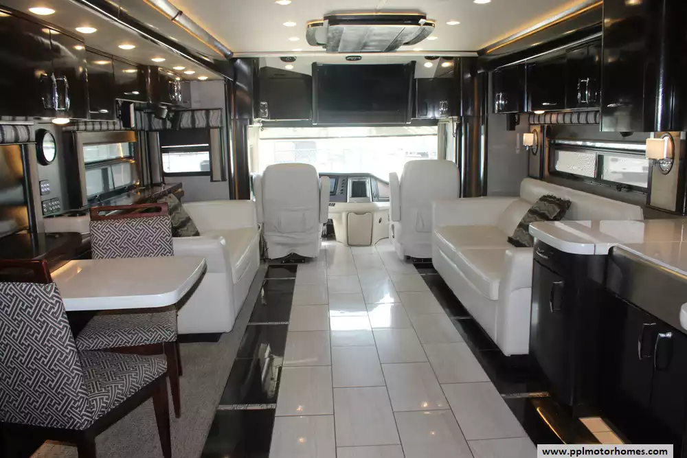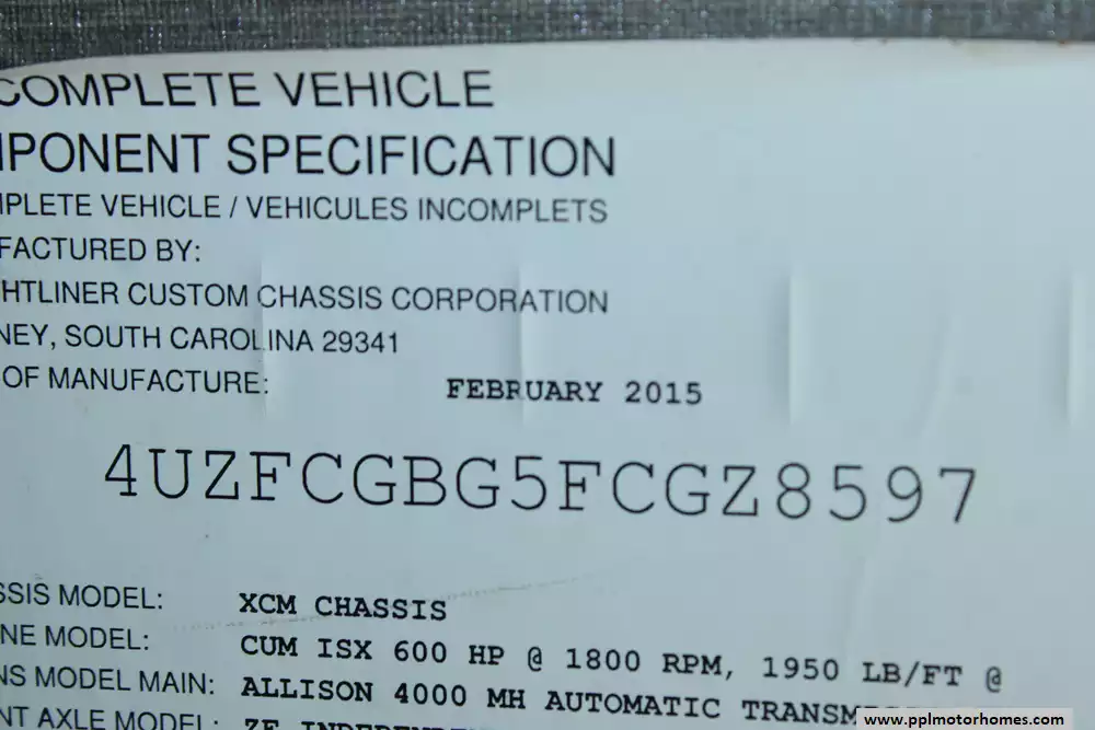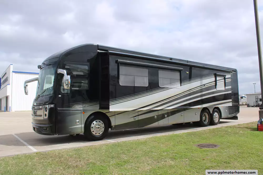 Specs: Length: 44.11 ft., Height: 12.11 ft., Width: 8.5 ft., Interior Height: 7 ft., Interior Width: 8 ft., Fuel Capacity: 150 gal., Total Fresh Water Tank Capacity: 100 gal., Total Gray Water Tank Capacity: 60 gal., Total Black Water Tank Capacity: 40 gal.