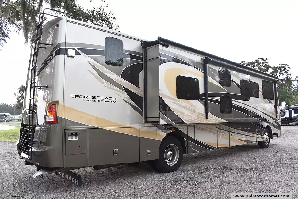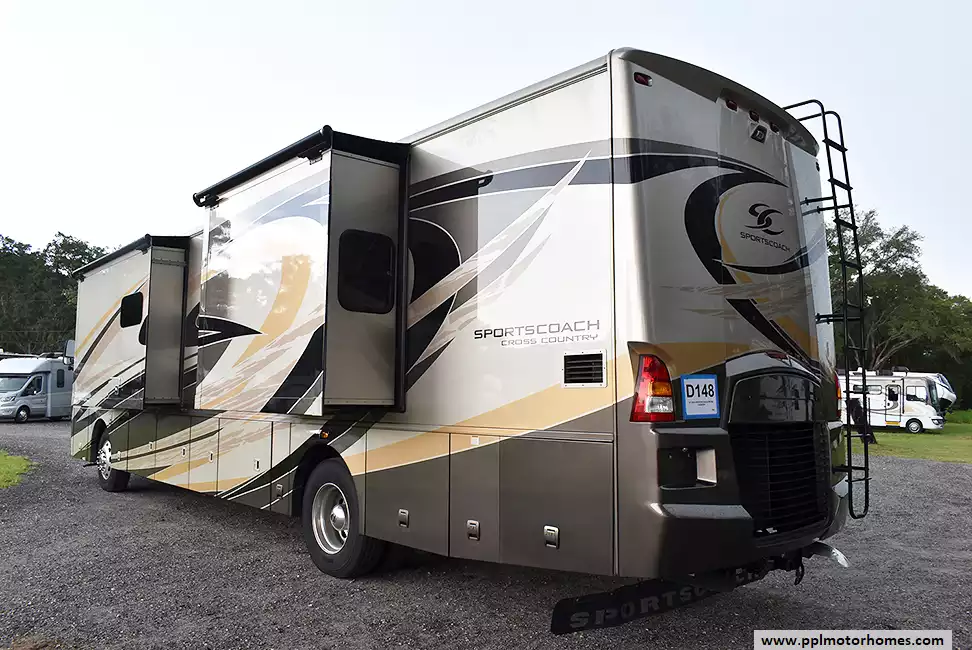 This 2016 Sportscoach Cross Country 407FW has a 340hp 6.7 Cummins Engine, Air Bag Suspension, Exhaust Brake, 3 Slide-outs, Onan Diesel Generator, 2 Ducted Air Conditioners, Levelers, Residential Frigidaire Refrigerator, In-Fridge Ice Maker, Automatic Main Awning And Window/Slide/Door Awnings, Washer/Dryer, Backup Camera, GPS System, Outside Entertainment System, 6 TVs, Outside Shower, Fireplace, Convection Microwave, 2 Burner Range