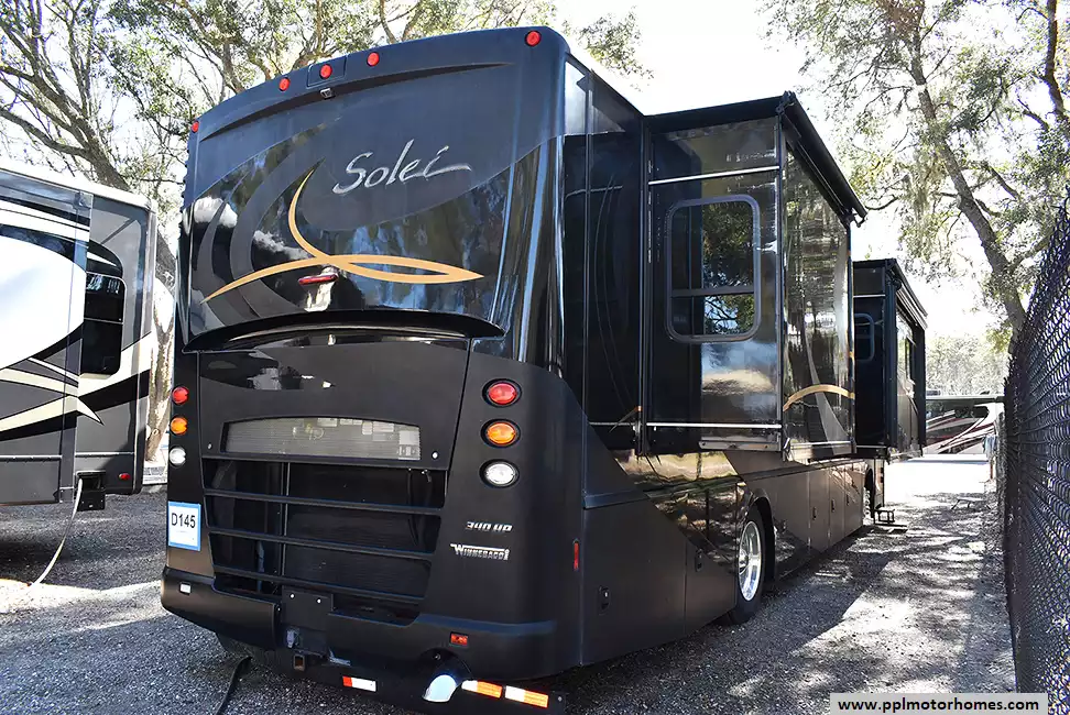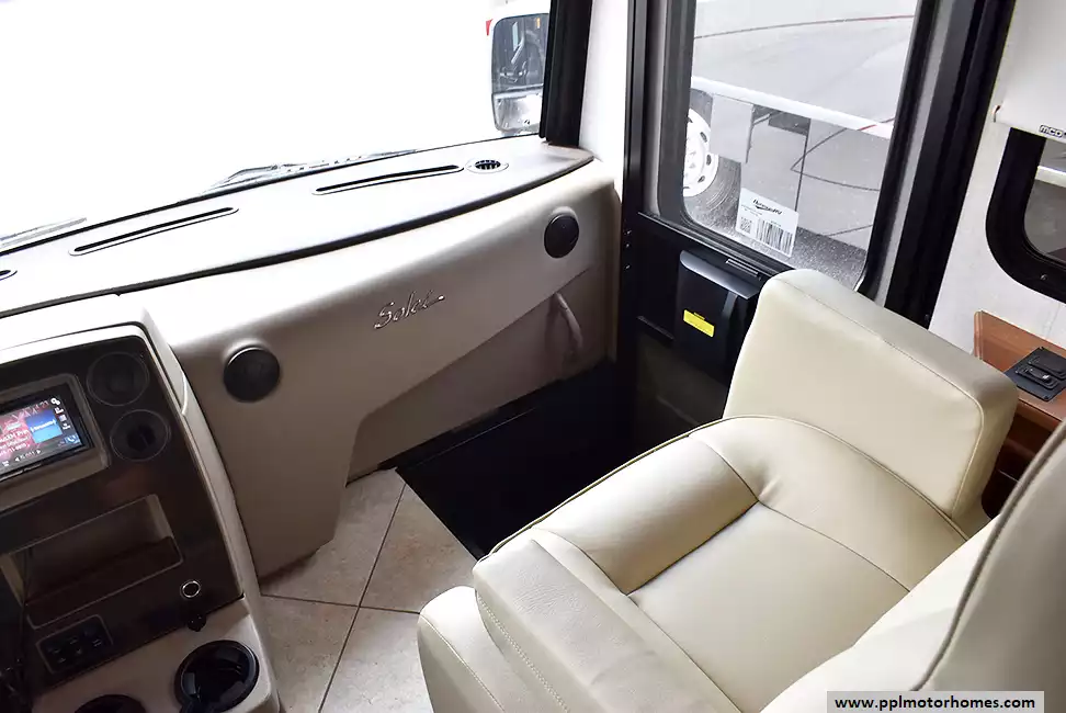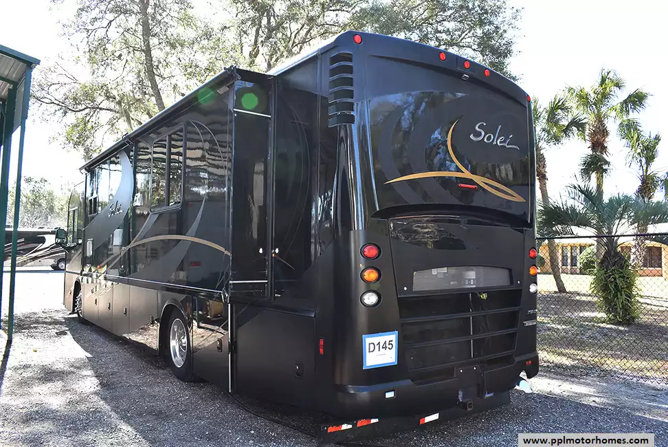 This 2016 Solei 36G has a 340hp I-6 6.7l Cummins Engine On a Freightliner Chassis, Air Bag Suspension, Exhaust Brake, 3 Slide-outs, Onan Diesel Generator, 2 Ducted Air Conditioners, Levelers, Double Door Residential Samsung Refrigerator, Automatic Main Awning And Window/Slide/Door Awnings, Washer/Dryer, Backup Camera, Satellite Dish, Outside Entertainment System, 2 TVs, Outside Shower, Fireplace, Convection Microwave, 3 Burner Range