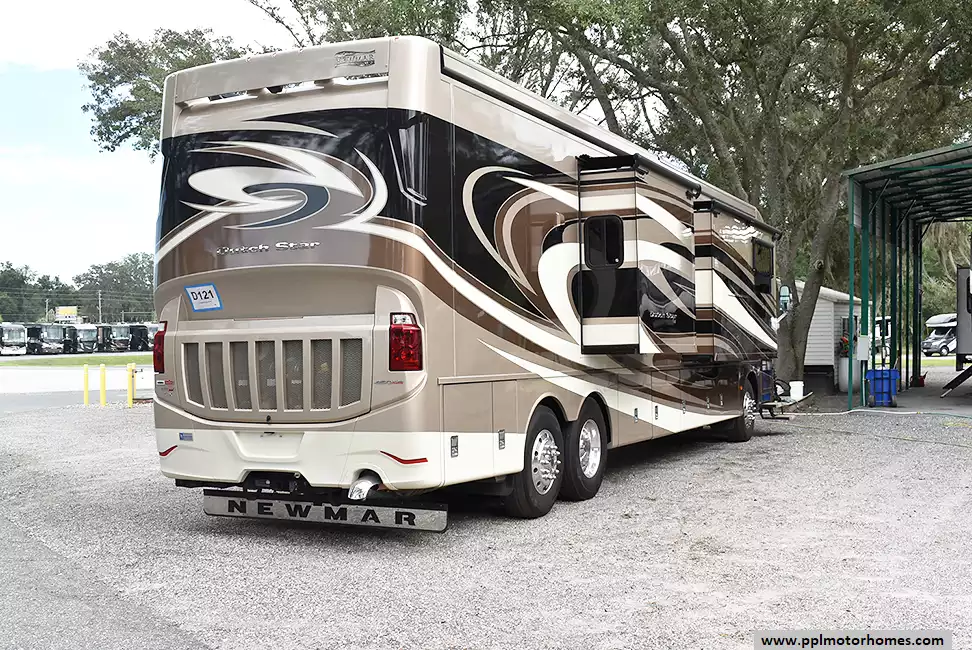 Inside, the spacious floor plan boasts elegant finishes, premium furniture, and a fully equipped gourmet kitchen. The large master suite includes a luxurious bath with dual vanities and a roomy shower. Built on Newmar's renowned chassis with Comfort Drive steering, this coach delivers a smooth, confident ride wherever your travels take you.