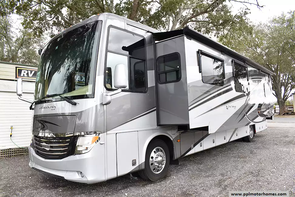 This 2016 Ventana 4037 has a 360hp 8.9 Cummins Engine On a Freightliner Chassis, Air Ride Suspension, Exhaust Brake, 3 Slide-outs, Onan Diesel Generator, 2 Ducted Air Conditioners, Levelers, Residential Whirlpool Refrigerator, In-Fridge Ice Maker, Automatic Main Awning, Washer/Dryer, Backup Camera, Solar Panel, Satellite Dish, 3 TVs, 2 DVD Players, Outside Shower, Convection Microwave, 3 Burner Range
