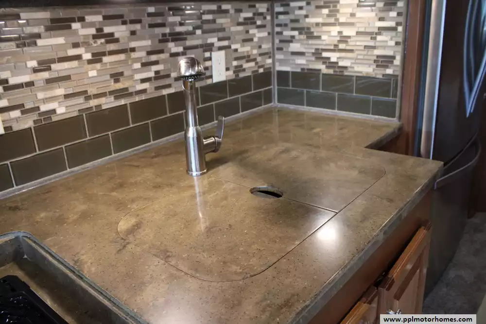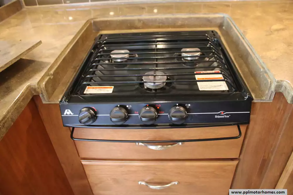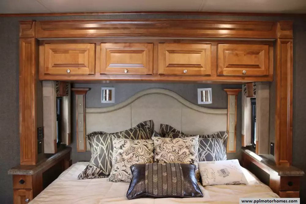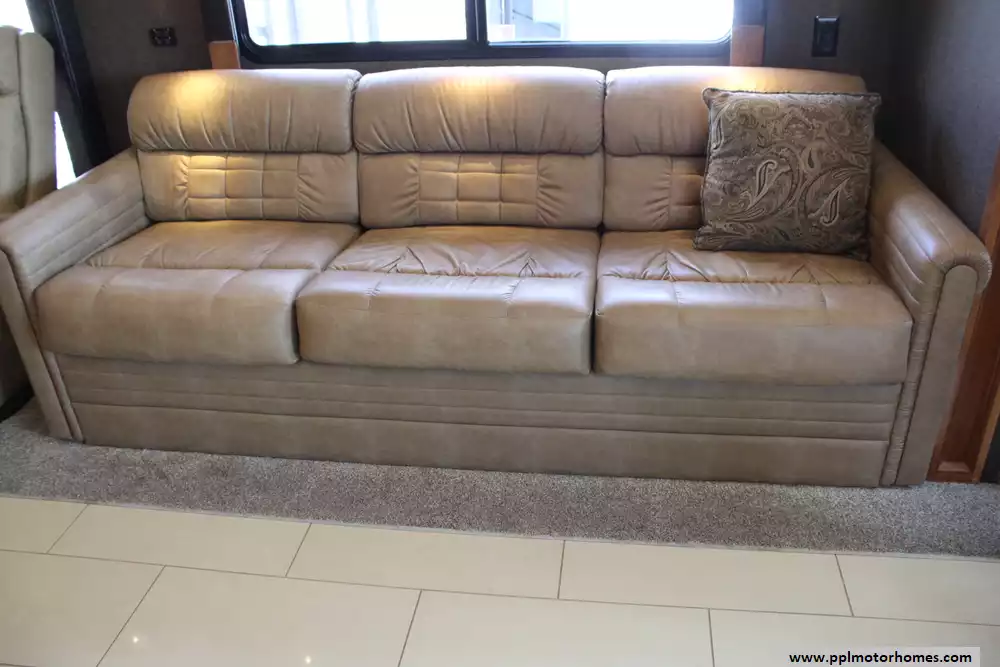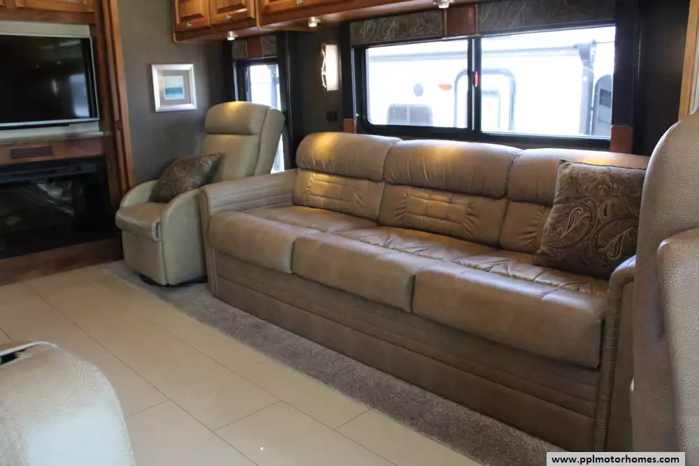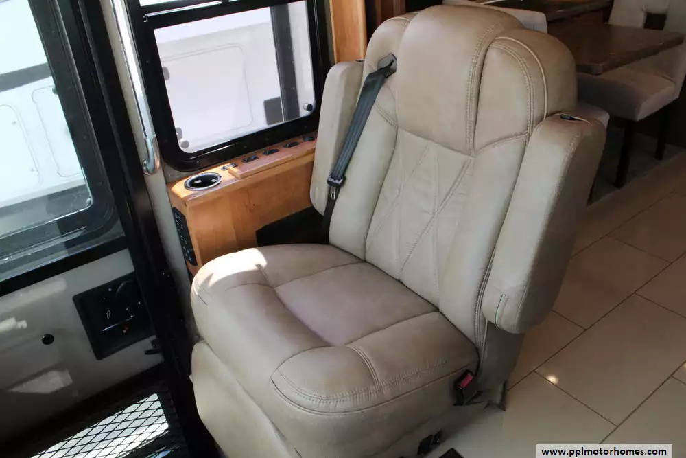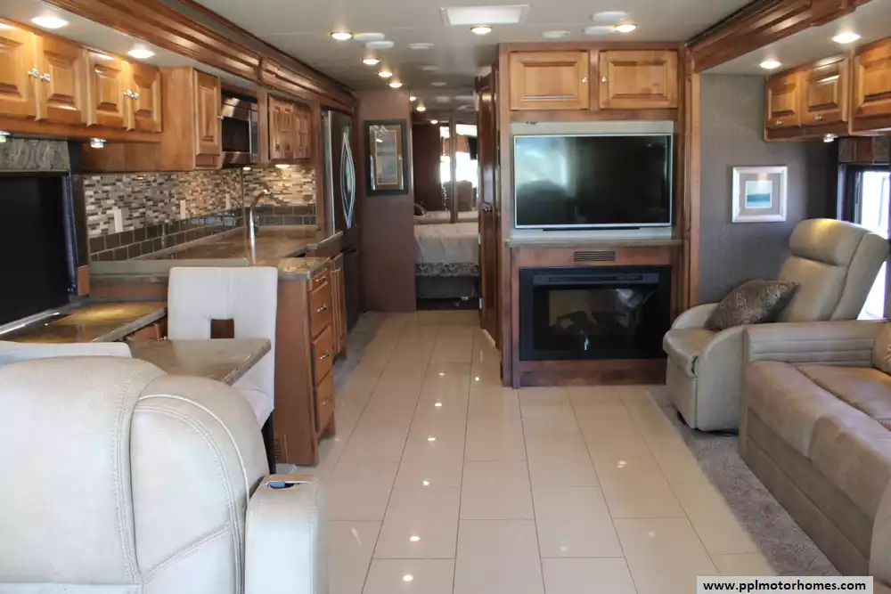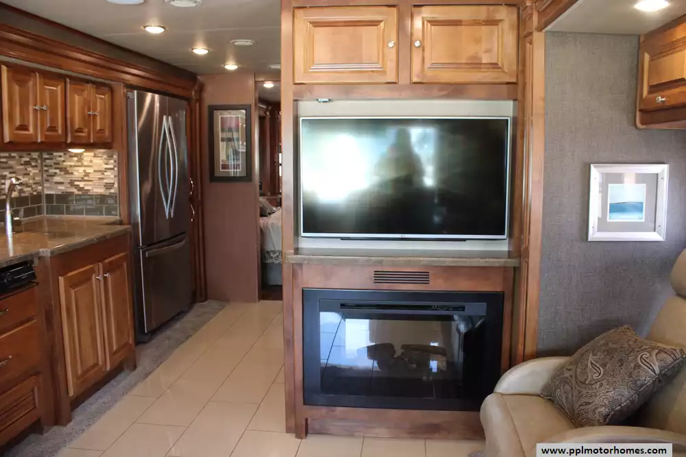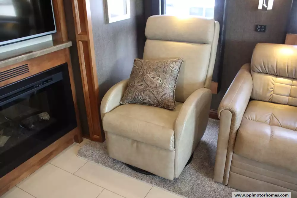 Inside, the 37PA features four slide-outs that create an open living space with upscale finishes such as custom wood cabinetry, tile in common areas, Luxury Vinyl Plank flooring in bedroom; plus residential-style furnishings, including upgraded sofa and captain chairs, recliner, fireplace, credenza computer and printer workstation, multiple LED TVs connected to a BluRay DVD player and DISH satellite TV receiver with upgraded Winegard Trav'ler antennae; Winegard WiFi extender, and WeBoost cell phone signal booster. .