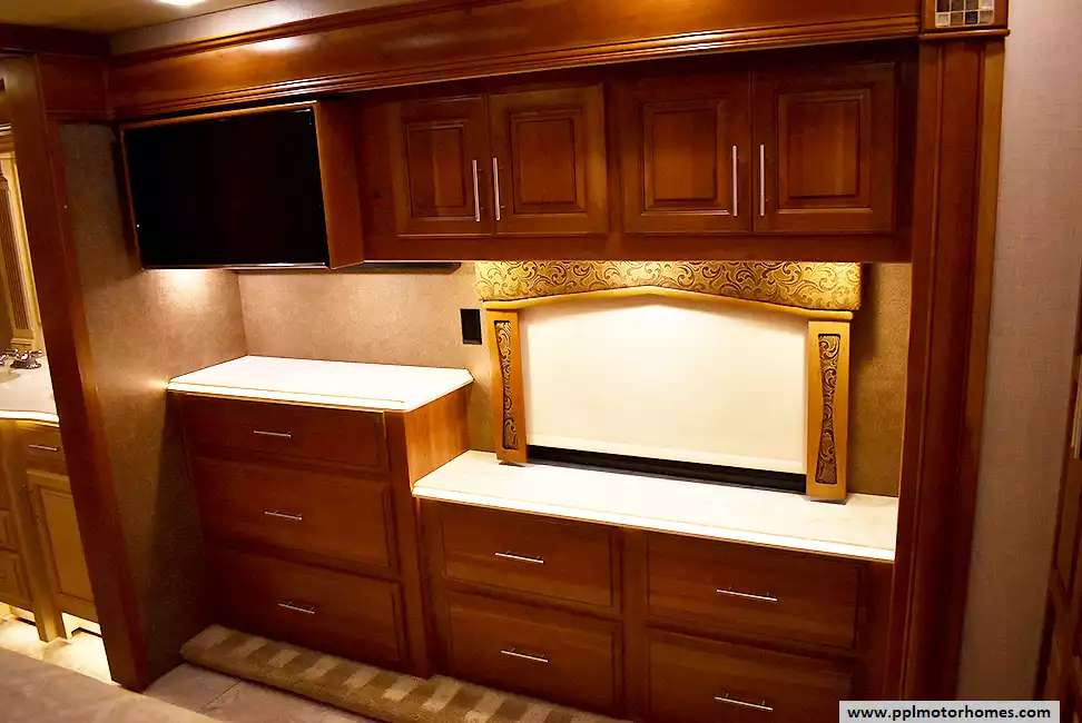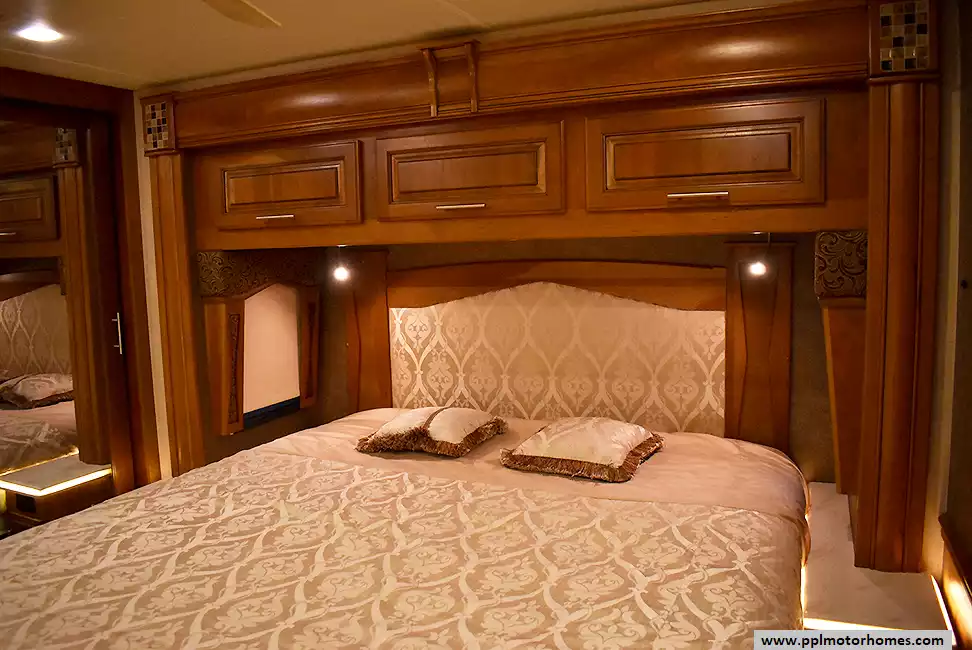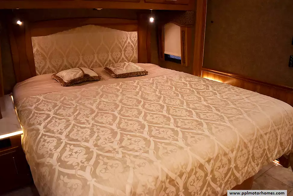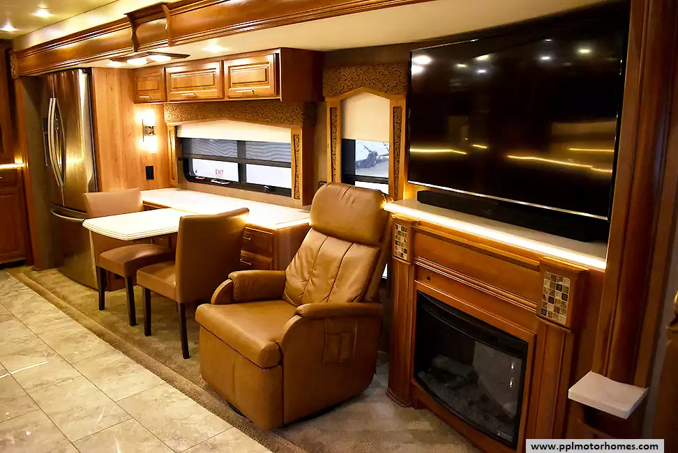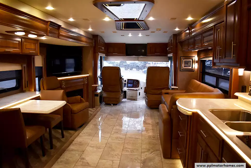 Inside, the 42DEQ floorplan delivers a true residential experience with high-end finishes and modern conveniences throughout. The gourmet-ready kitchen features a 2-burner range, convection microwave, and a residential Samsung refrigerator with an in-fridge ice maker. You can relax by the fireplace in the living area or enjoy your favorite shows on one of the four TVs, supported by a satellite receiver and a dedicated outside entertainment system for evenings under the stars. This all-season coach is meticulously equipped with three ducted air conditioners, heated tanks for cold-weather reliability, and a powerful Onan diesel generator. Complete with a washer/dryer, outside shower, and a durable fiberglass body and roof, this Aspire is a professional-grade motorhome designed for those who refuse to compromise on quality or comfort.