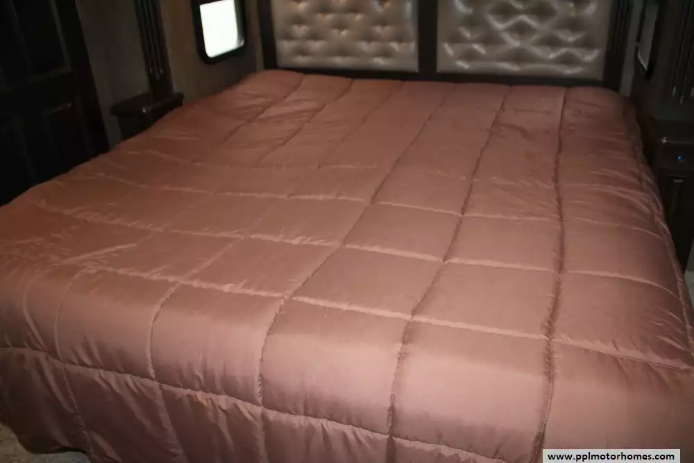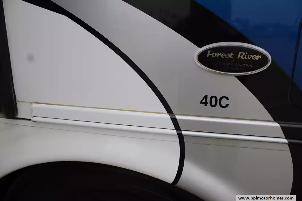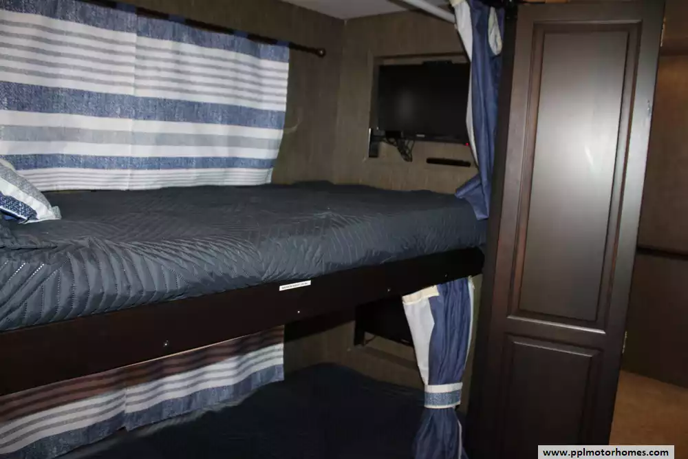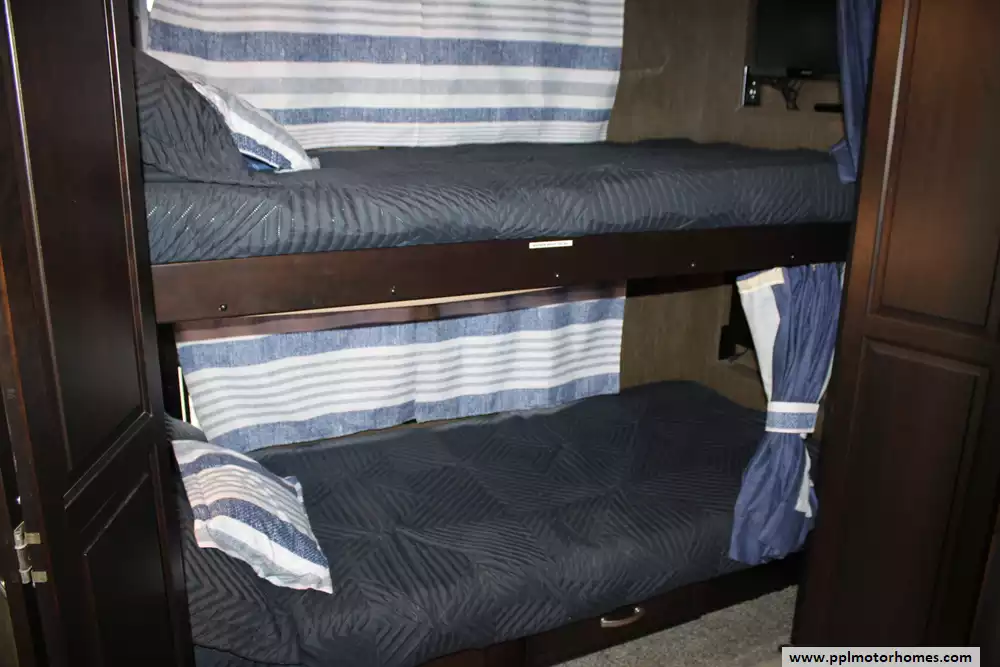 The 2017 Forest River Berkshire XL 40C is a luxury Class A diesel motorhome built on a robust Freightliner XCR raised-rail chassis with a Cummins 380 HP turbo diesel engine and Allison automatic transmission, designed for comfortable long-distance travel and family living. This three-slide floorplan features a spacious bunkhouse configuration with a full rear bath (including a shower and stacking washer/dryer), a half bath, and a generous master bedroom with a king bed, wardrobe, dresser, and TV. With a large fresh water tank (103 gal), abundant storage, and exterior amenities like full body paint, rear/side cameras, awnings, and entertainment center, it delivers both practicality and home-like comforts for extended trips.