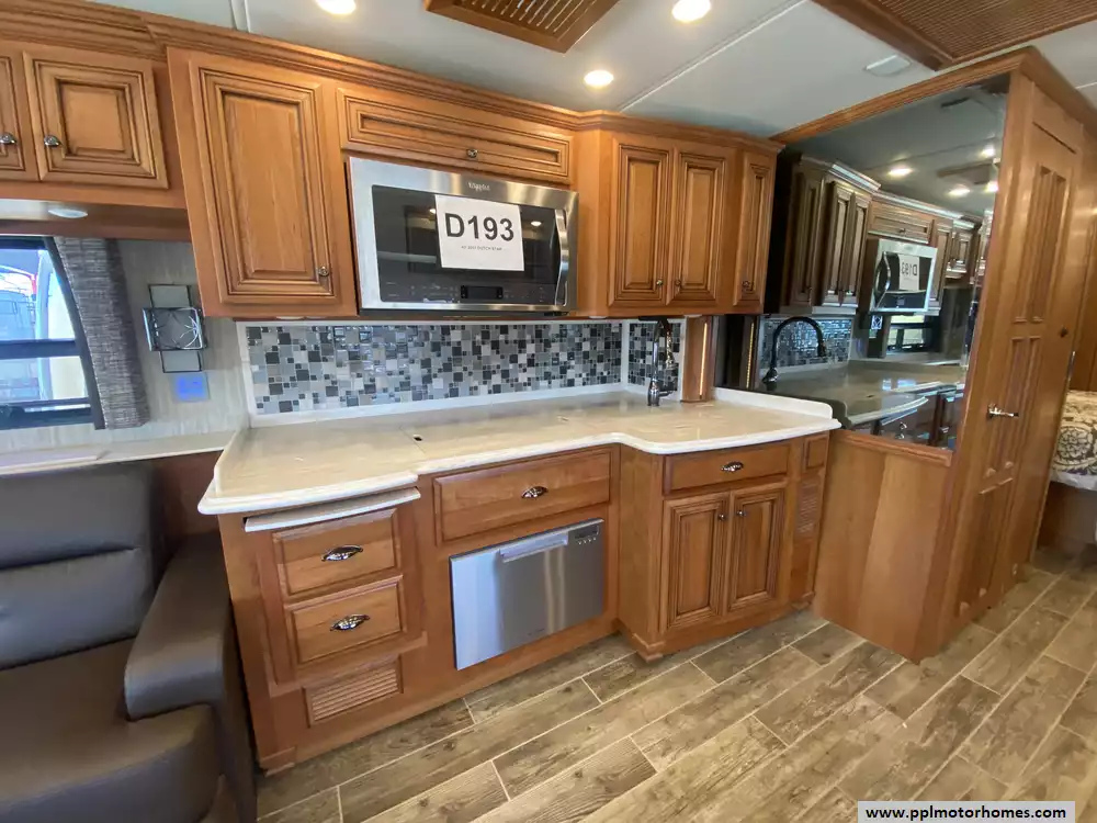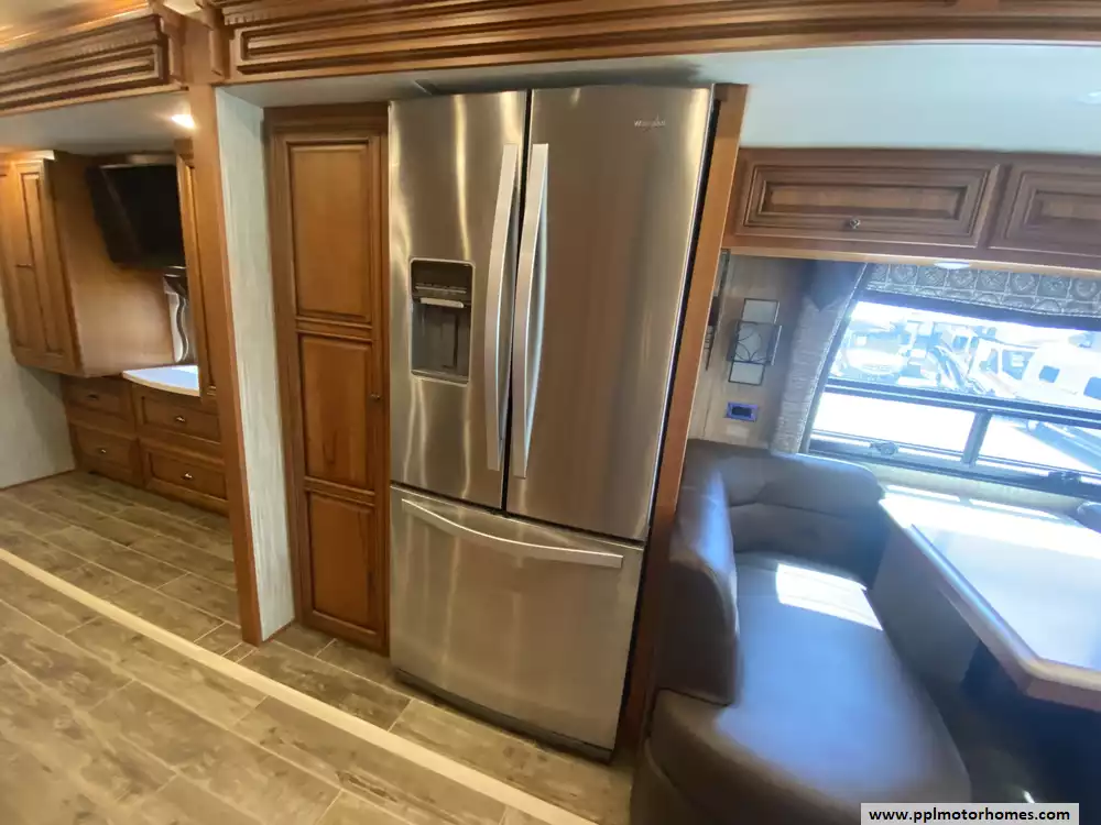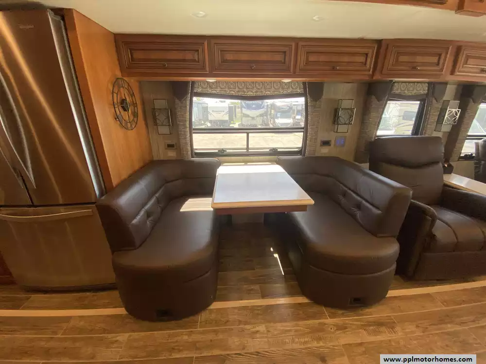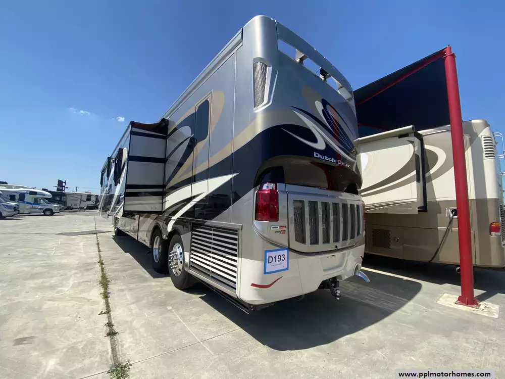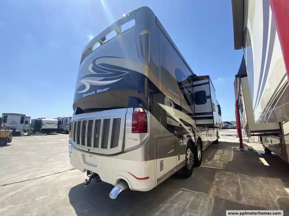 This 2017 Dutch Star by Newmar 4369 has a 450hp 8.9l I-6 Cummins Engine On a Freightliner Chassis, Air Bag Suspension, Exhaust Brake, 3 Slide-outs, Onan Diesel Generator, 3 Ducted Air Conditioners, Levelers, Side by Side Residential Whirlpool Refrigerator (Additional Refrigerator Present), In-Fridge Ice Maker, Automatic Main Awning And Window/Door Awnings, Washer/Dryer, Backup Camera and Side Cmaeras, GPS System, Solar Panel, Heated Tanks, Satellite Dish, Outside Entertainment System with TV, 3 TVs, Satellite Radio, Outside Shower, Convection Microwave, 2 Burner Range Induction