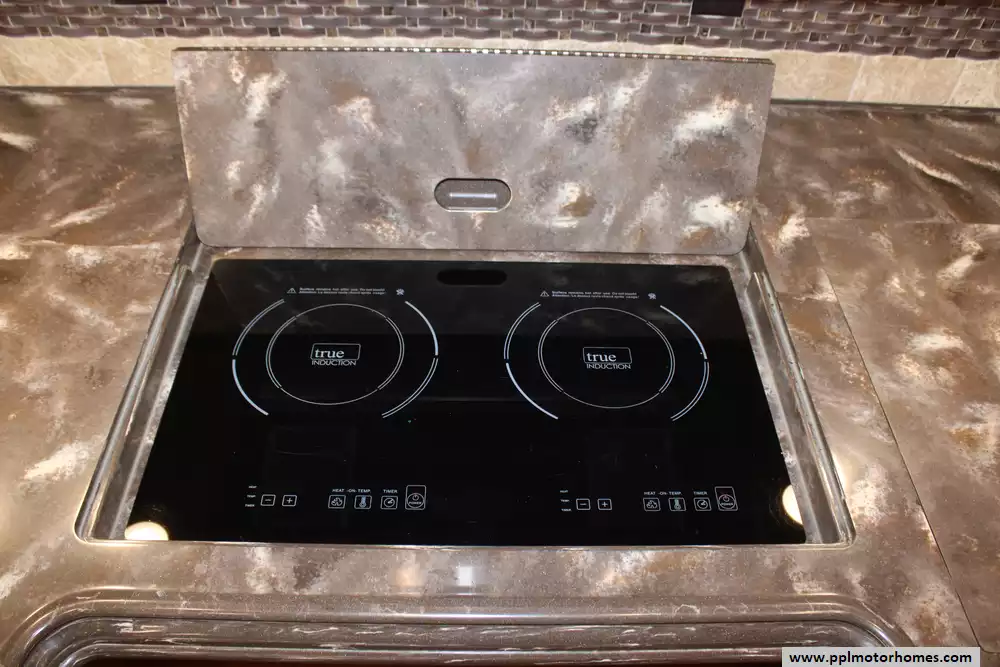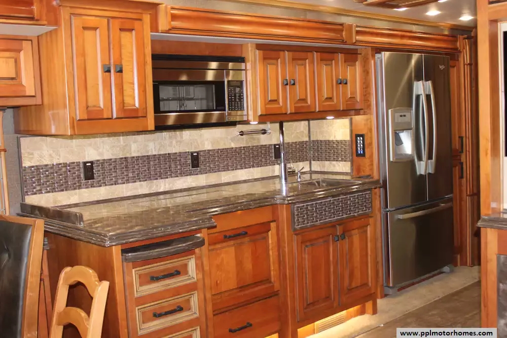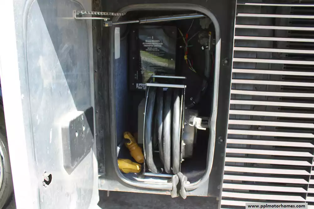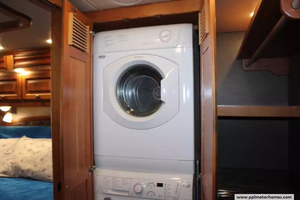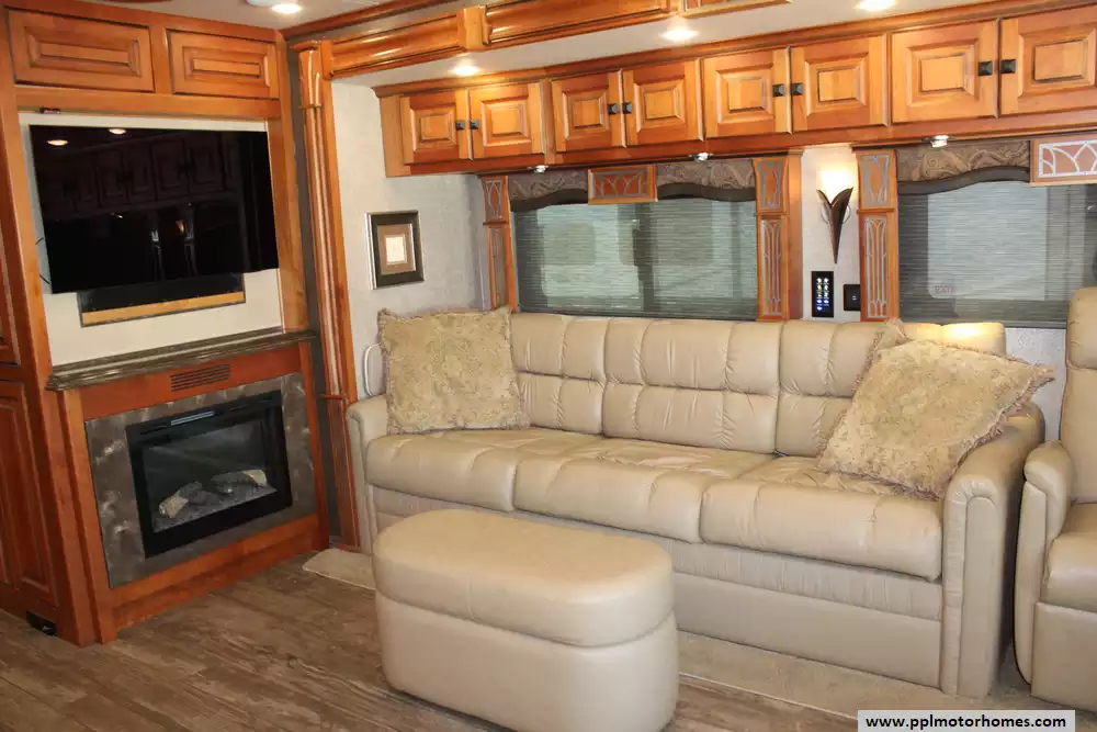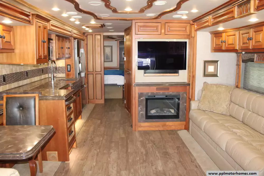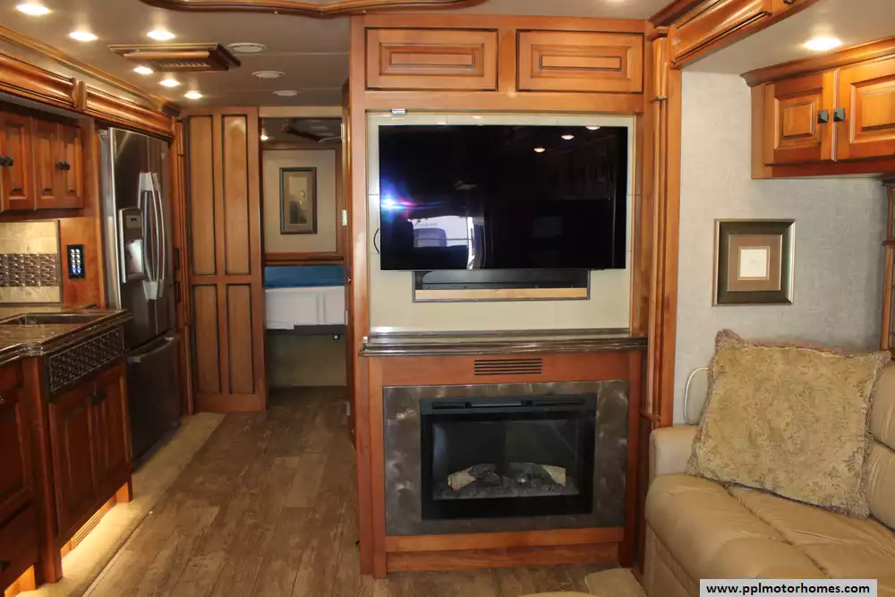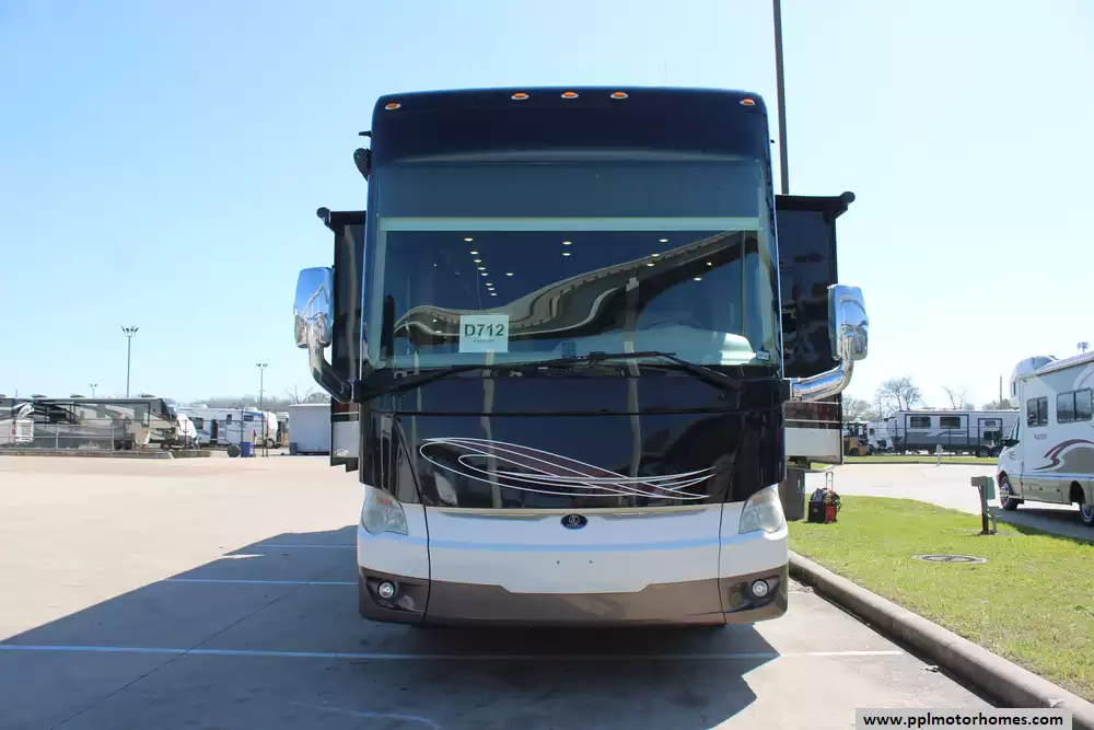 The 40AP floor plan is a favorite among enthusiasts for its thoughtful organization and premium amenities. The chef-ready kitchen is equipped with a two-burner range, convection microwave, dishwasher, and an 110v residential Whirlpool refrigerator featuring an in-fridge ice maker and a second additional refrigerator for extra storage. Entertainment is effortless with four TVs, a satellite dish, a DVD player, and a dedicated outside entertainment system for evenings under the automatic main awning. Practical features like the central vacuum, washer/dryer, and outside shower make life on the road seamless, while the backup camera and GPS system provide peace of mind during every mile of your journey.