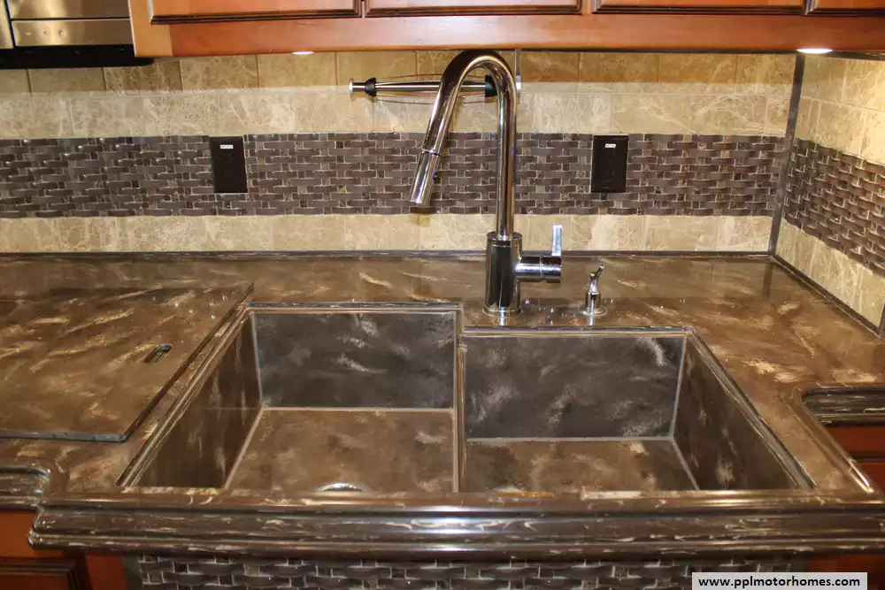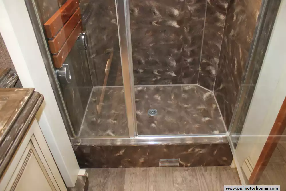 Specs: Length: 40.11 ft., Width: 8.41 ft., Height: 12.7 ft., Interior Height: 7 ft., Interior Width: 8 ft., Fuel Capacity: 150 gal., Total Fresh Water Tank Capacity: 90 gal., Total Gray Water Tank Capacity: 70 gal., Total Black Water Tank Capacity: 50 gal.