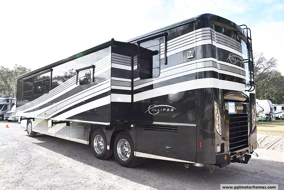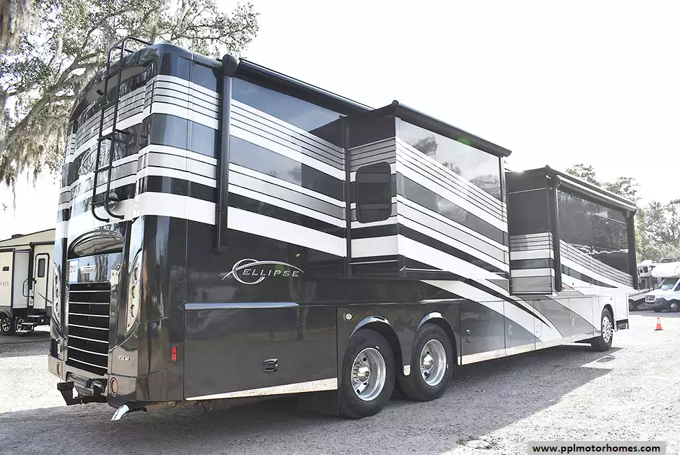 This 2017 Ellipse 42QD has a 450hp 8.9 Cummins Engine On a Freightliner Chassis, Air Ride Suspension, Exhaust Brake, 3 Slide-outs, Onan Diesel Generator, 3 Ducted Air Conditioners, Levelers, Residential Samsung Refrigerator, In-Fridge Ice Maker, Automatic Main Awning And Window/Slide/Door Awnings, Washer/Dryer, Backup Camera, Solar Panel, Dishwasher, Heated Tanks, Satellite Receiver, Outside Entertainment System, 3 TVs, 2 DVD Players, Outside Shower, Fireplace, Convection Microwave, 3 Burner Range