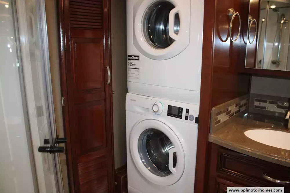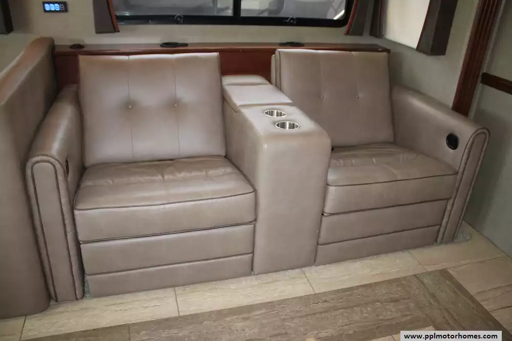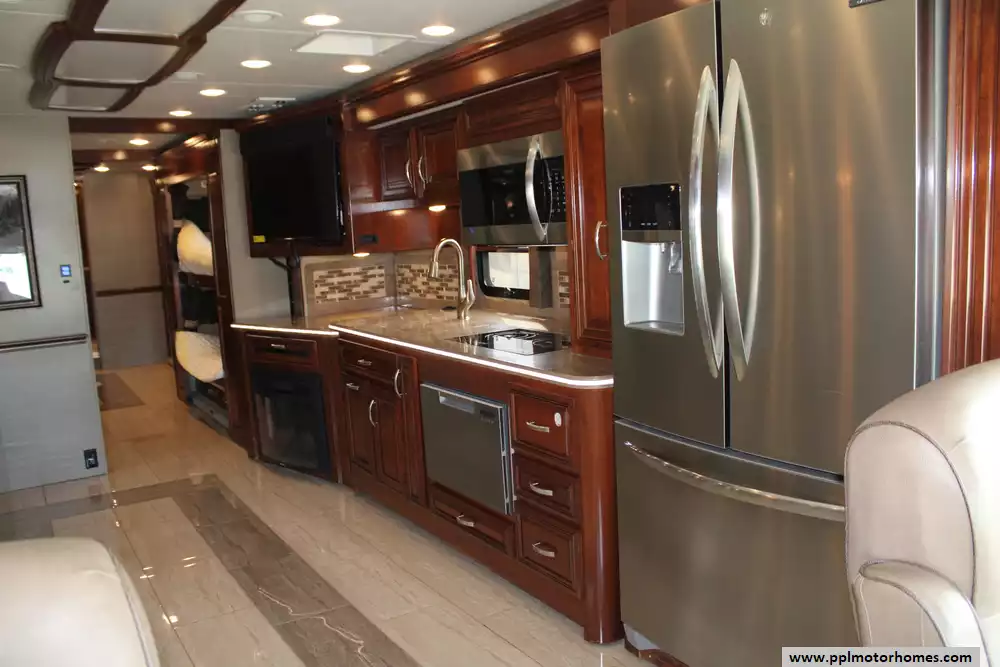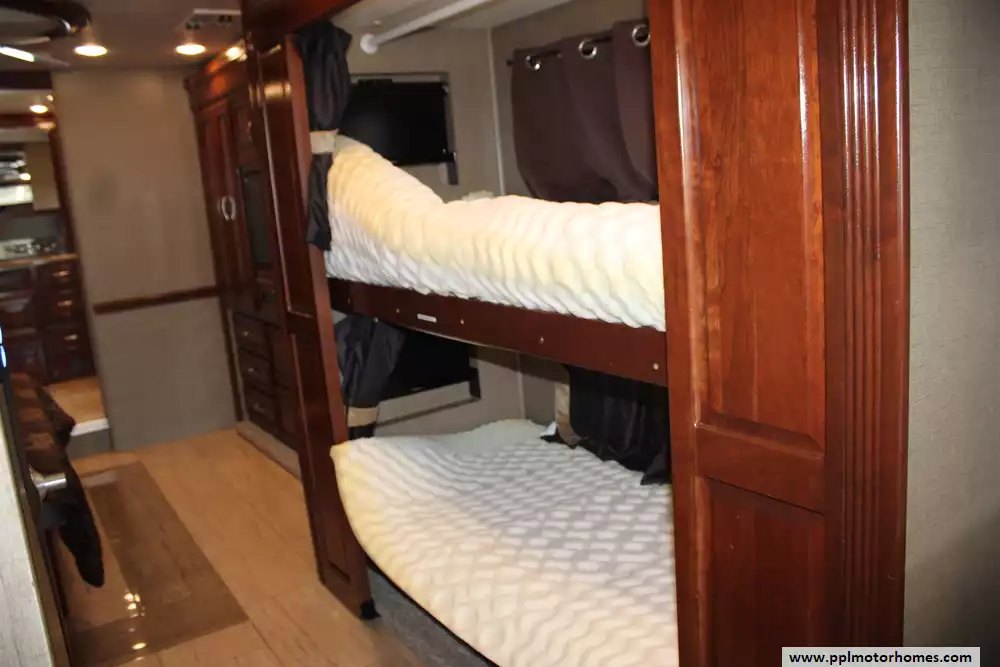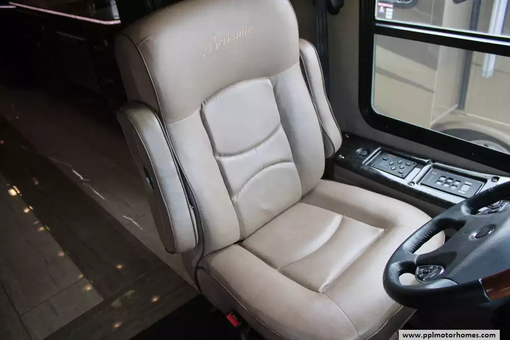 Featuring four slide-outs, a bunkhouse layout, and sleeping capacity for up to six people, it offers an expansive residential-style interior that includes a king-size master suite, mid-coach bunk beds, and two full bathrooms, one of which is a spacious rear bath with dual sinks and a large shower. The living area is equipped with premium furnishings, theater seats, convertible dinette, multiple TVs, fireplace, and high-end kitchen appliances, while upscale touches like heated tile floors, fully body paint, washer/dryer, and tankless water heater enhance comfort. With a 15,000-pound towing capacity, 150-gallon fuel tank, and ample storage, the Berkshire XLT 45A blends power, durability, and upscale amenities, making it ideal for extended trips or luxury RV living. Please note that this coach is currently in the process of having some repair work done on a compartment door from some minor road damage.