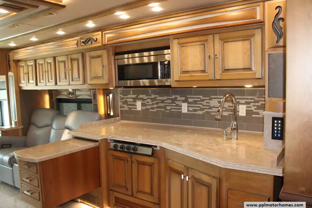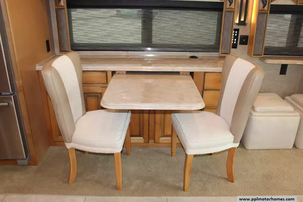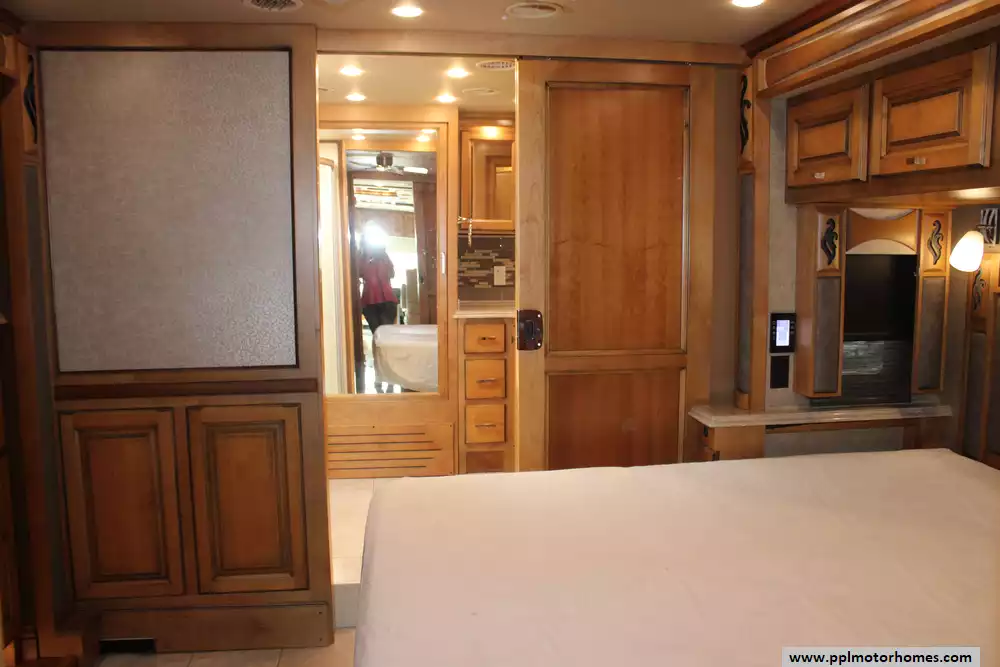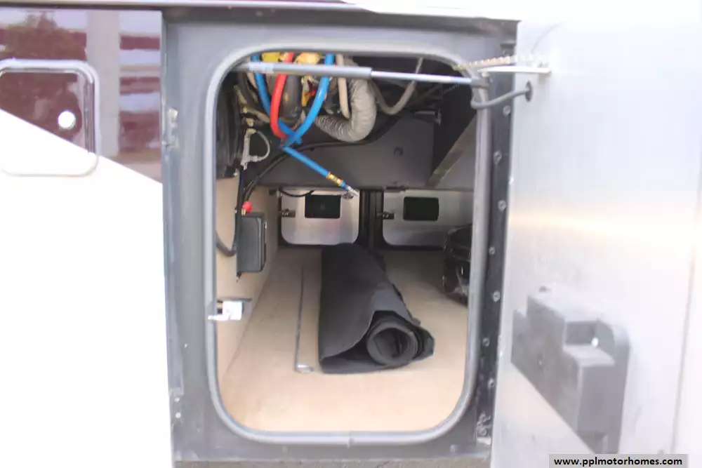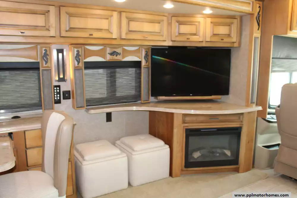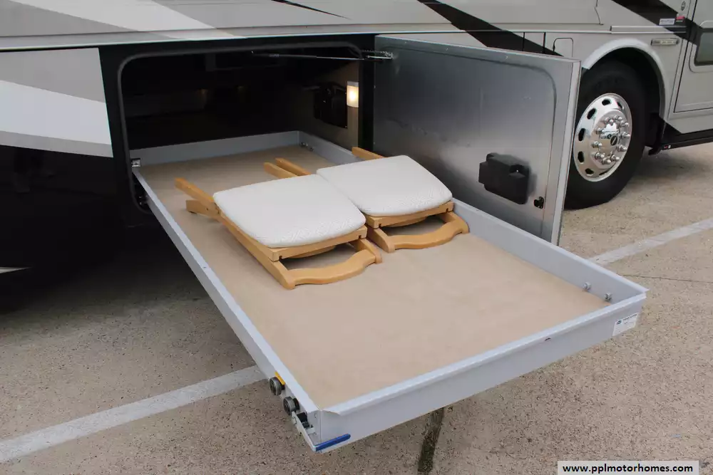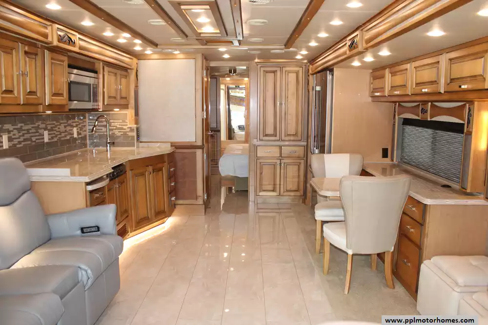 The four expansive slide-outs open to reveal a light-filled interior packed with home-like amenities, including a 110v residential Maytag refrigerator with an in-fridge ice maker, a convection microwave, and a 3-burner range. Maintenance is effortless with an integrated central vacuum system, while the on-board washer and dryer and three ducted air conditioners ensure you are fully prepared for long-term stays in any climate. Entertainment is at your fingertips with three interior TVs and a dedicated outside entertainment system, all supported by an Onan diesel generator for reliable power anywhere. From the automatic main, window, and door awnings to the convenience of a backup camera and leveling system, this Phaeton is engineered to provide a seamless and sophisticated lifestyle on the open road.