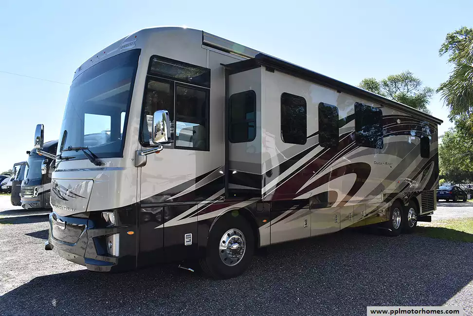 Experience luxury on the road with the 2019 Newmar Dutch Star 4018. Built on a Spartan K2 Chassis with a tag axle, this RV offers unparalleled stability and control. Its Sea Pearl interior and exterior, complemented by natural cherry cabinets, exude elegance.