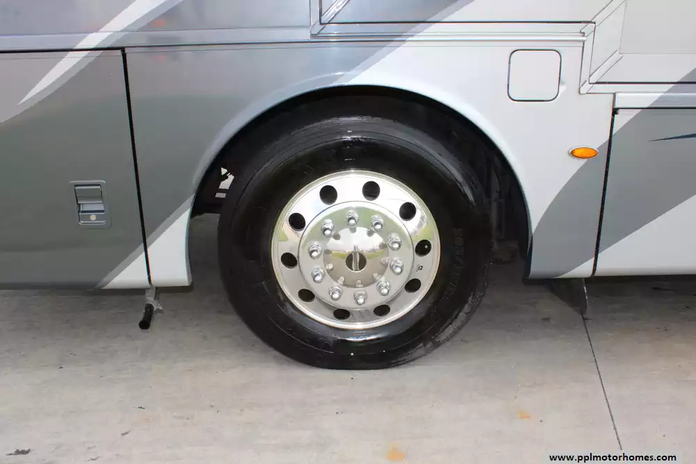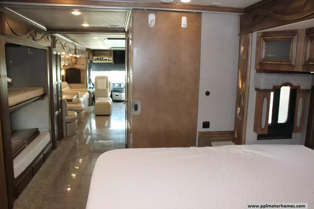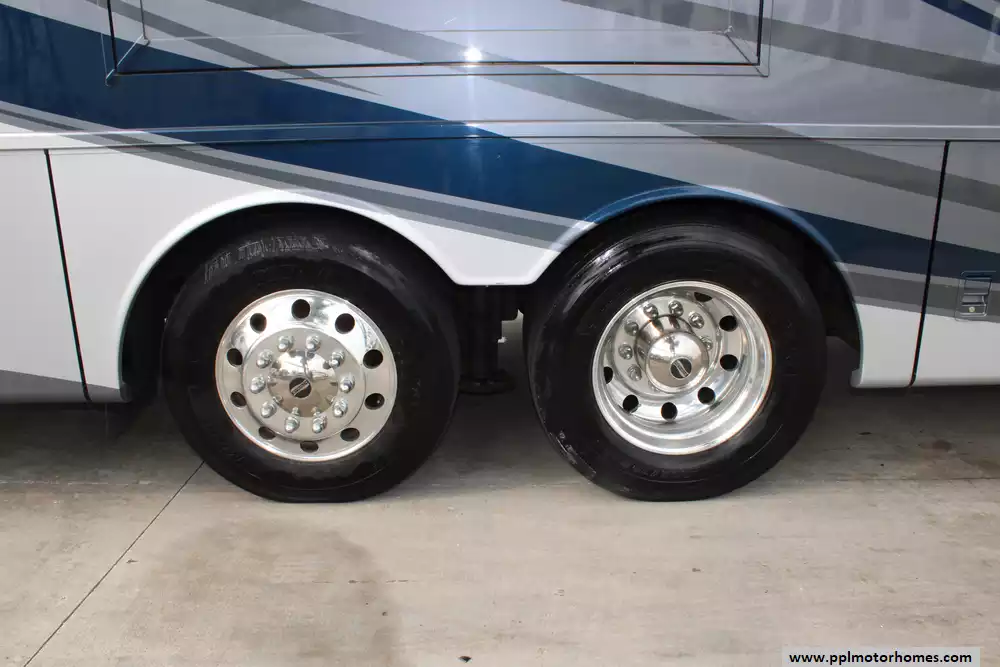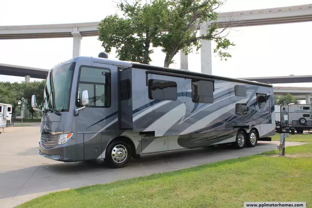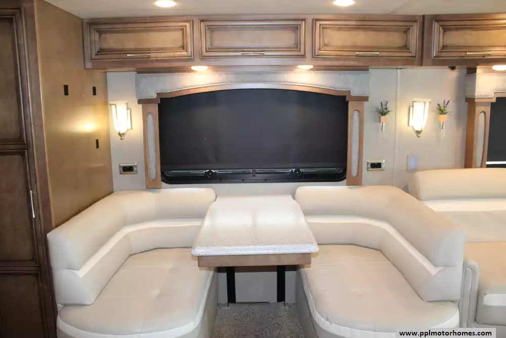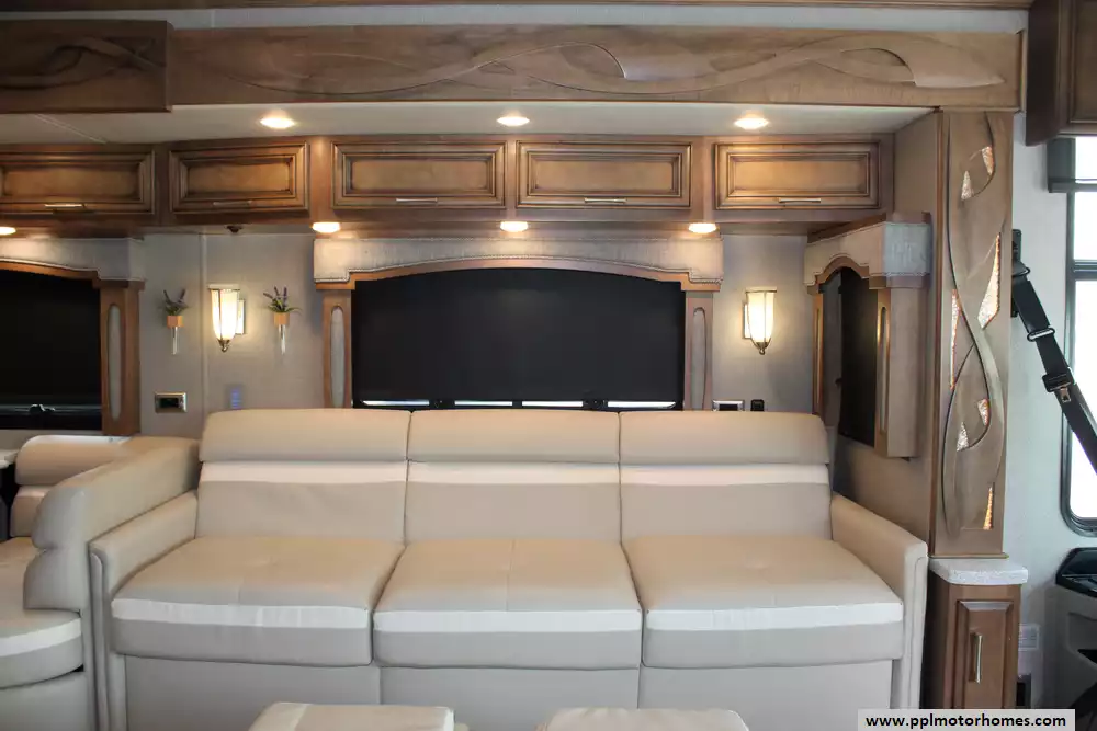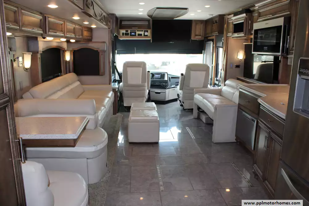 Specs: Length: 43.83 ft., Width: 8.46 ft., Height: 12.92 ft., Interior Height: 6.92 ft., Fuel Tank Capacity: 100 gal., Total Fresh Water Tank Capacity: 105 gal., Total Gray Water Tank Capacity: 65 gal., Total Black Water Tank Capacity: 45 gal., Total Number of Propane Tanks: 1, Total Propane Tank Capacity: 136 lbs.