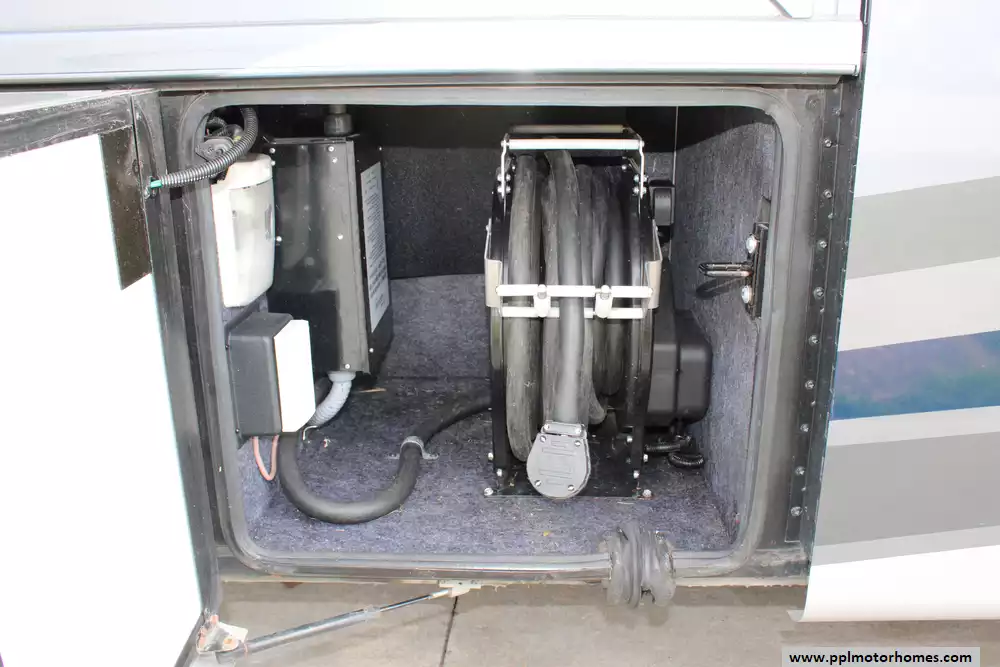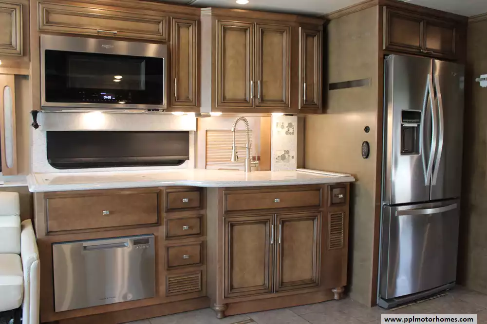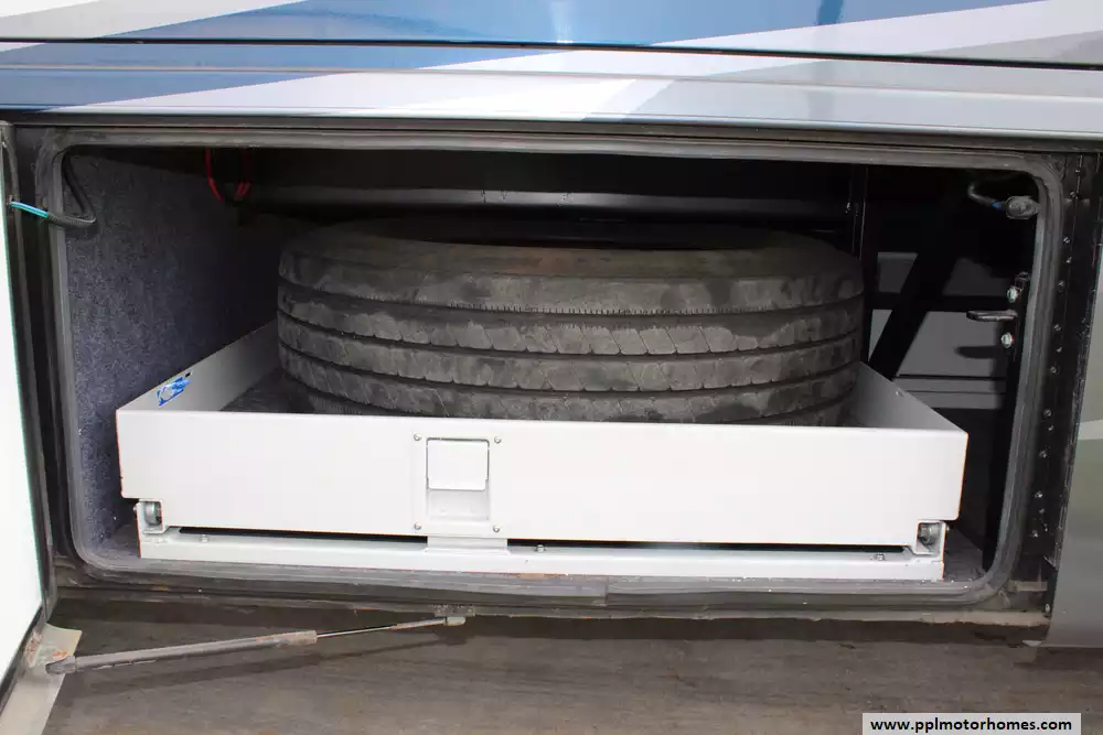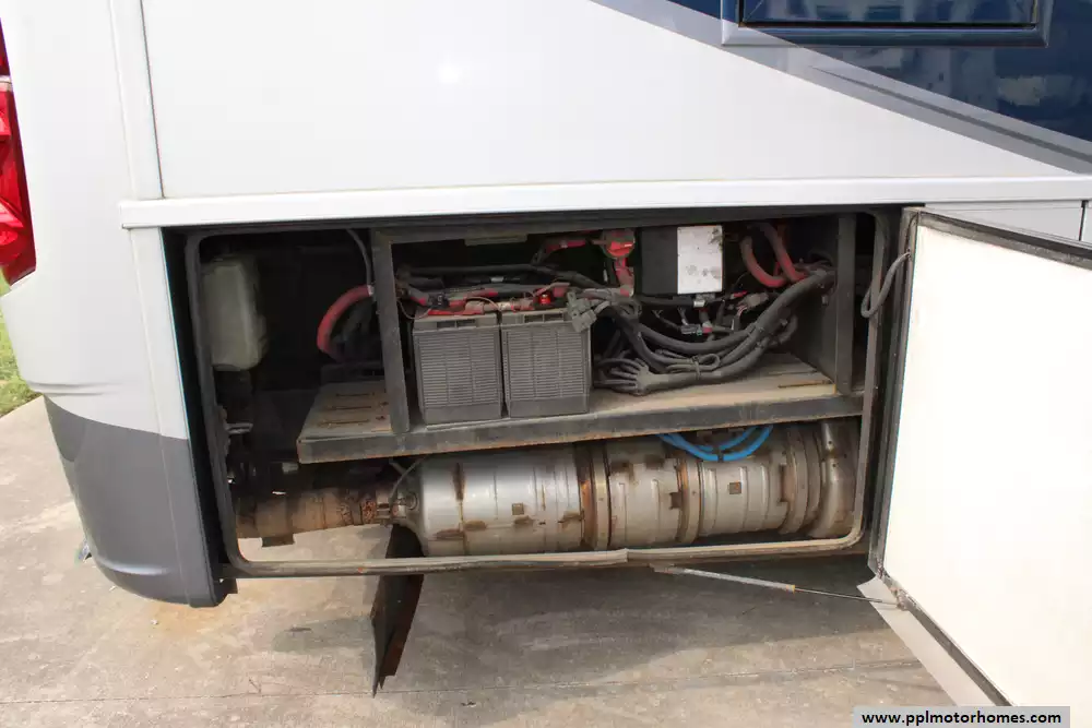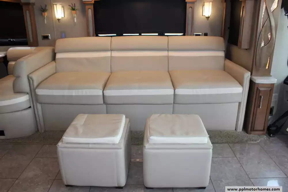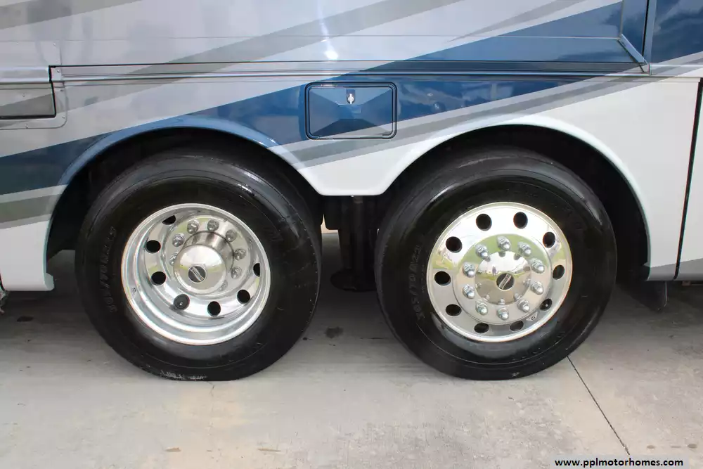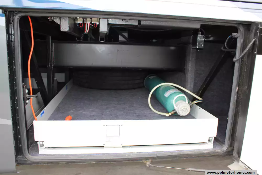 Specs: Length: 43.83 ft., Width: 8.46 ft., Height: 12.92 ft., Interior Height: 6.92 ft., Fuel Tank Capacity: 100 gal., Total Fresh Water Tank Capacity: 105 gal., Total Gray Water Tank Capacity: 65 gal., Total Black Water Tank Capacity: 45 gal., Total Number of Propane Tanks: 1, Total Propane Tank Capacity: 136 lbs.