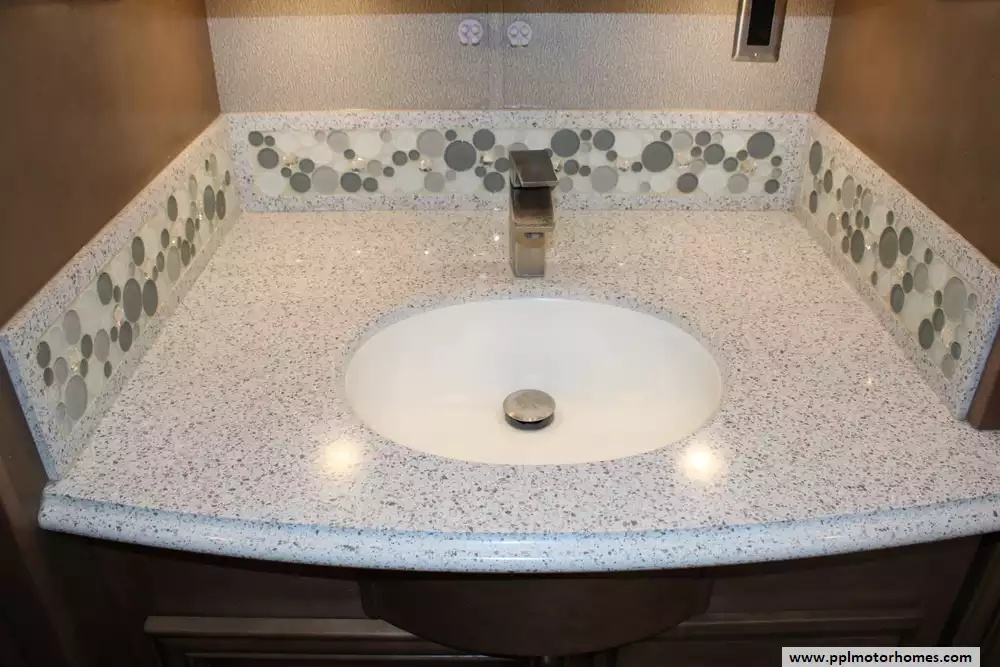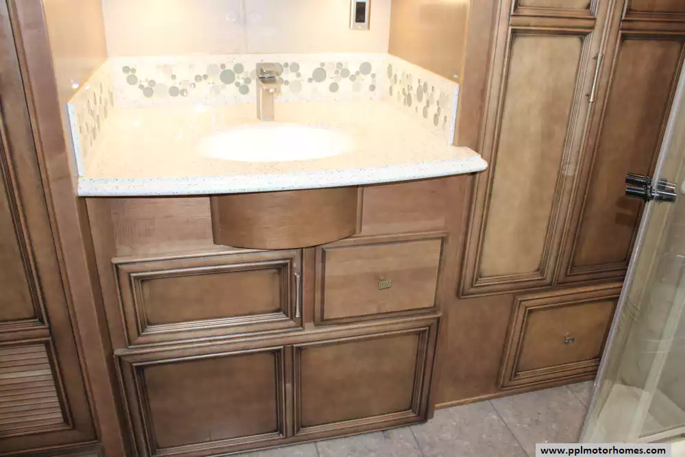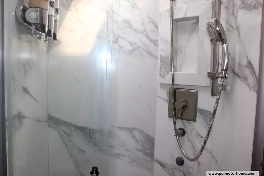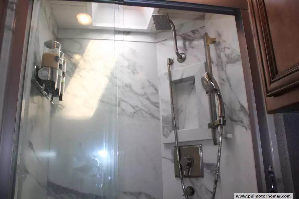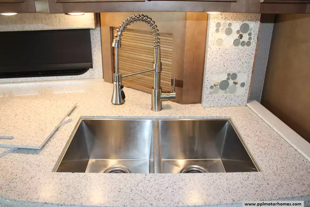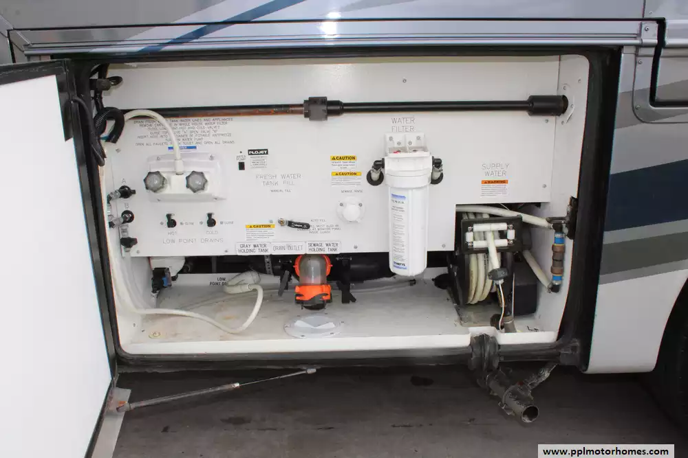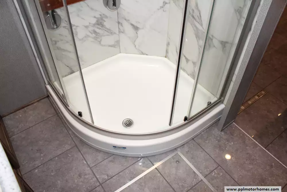 Specs: Length: 43.83 ft., Width: 8.46 ft., Height: 12.92 ft., Interior Height: 6.92 ft., Fuel Tank Capacity: 100 gal., Total Fresh Water Tank Capacity: 105 gal., Total Gray Water Tank Capacity: 65 gal., Total Black Water Tank Capacity: 45 gal., Total Number of Propane Tanks: 1, Total Propane Tank Capacity: 136 lbs.