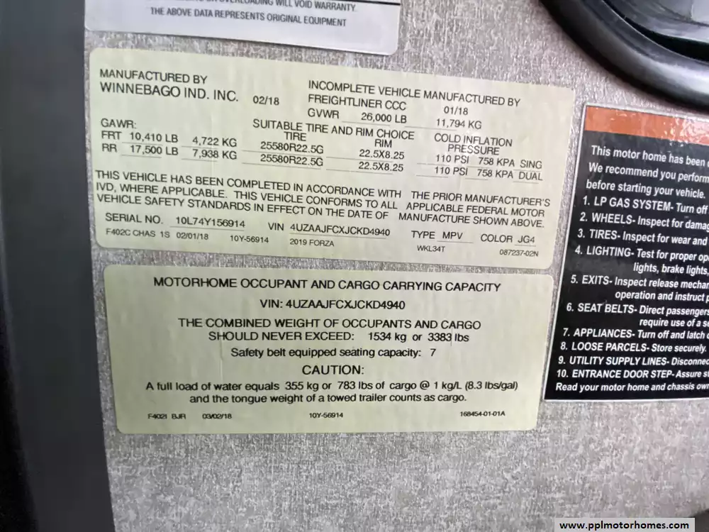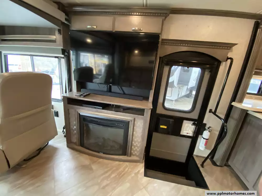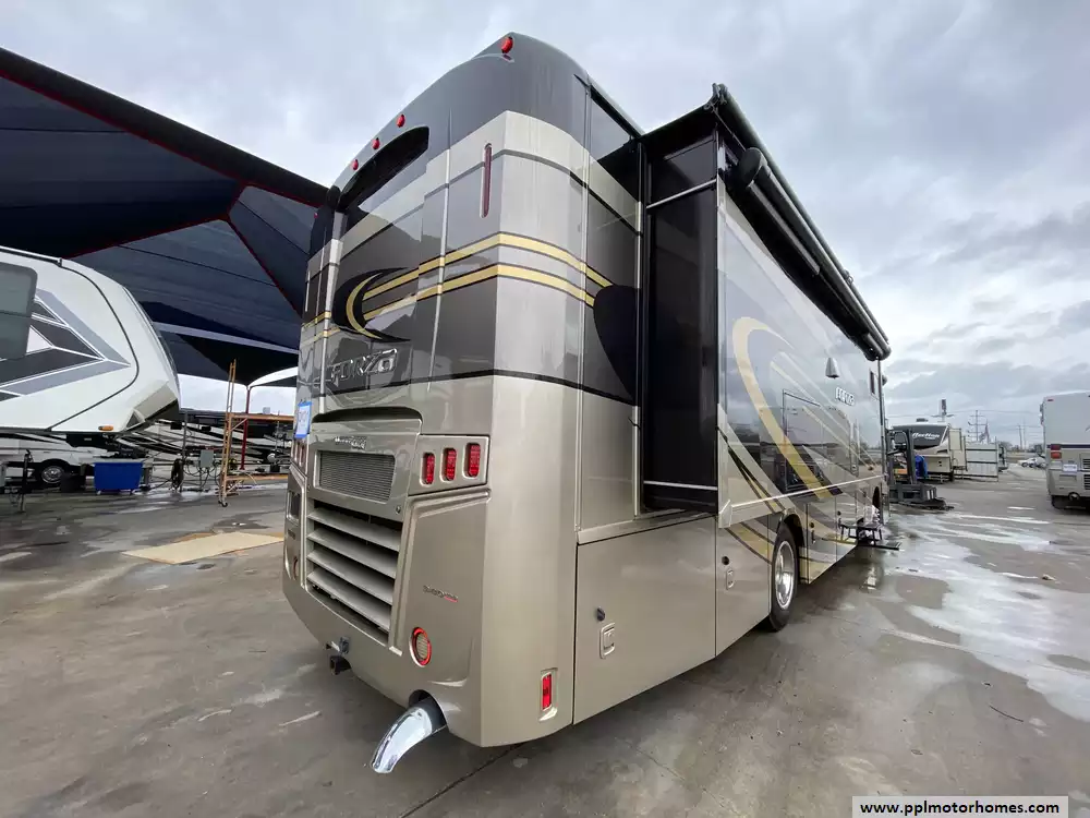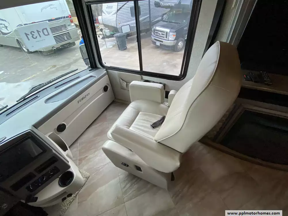 This 2019 Forza 34T has a 340hp 6.7l Cummins Engine On a Freightliner Chassis, Air Ride Suspension, Exhaust Brake, 2 Slide-outs, Onan Diesel Generator, 2 Ducted Air Conditioners, Levelers, Double Door 12v Whirlpool Refrigerator, In-Fridge Ice Maker, Automatic Main Awning And Window/Door Awnings, Washer/Dryer, Backup Camera, Satellite Dish, 3 TVs, DVD Player, Outside Shower, Fireplace, Microwave, 3 Burner Range