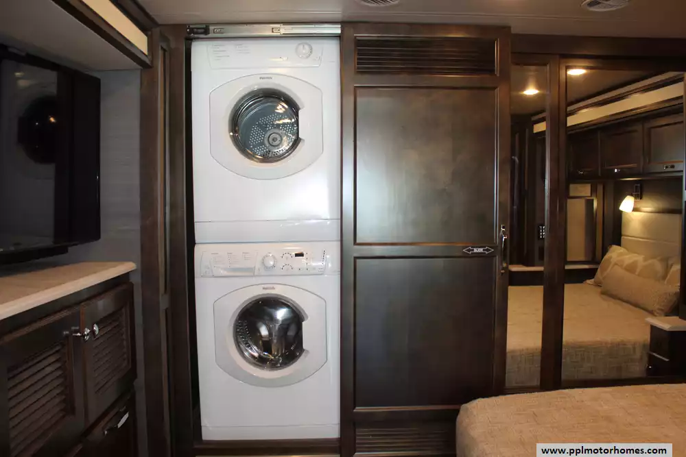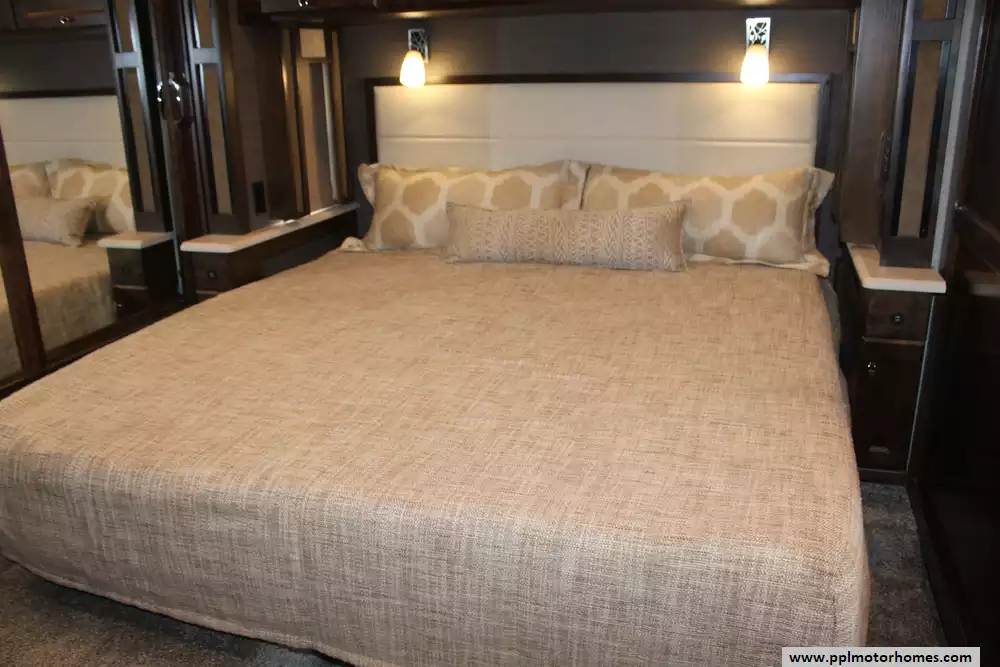Inside, the four slide-outs create an incredibly expansive floor plan that rivals much larger coaches, offering a masterclass in livability and storage. The gourmet kitchen is a chef's dream, equipped with a double-door 110v residential Whirlpool refrigerator with an in-fridge ice maker, a 2-burner range, and a convection microwave. Entertainment options are plentiful with four TVs, an outside entertainment system, a DVD player, and satellite radio, while a cozy fireplace and two ducted air conditioners ensure a perfect climate in any weather. With the added convenience of an onboard washer/dryer, automatic levelers, and an outside shower, this 33AA is fully equipped to provide a first-class experience on the open road.