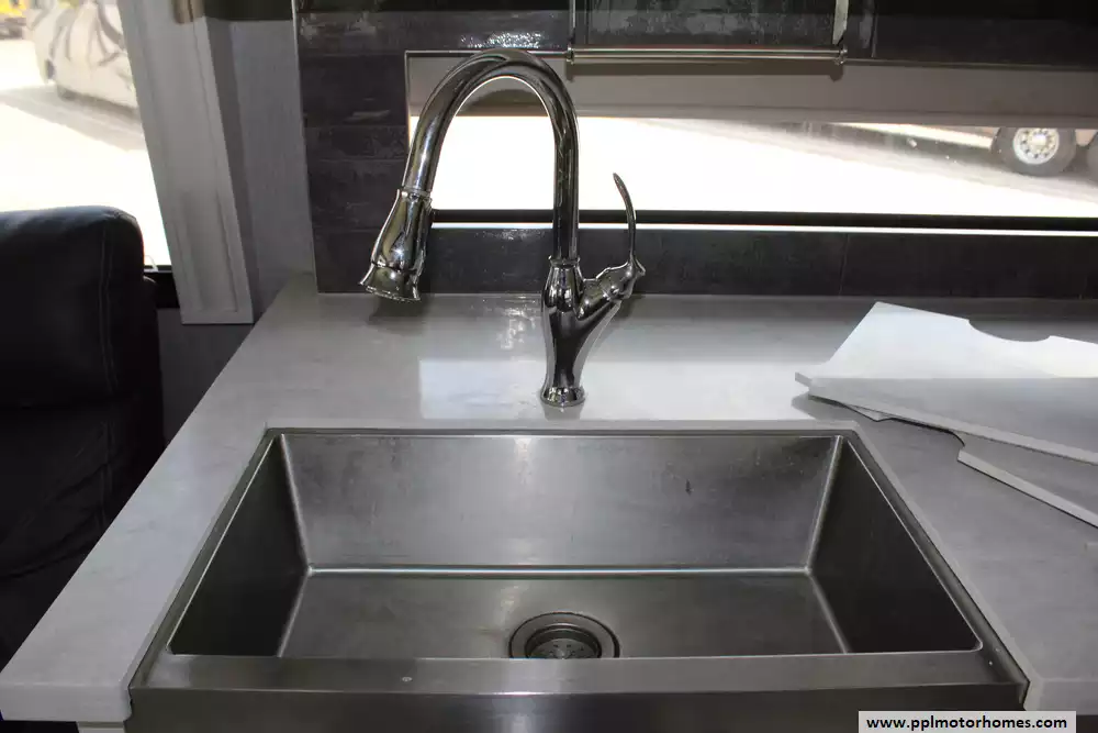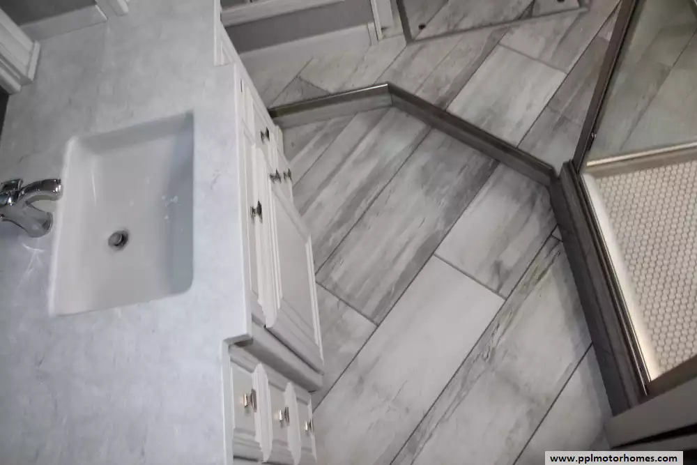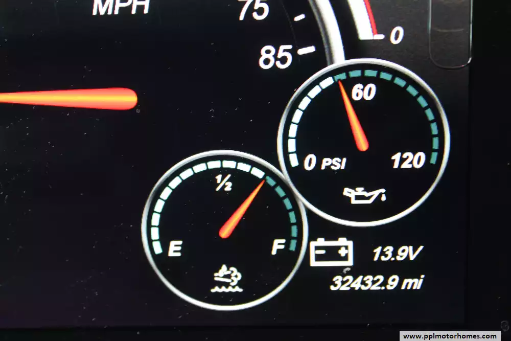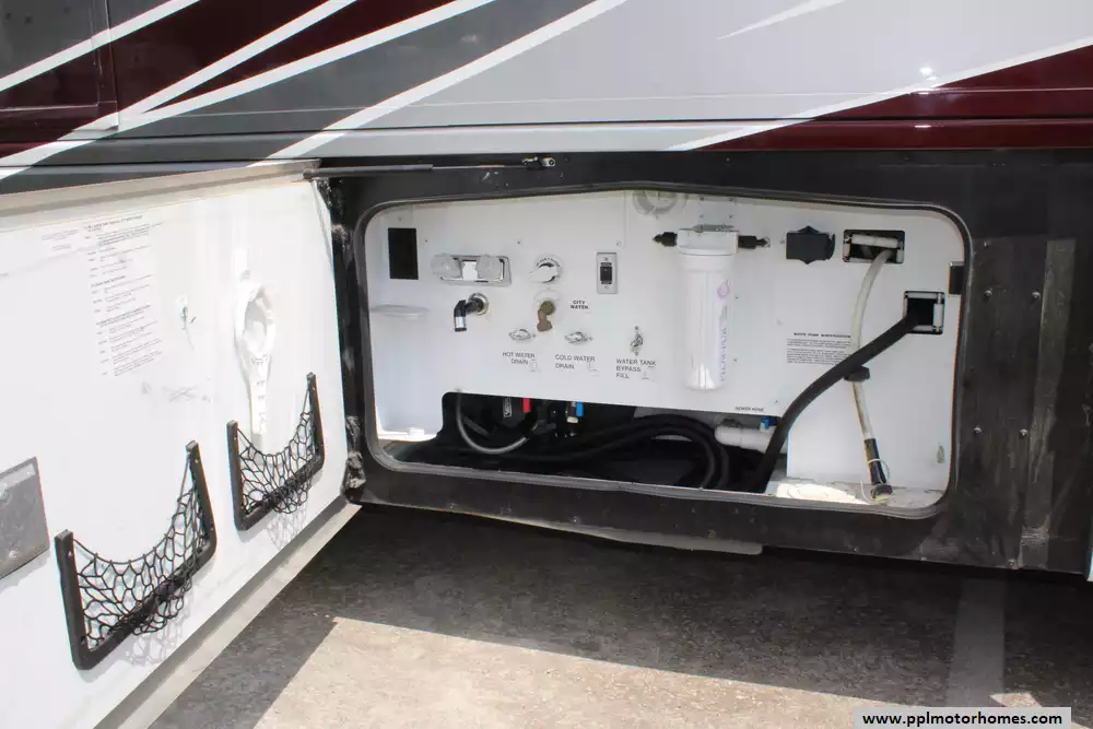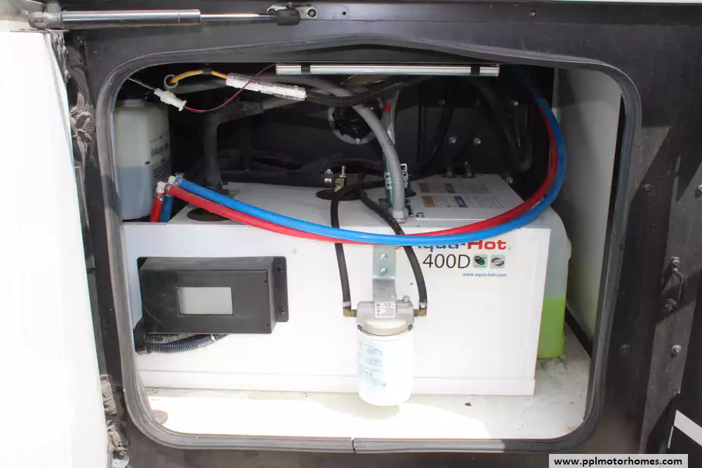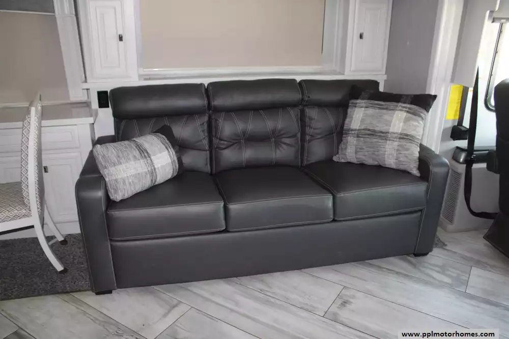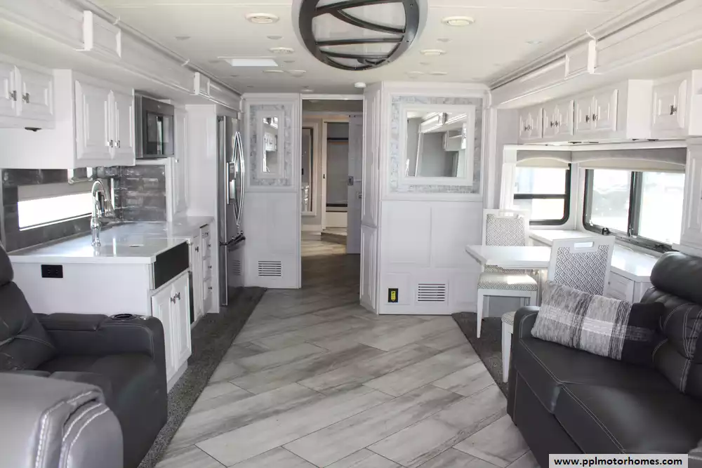 Specs: Length: 44 ft., Width: 8.5 ft., Height: 12.83 ft., Interior Height: 7 ft., Fuel Capacity: 100 gal., Total Fresh Water Tank Capacity: 105 gal., Total Gray Water Tank Capacity: 75 gal., Total Black Water Tank Capacity: 50 gal.