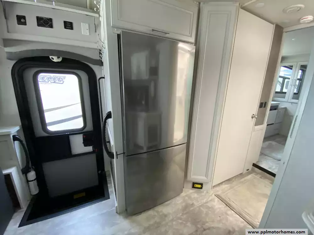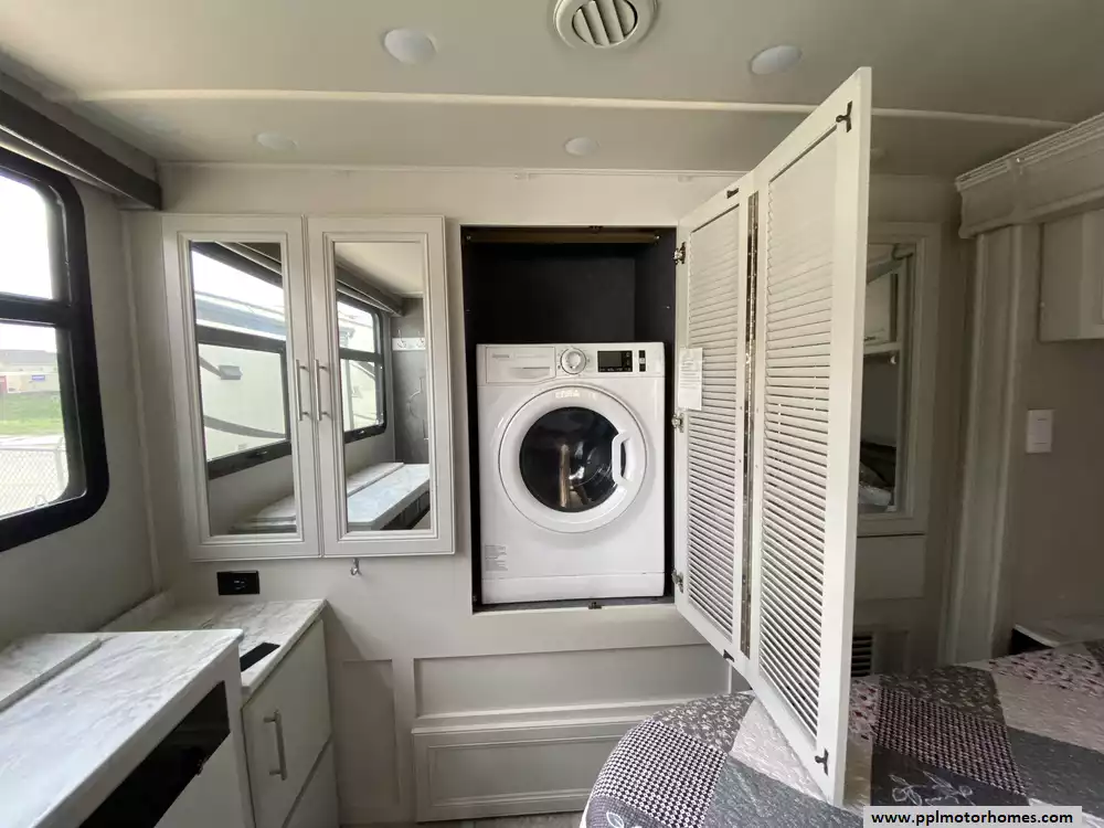 Inside, the 33D floorplan offers a residential-inspired retreat featuring a double-door 110v residential LG refrigerator with an in-fridge ice maker, a microwave, and a two-burner range. The thoughtful layout includes upscale conveniences like a washer and dryer, central vacuum, and a cozy fireplace for cool evenings. For entertainment, you can enjoy two interior TVs and a DVD player with satellite radio, or take the party outdoors with the dedicated outside entertainment system with TV and automatic main awning. Complete with a backup camera and side cameras for easy handling and an outside shower for quick cleanups, this Pace Arrow is the ideal choice for those seeking a premium, feature-rich home on the road.
