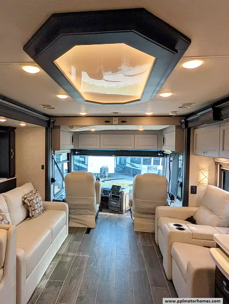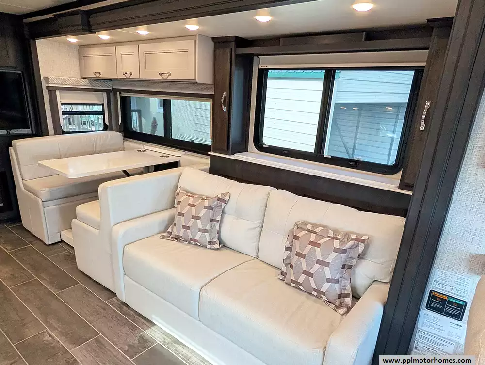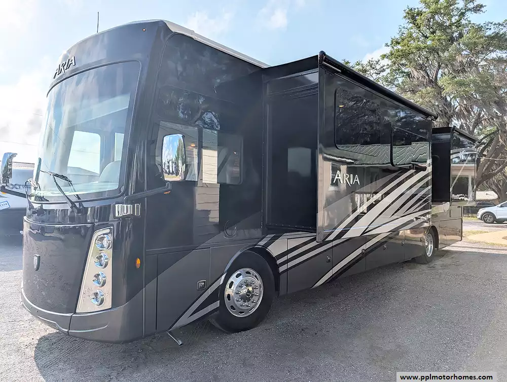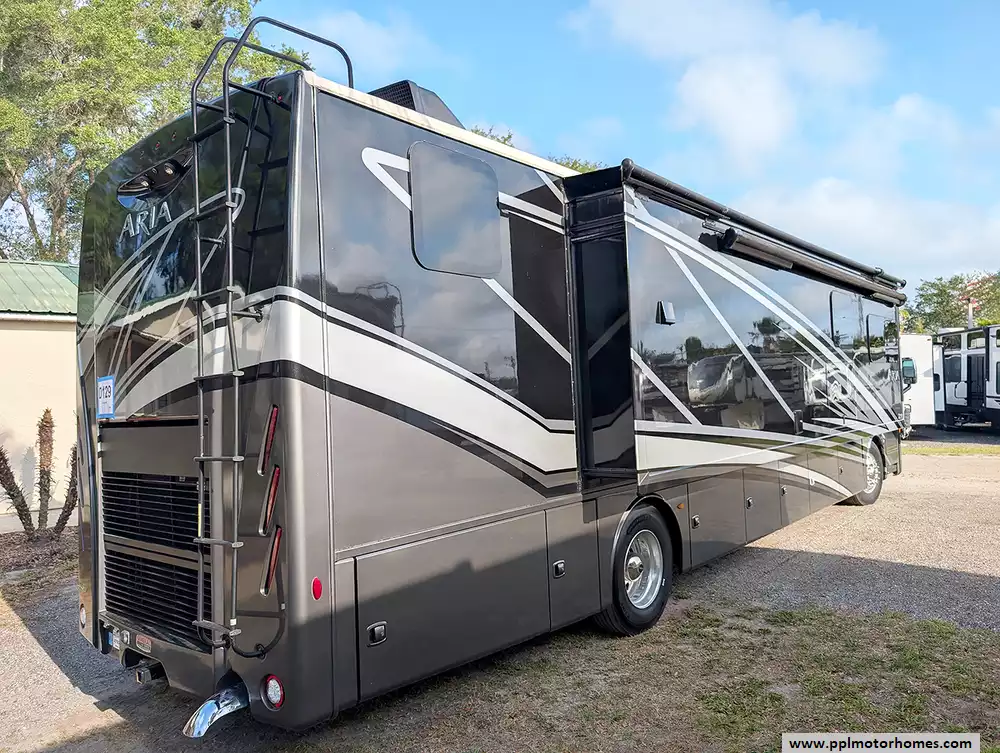 Designed for those who prioritize both durability and style, the Aria 3901 features a high-quality fiberglass body and a reliable TPO roof. The exterior is just as impressive as the interior, offering a complete automatic awning package that includes the main, window, slide, and door awnings for comprehensive shade and protection. An Onan diesel generator and solar panel provide the freedom to explore off the grid with confidence, while the outside entertainment system, outside shower, and satellite receiver make every campsite feel like a private resort. From its one-touch automatic levelers to its reputation for delivering a premium diesel-pusher experience, this Aria 3901 is ready to elevate your next cross-country adventure in absolute comfort.
