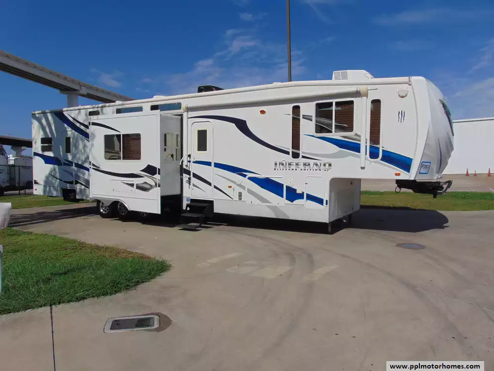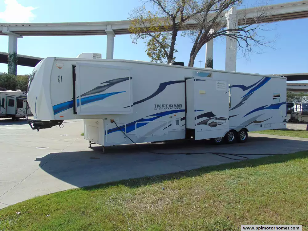 This 2009 Inferno 4005SL is a high-end toy hauler fifth wheel designed for adventure enthusiasts who want to bring along ATVs,motorcycles,or other recreational vehicles without sacrificing comfort.This is both spacious and heavy-duty,making it compatible with full-size trucks that have a substantial towing capacity.Features Include...3 Slide-outs, Onan Gas Generator, 1 Non-Ducted And 1 Ducted Air Conditioner, Double Door Gas/110v Norcold Refrigerator, Automatic Main Awning, Washer/Dryer, Heated Tanks, Outside Stereo, 2 TVs, DVD Player, Outside Shower, Central Vacuum, Microwave, 3 Burner Range,and Oven.It combines the rugged utility of a toy hauler with the luxury of a fifth wheel,making it an excellent choice for thrill-seekers who desire comfort and high-end amenities while bringing along their favorite toys.