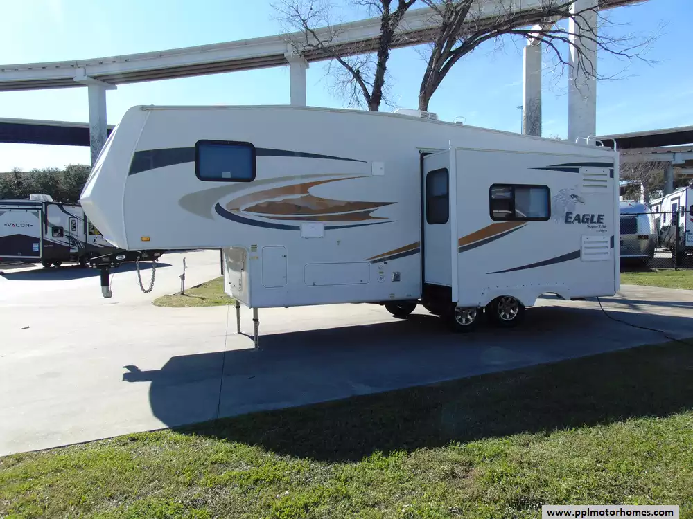 This 2010 Eagle Super Lite 25.5 RKS is a lightweight and well-designed fifth wheel, perfect for couples or small families looking for a comfortable and easy-to-tow RV. With its thoughtful layout,durable construction, and modern amenities,this model delivers a home-away-from-home experience for adventurers.Features Include...Electric Landing Gear, 1 Slide-out, 1 Ducted Air Conditioner, Double Door Gas/110v Norcold Refrigerator, Automatic Main Awning, Outside Speakers, TV, Outside Shower, Microwave, 3 Burner Range,and Oven.Its lightweight design,combined with comfortable living spaces,makes it ideal for weekend getaways or longer journeys.