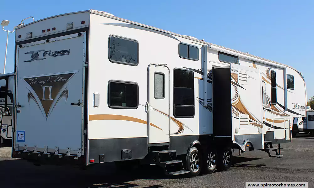 Built for strength and stability, the Fuzion 398 tows confidently behind a properly equipped heavy-duty pickup or flatbed truck with a fifth-wheel hitch setup. Its robust frame, balanced weight distribution, and upgraded suspension ensure a smooth, steady ride-even when the garage is fully loaded. Whether you're heading to the dunes, the mountains, or the lake, this toy hauler delivers the perfect combination of capability and class. Bold, beautiful, and built for adventure-the Fuzion 398 turns every trip into a first-class escape.