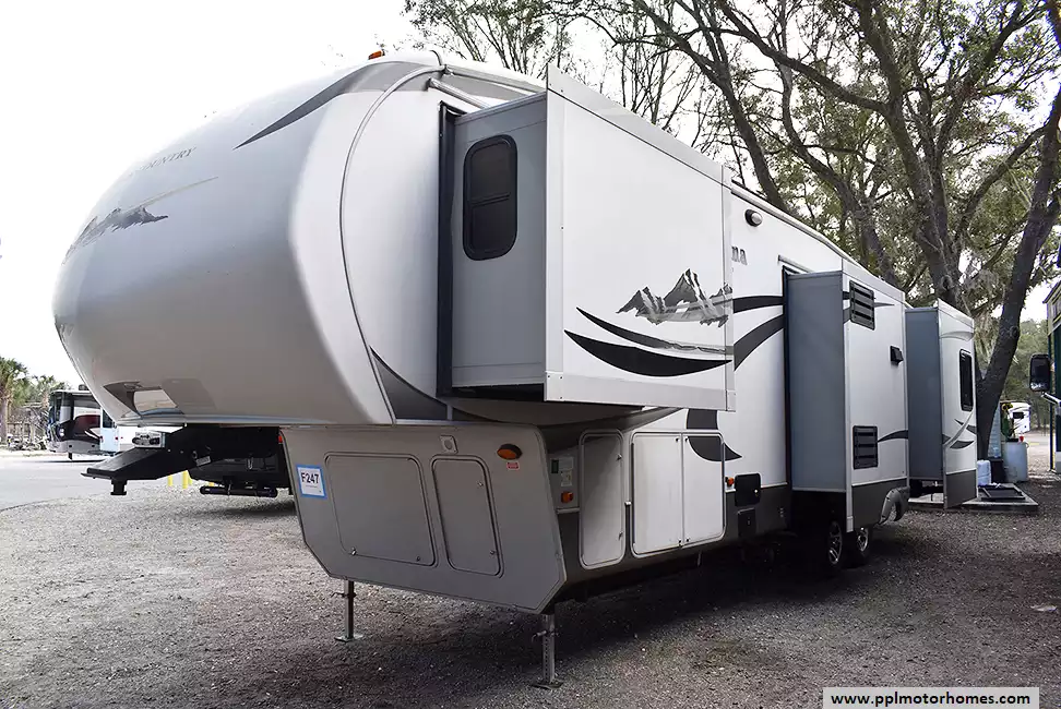 This 2011 High Country 343RL has an Electric Landing Gear, 4 Slide-outs, 1 Ducted Air Conditioner, Double Door 12v Norcold Refrigerator, Automatic Main Awning, Washer/Dryer Connections, Outside Stereo, 2 TVs, DVD Player, Outside Shower, Fireplace, Microwave, 3 Burner Range, Oven