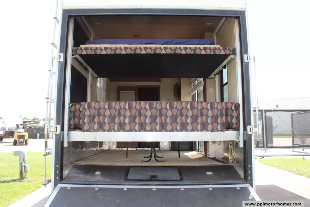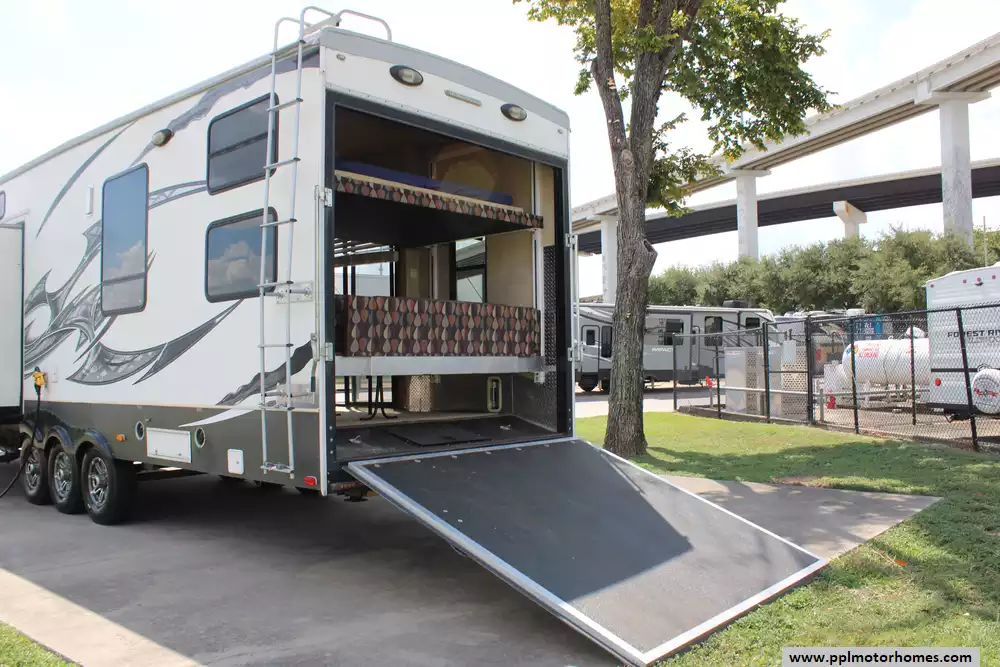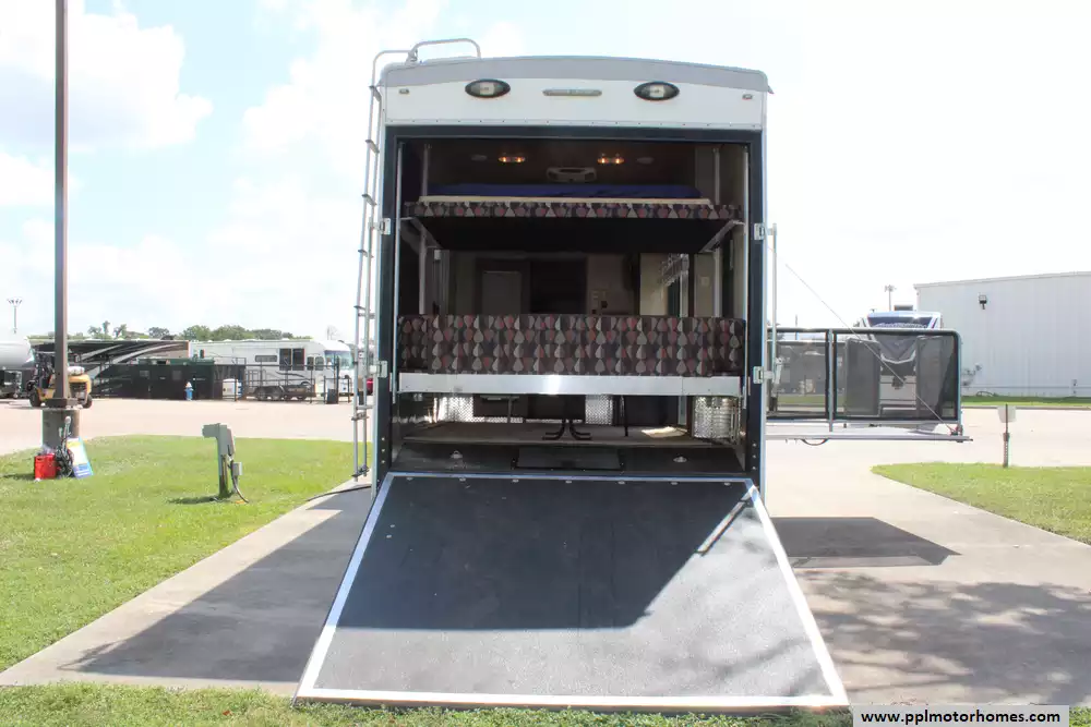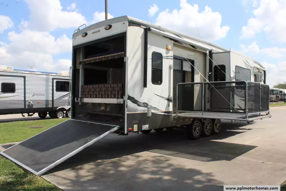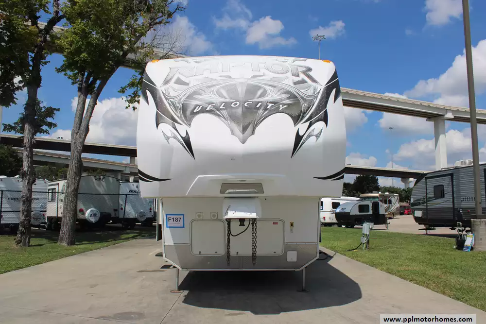 This 2012 Raptor Velocity 384PK is a large, well-equipped toy hauler suitable for folks who want a combination of hauling capacity plus comfort. 14' of cargo space, Features Include...Hydraulic Landing Gear, 3 Slide-outs, Onan Gas Generator, 3 Ducted Air Conditioners, 4 Door Gas/110v Norcold Refrigerator (Additional Refrigerator Present), Automatic Main Awning, Outside Entertainment System, 2 TVs, Outside Shower, Outside Grill, Microwave, 3 Burner Range, and Oven.