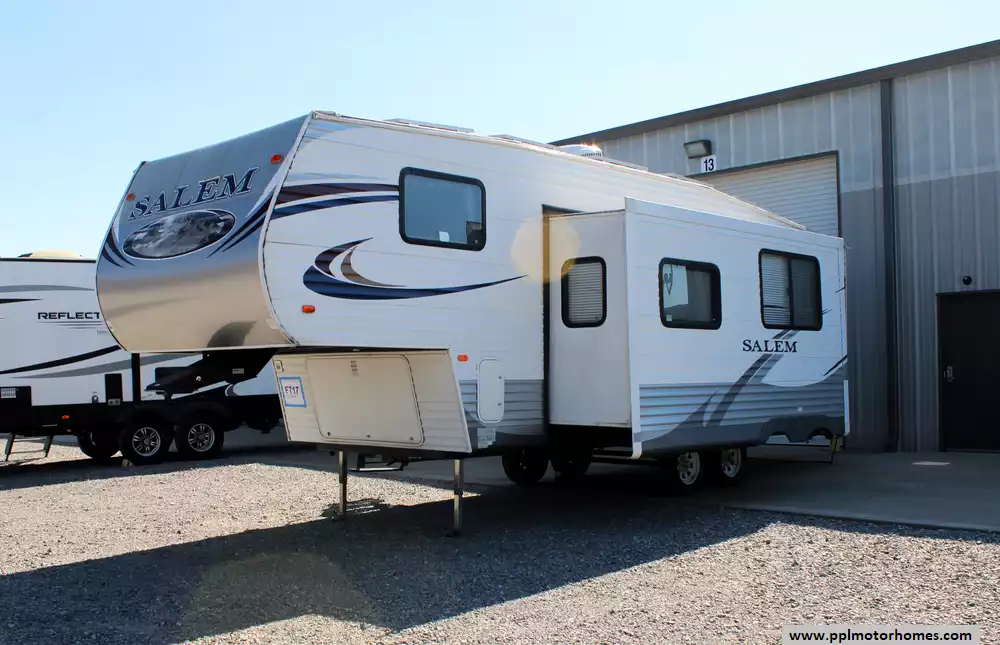 This 2013 Salem M-26DDSS has an Electric Landing Gear, 1 Slide-out, 1 Ducted Air Conditioner, Double Door Gas/110v Dometic Refrigerator, Automatic Main Awning, Solar Panel, Microwave, 3 Burner Range, Oven