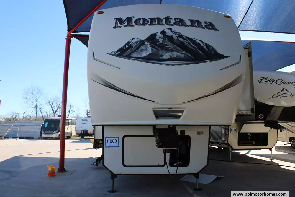 This 2014 Montana Big Sky by Keystone 3100RL has a Hydraulic Landing Gear, 3 Slide-outs, 2 Ducted Air Conditioners, 4 Door Gas/110V Norcold Refrigerator, Automatic Main Awning, Washer/Dryer, 2 TVs, DVD Player, Outside Shower, Fireplace, Central Vacuum, Convection Microwave, 3 Burner Range
