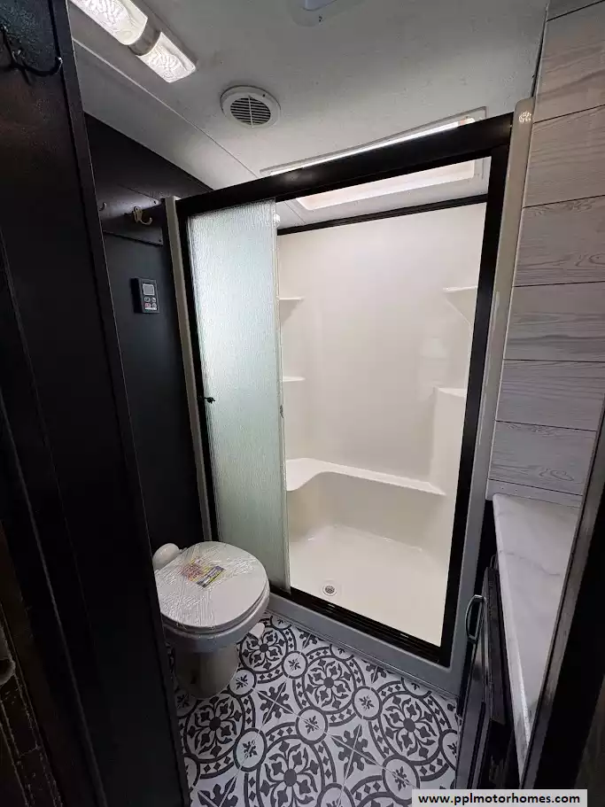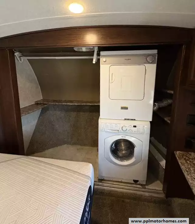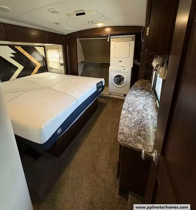 The master suite is located in the front of the RV and includes a slide-out with a king-size bed, dresser, TV and full-wall closet that houses a stackable washer and dryer. The full bath is just in front of the master suite and features a shower with built in seat, toilet, sink and storage compartments.