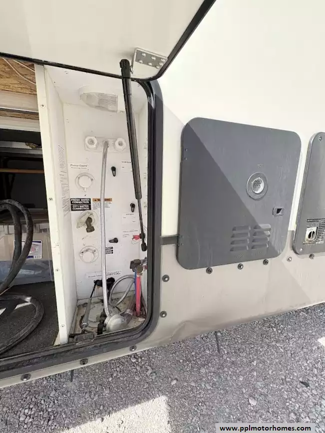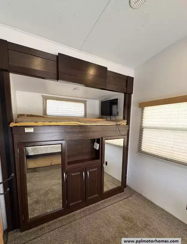Located in the rear of the RV is the bunk house and half bath. The bunkhouse is a private room with its own dual slides. There is a single bed on each side and each has its own TV. The half bath can be accessed from the bunk room and outside.