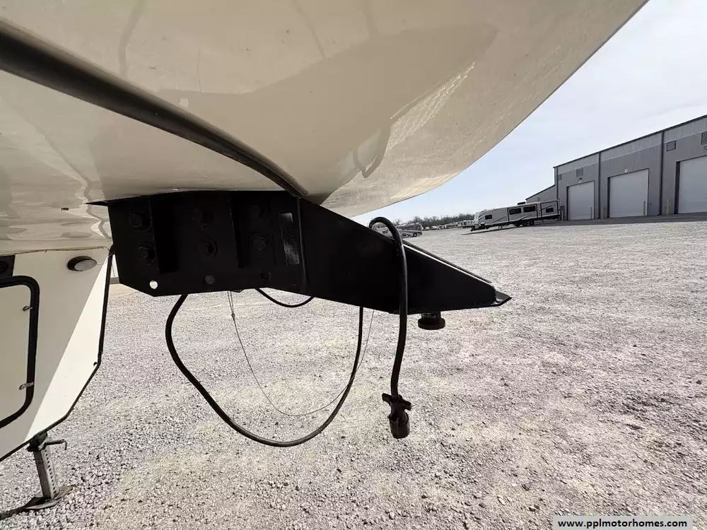 The exterior features include a rear outdoor kitchen, which includes a refrigerator, a two-burner range, and a sink. Enormous pass-through storage compartments with insulated slam-latch doors and gas struts are a highlight, offering a significant amount of space. It comes with electric front jacks and electric rear stabilizer jacks. The front compartment also has a TV mount to enhance the outdoor living space.