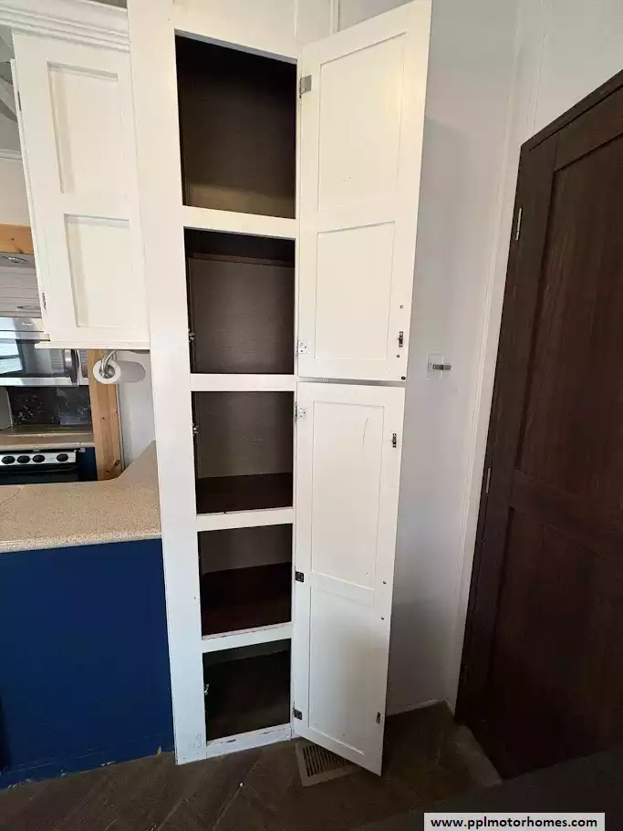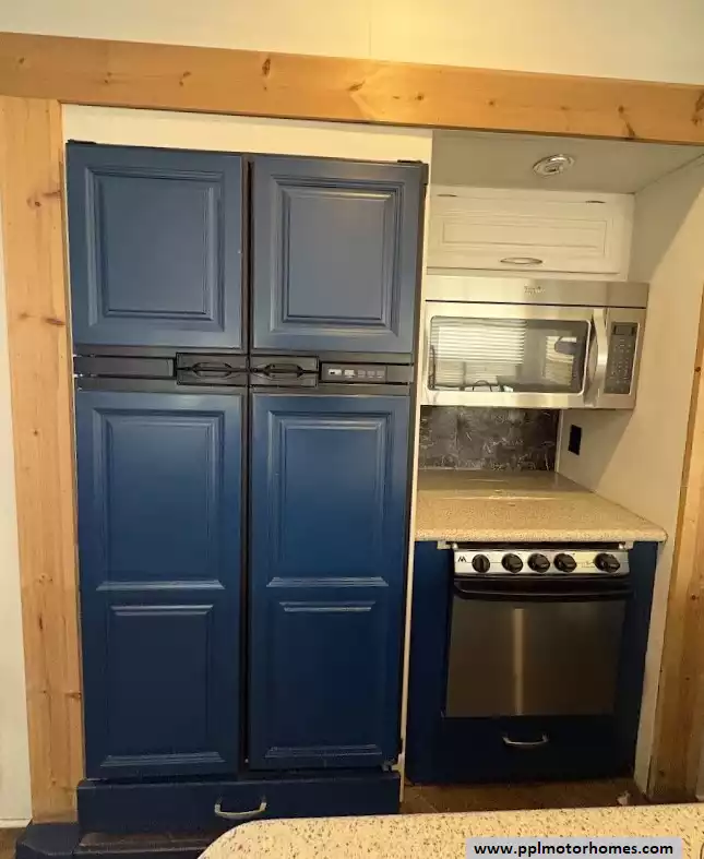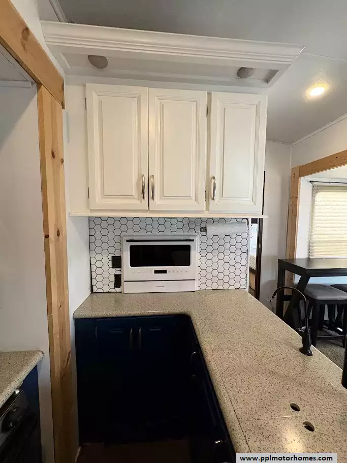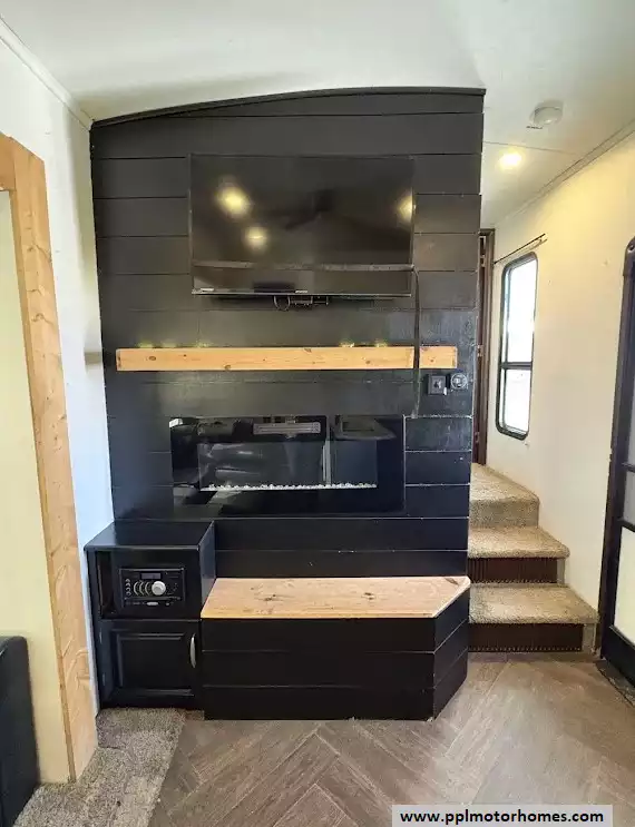 The main living area includes an L-shaped sofa with under cushion storage. The area is equipped with a flat panel TV and an electric fireplace below the entertainment center for a cozy ambiance. The kitchen is integrated into this space, featuring an L-shaped counter with a double sink, solid surface countertops, a 30-inch overhead microwave, a three-burner range with over, 4- door refrigerator, making it highly functional for meal preparation while socializing. The owners also installed a dishwasher for added convenience. A ceiling fan is standard to help with air circulation, and large windows allow for plenty of natural light.
