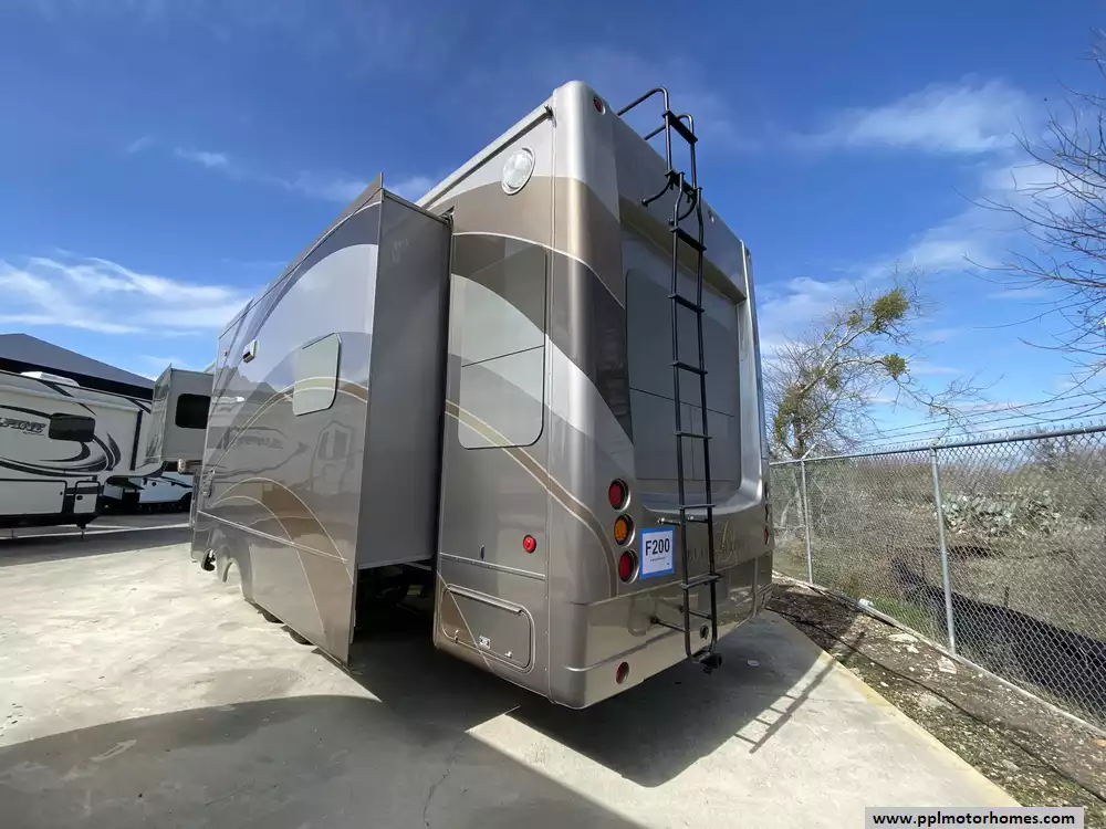 This 2015 Elite Suites 38PS3 has a Hydraulic Landing Gear, 4 Slide-outs, 2 Ducted Air Conditioners, Double Door Residential Whirlpool Refrigerator, In-Fridge Ice Maker, Two Automatic Main Awning, Washer/Dryer Connections, Dishwasher, Outside Entertainment System with TV, 2 TVs, DVD Player, Outside Shower, Fireplace, Convection Microwave, 2 Burner Range Induction Cook Top