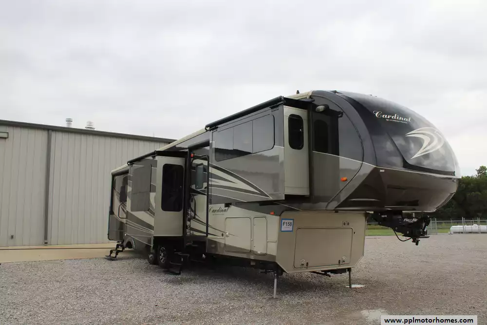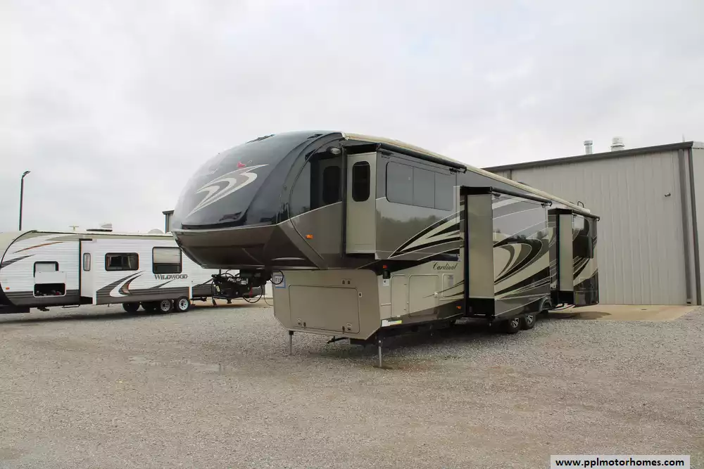 This 2015 Cardinal M3800FL has a Hydraulic Landing Gear, 5 Slide-outs, Onan Propane Generator, 2 Ducted Air Conditioners, Side by Side Residential Frigidaire Refrigerator, In-Fridge Ice Maker, Automatic Main Awning And Slide/Door Awnings, Washer/Dryer Connections, Outside Entertainment System, 2 TVs, 2 DVD Players, Outside Shower, Fireplace, Convection Microwave, 3 Burner Range, Oven