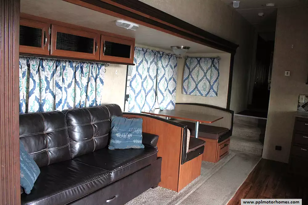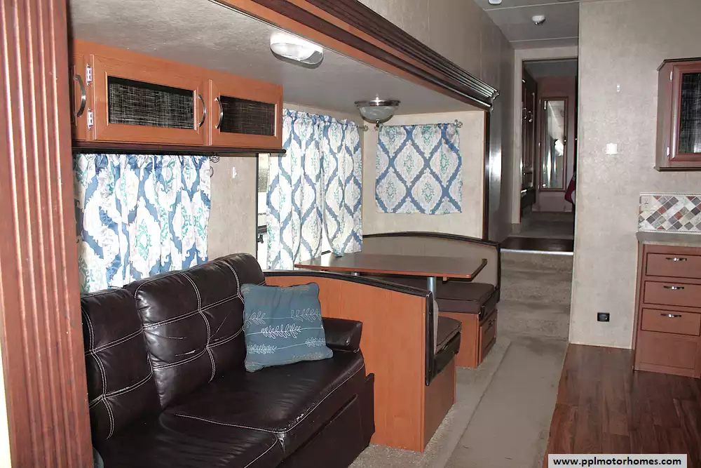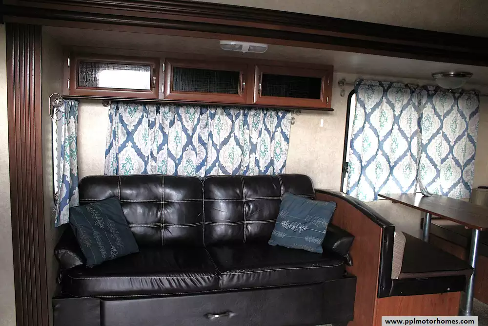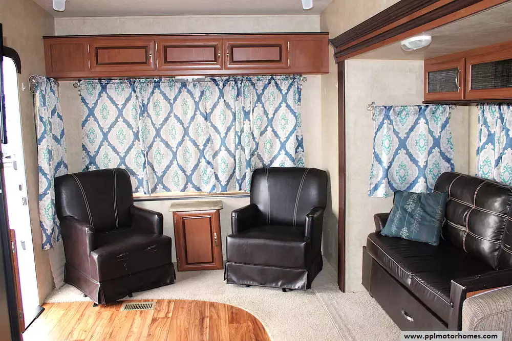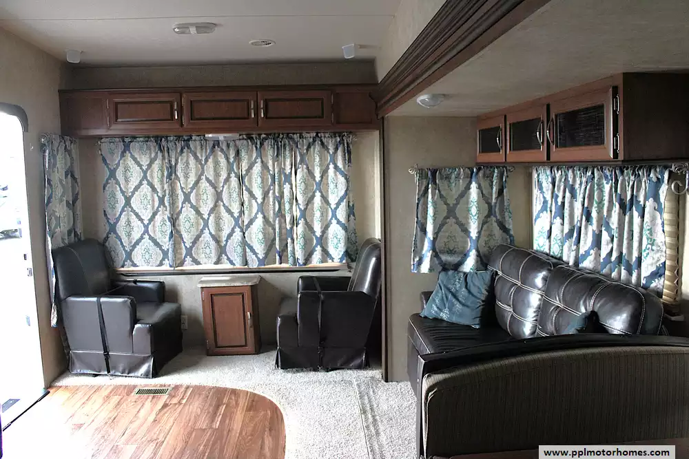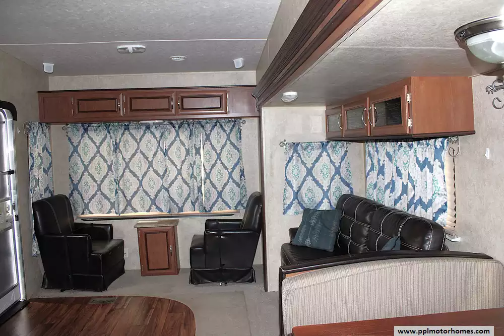 2015 Forest River Wildwood 29RLW, a beautifully designed travel trailer that blends spacious living with the freedom of the open road. Its inviting rear-living floorplan creates a warm and relaxing atmosphere with comfortable seating, large panoramic windows, and plenty of natural light-perfect for enjoying quiet mornings at the campground or relaxing after a day of exploring. The well-equipped kitchen offers generous counter space, a three-burner cooktop, oven, microwave, refrigerator, and abundant cabinet storage so you can prepare meals just like at home.