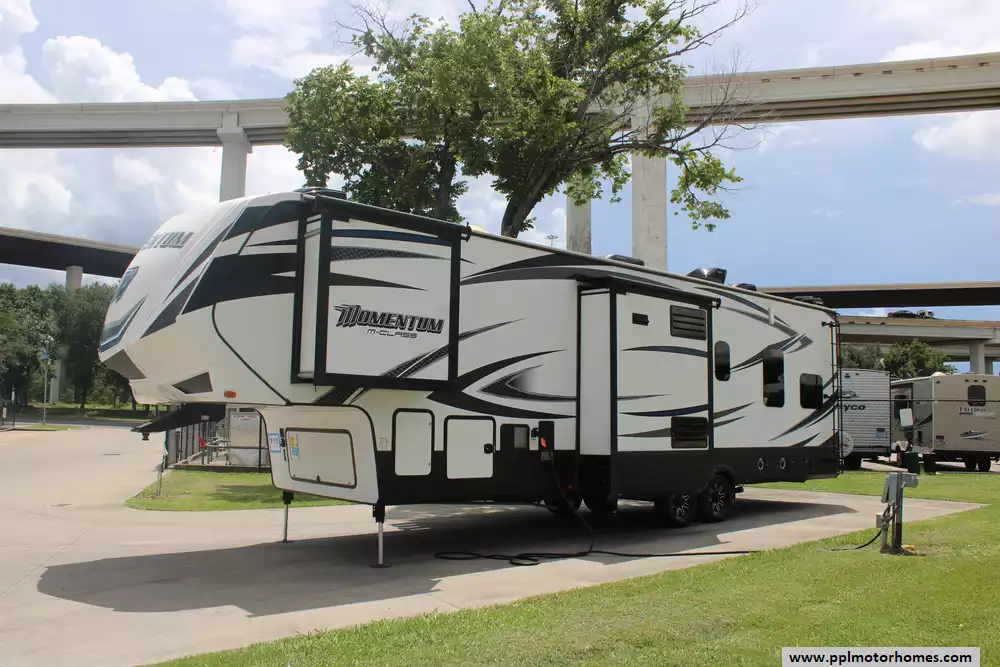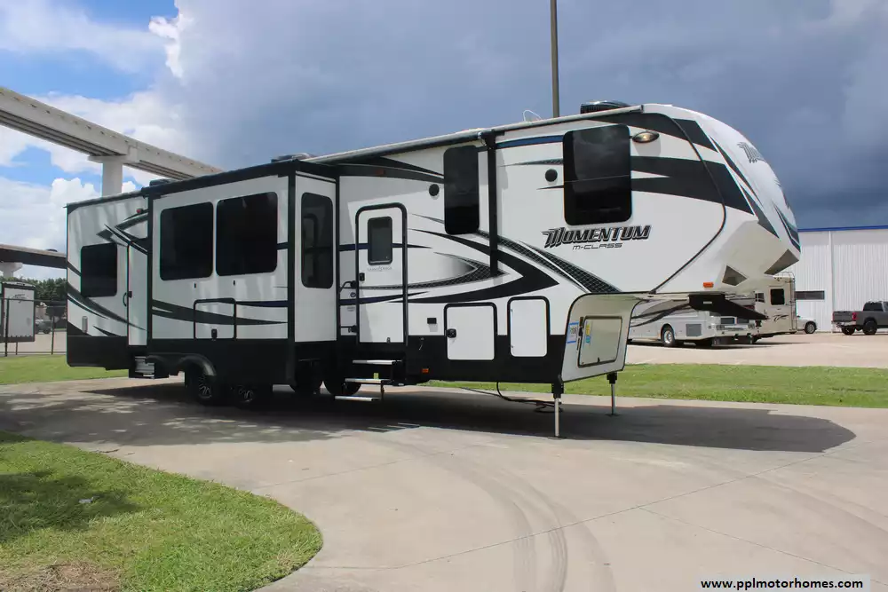 This 2015 Momentum 350M is a premium luxury fifth-wheel toy hauler tailored for adventurers seeking comfort and utility. Features Include...Hydraulic Landing Gear, 3 Slide-outs, Onan Gas Generator, 3 Ducted Air Conditioners, 4 Door Gas/110v Norcold Refrigerator, Automatic Main Awning And Slide Awning, Washer/Dryer Connections, Outside Entertainment System, 4 TVs, Outside Shower, Fireplace, Microwave, 3 Burner Range, and Oven. The 2015 Momentum 350M is an upscale, well-rounded toy hauler ideal for outdoor enthusiasts who also want residential-level living standards.