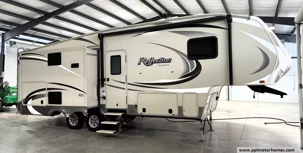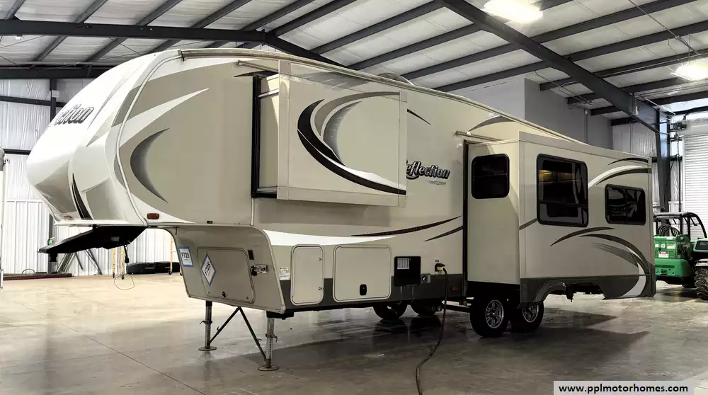This 2015 Reflection 29RS has an Electric Landing Gear, 3 Slide-outs, 1 Ducted Air Conditioner, Double Door Gas/110v Refrigerator, TV, Automatic Main Awning, Outside Speakers, Outside Refrigerator, Outside Shower, Fireplace, Microwave, 3 Burner Range, Oven