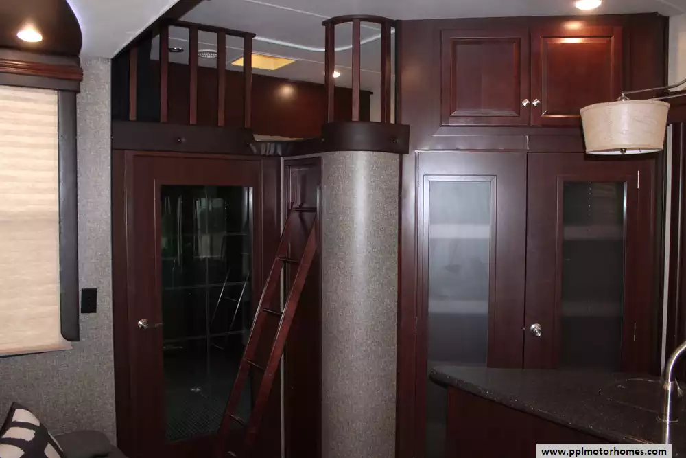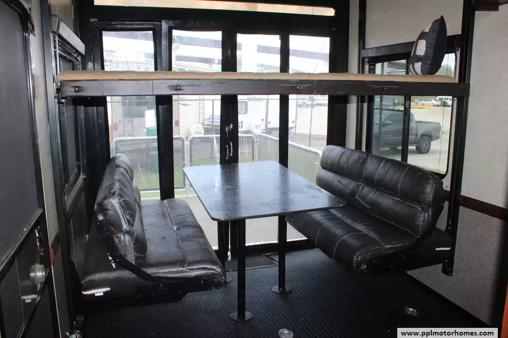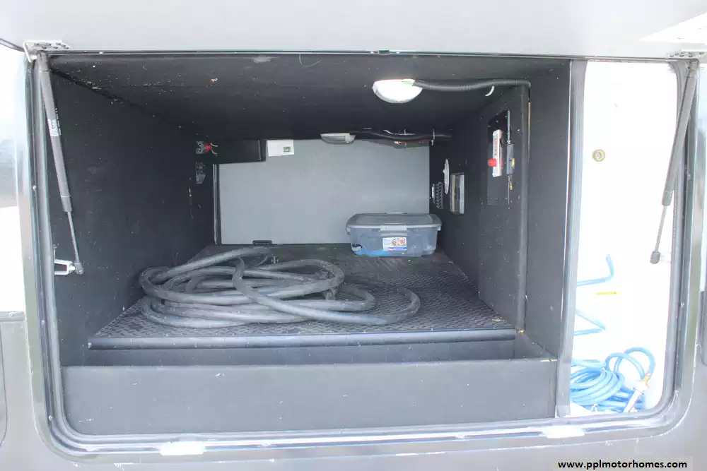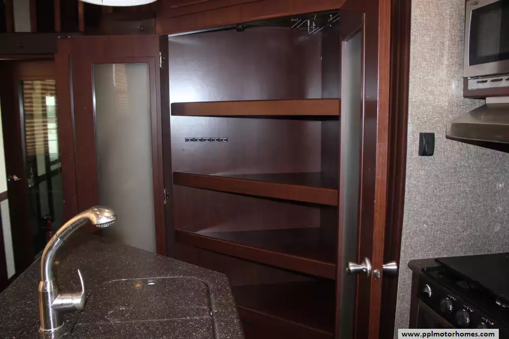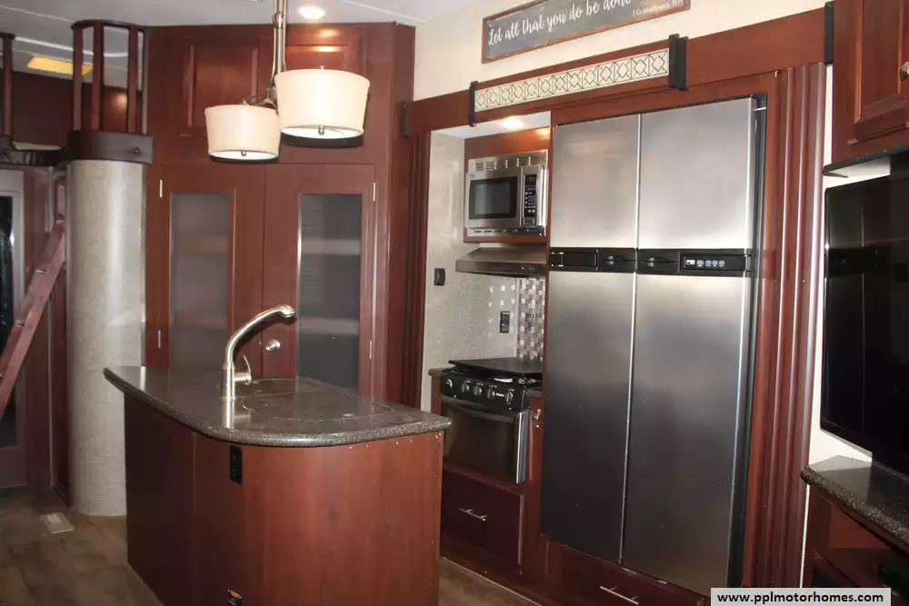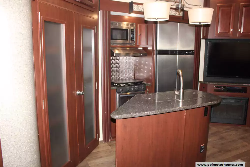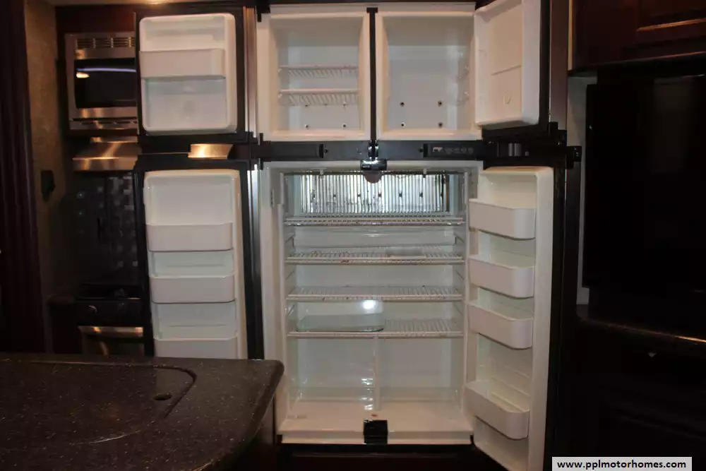 The interior is packed with high-end amenities to elevate your camping experience, starting with a fully equipped kitchen featuring a four-door Norcold gas/electric refrigerator with a built-in ice maker, a microwave, and a three-burner range. Stay comfortable and self-sufficient anywhere with the onboard Onan gas generator and the convenience of a central vacuum system and washer/dryer connections. Entertainment is covered with three TVs and a DVD player, while the automatic main awning and outside shower make outdoor living effortless. From its massive storage capacity to its refined finishes, this Road Warrior 415 is ready to lead your next journey in style.