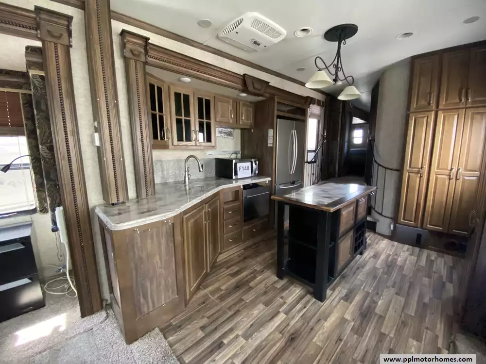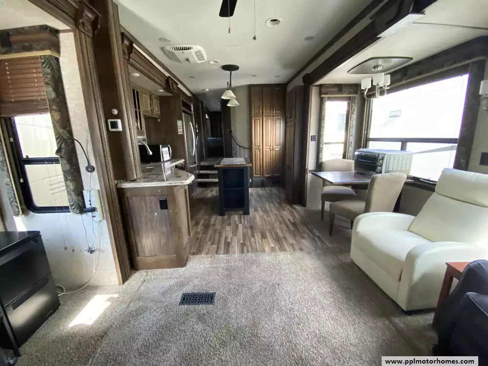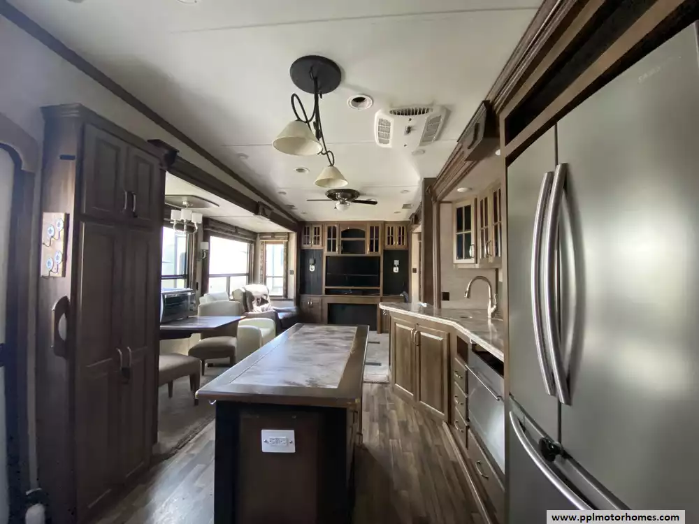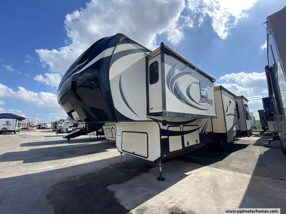 This 2015 Alpine 3536RE has a Hydraulic Landing Gear, 4 Slide-outs, 1 Non-Ducted And 2 Ducted Air Conditioner, Double Door 110v Residential Samsung Refrigerator, In-Fridge Ice Maker, Automatic Main Awning And Slide Awning, Washer/Dryer, Dishwasher, Satellite Dish & Receiver, 2 TVs, DVD Player, Outside Shower, Microwave, 2 Burner Range, Oven, King Size Bed with a Sleep Number Mattress and an extra pump.