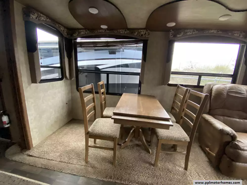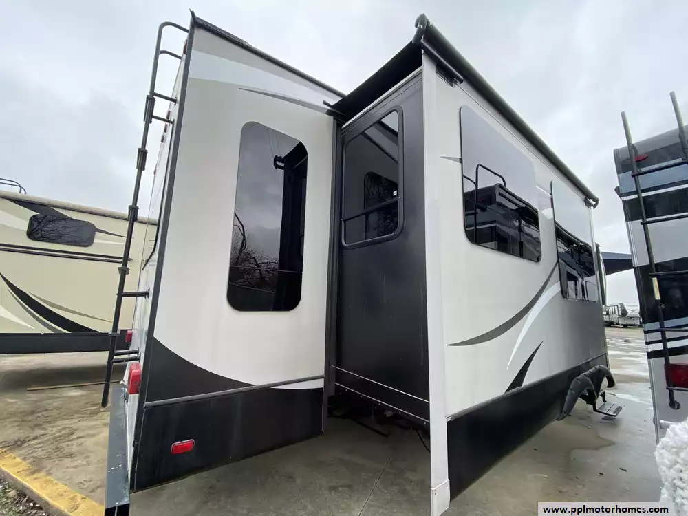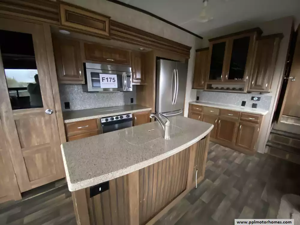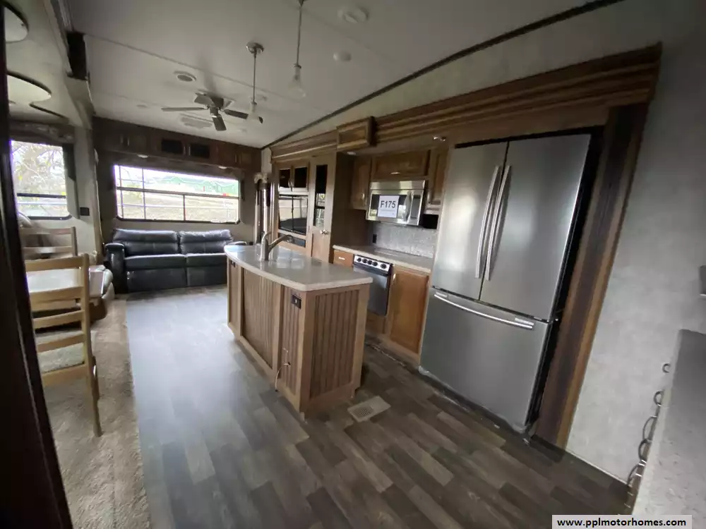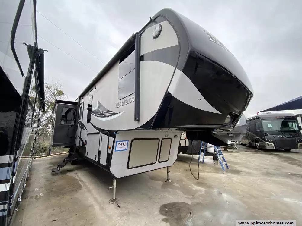 This 2015 Montana High Country 353RL has an Electric Landing Gear, 3 Slide-outs, Double Door 12v Residential Samsung Refrigerator, In-Fridge Ice Maker, Automatic Main Awning, Washer/Dryer Connections, Outside Speakers, TV, Outside Shower, Microwave, Oven