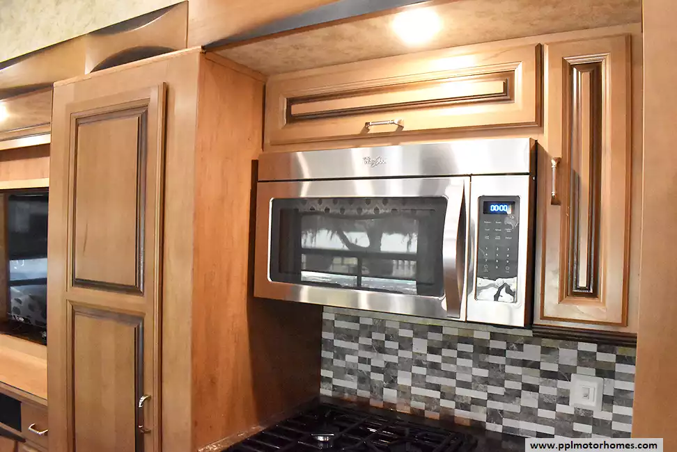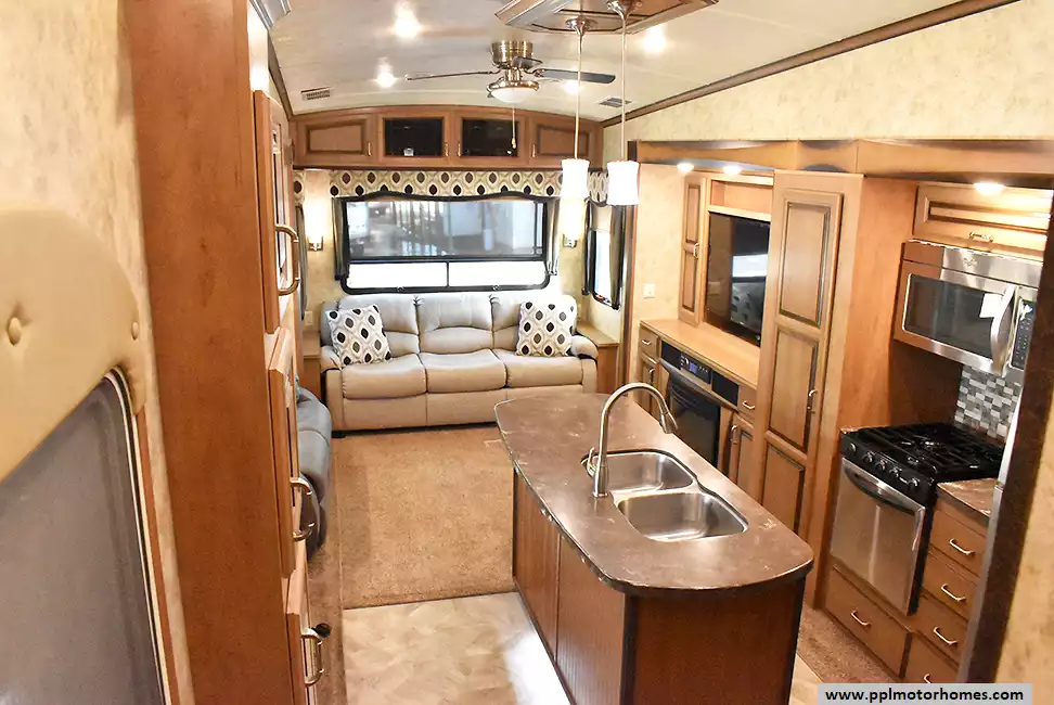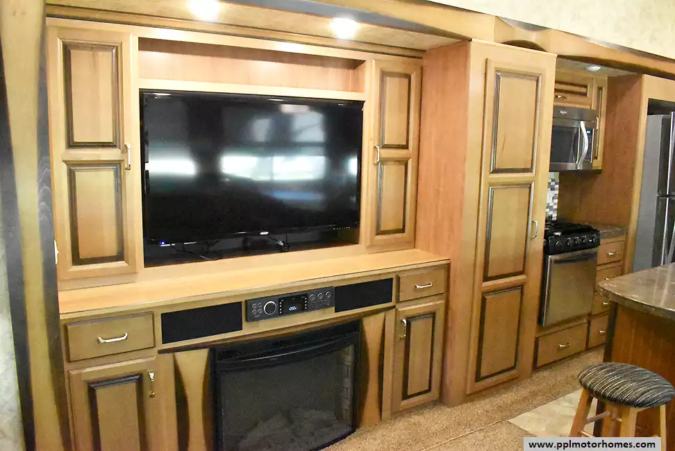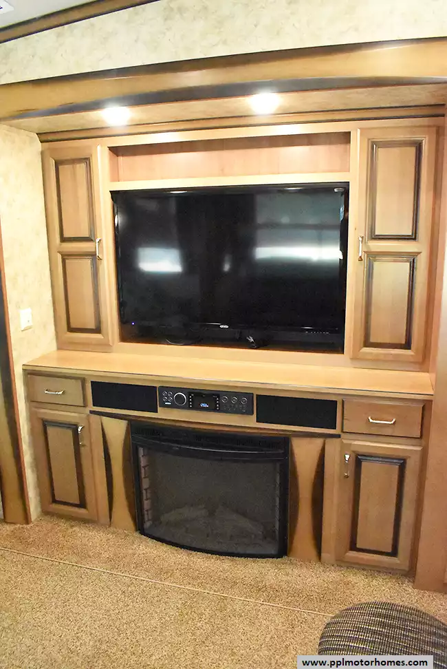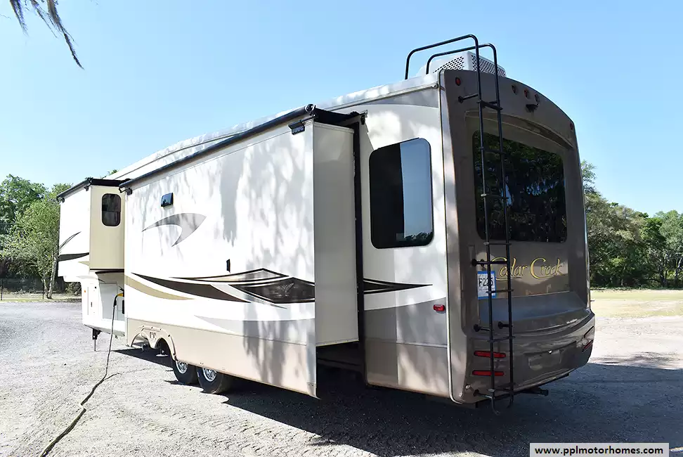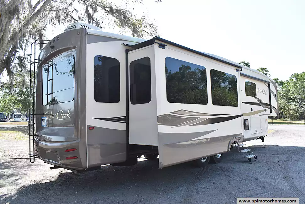 This 2016 Ceder Creek Hathaway 38FB2 has a Hydraulic Landing Gear, 2 Slide-outs, 2 Ducted Air Conditioners, Double Door 110v Residential Whirlpool Refrigerator, In-Fridge Ice Maker, Automatic Main Awning And Slide Awning, Washer/Dryer, Outside Speakers, 2 TVs, Fireplace, Microwave, 3 Burner Range, Oven