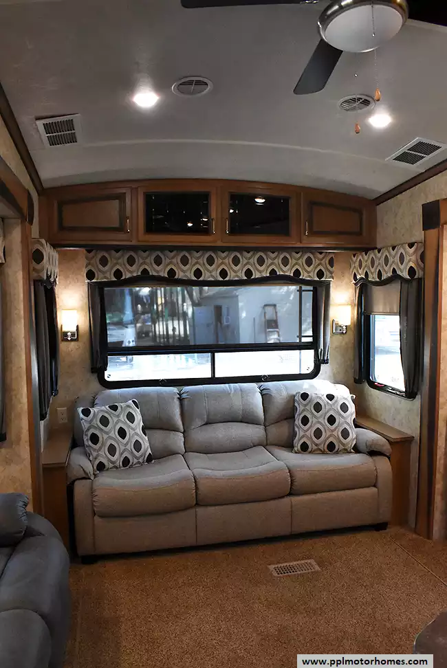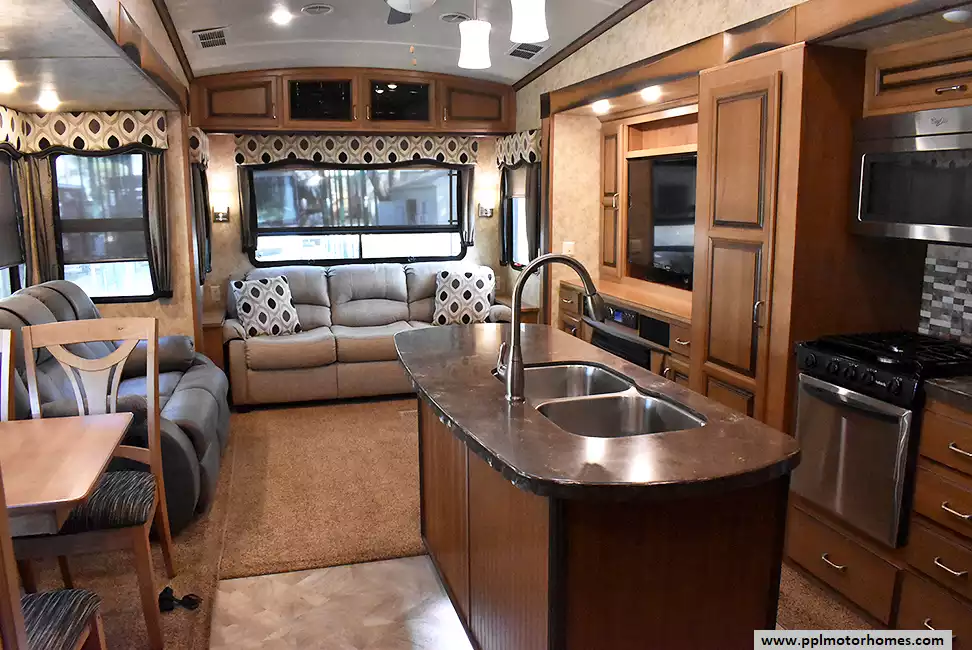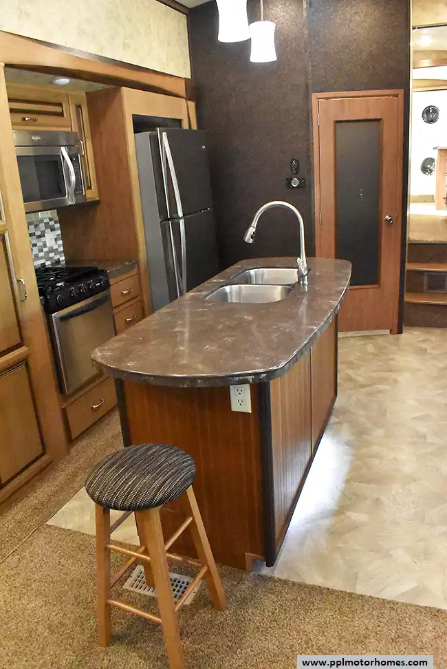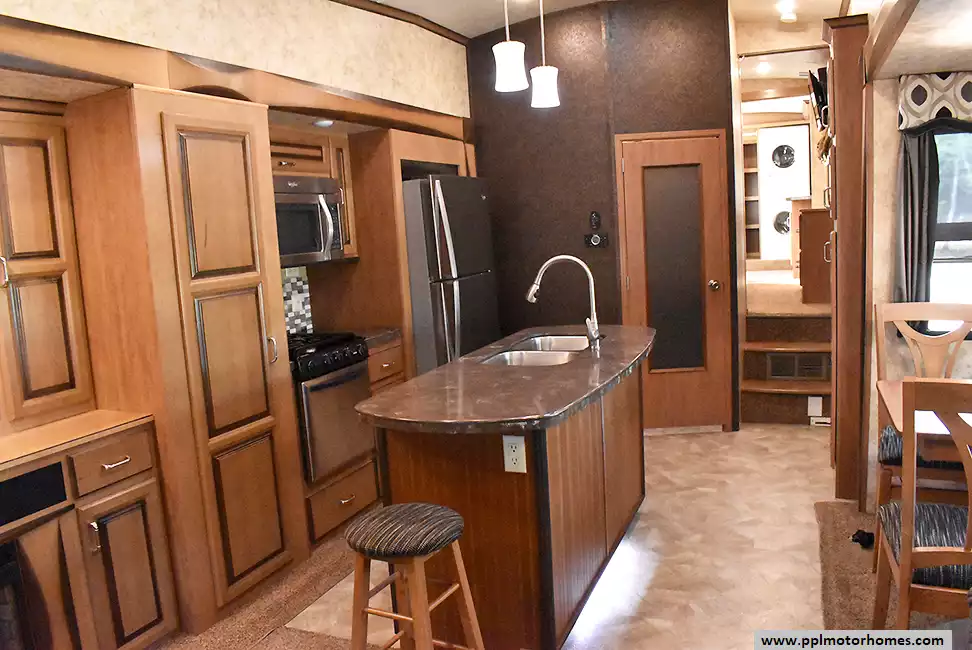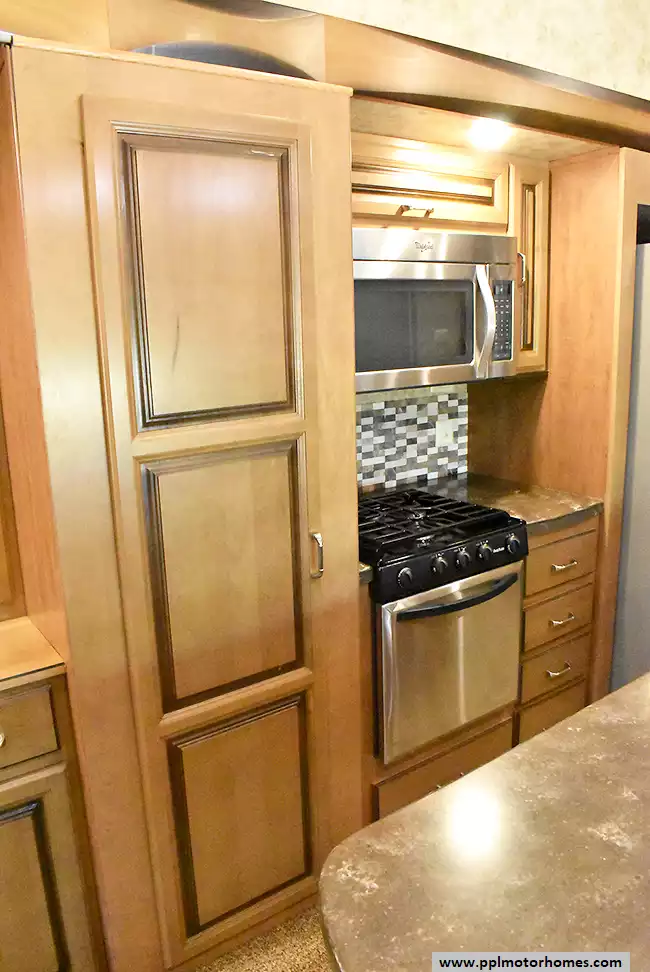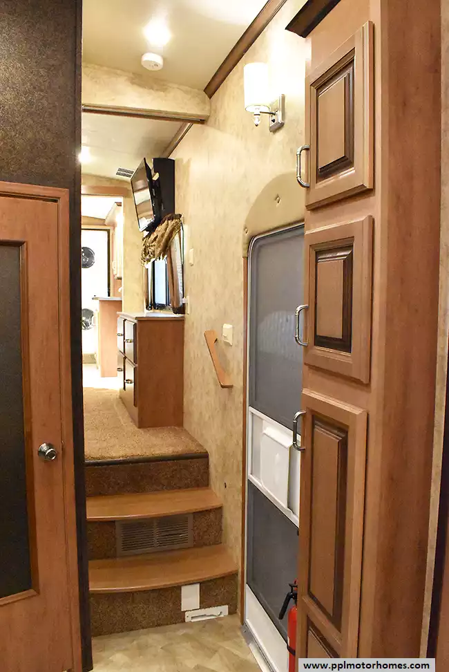 This 2016 Ceder Creek Hathaway 38FB2 has a Hydraulic Landing Gear, 2 Slide-outs, 2 Ducted Air Conditioners, Double Door 110v Residential Whirlpool Refrigerator, In-Fridge Ice Maker, Automatic Main Awning And Slide Awning, Washer/Dryer, Outside Speakers, 2 TVs, Fireplace, Microwave, 3 Burner Range, Oven