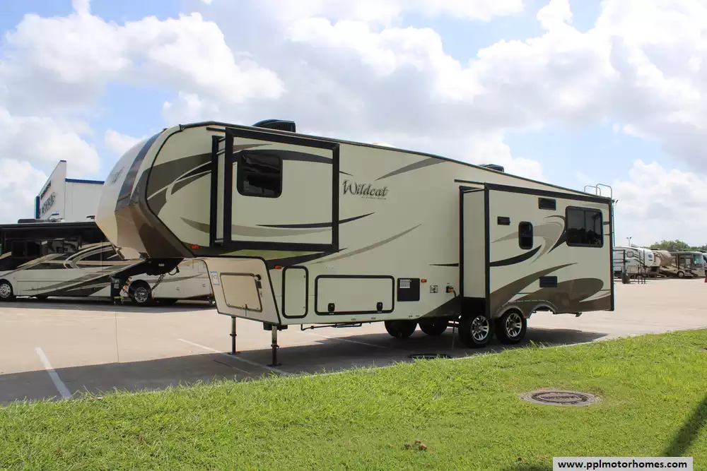 This 2016 Wildcat by Forest River 28SGX is a mid-profile fifth wheel designed for couples or small families seeking a comfortable and well-equipped RV for extended trips or weekend getaways. Features Include...Electric Landing Gear, 3 Slide-outs, 1 Non-Ducted And 1 Ducted Air Conditioner, Double Door Gas/110v Norcold Refrigerator, Automatic Main Awning, Washer/Dryer Connections, Outside Speakers, 2 TVs, Outside Shower, Fireplace, Microwave, 3 Burner Range, and Oven.