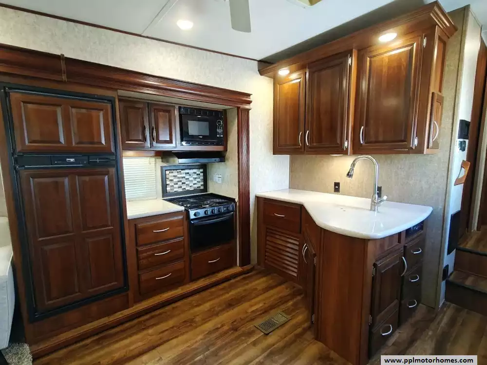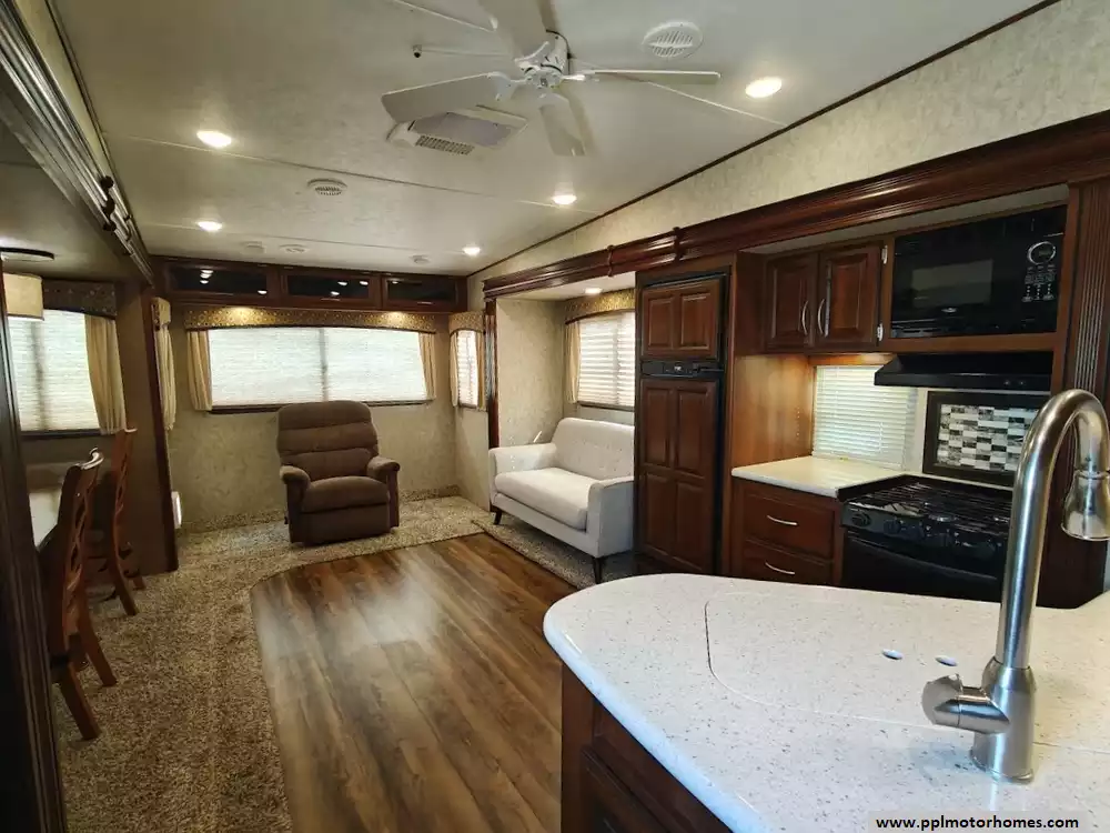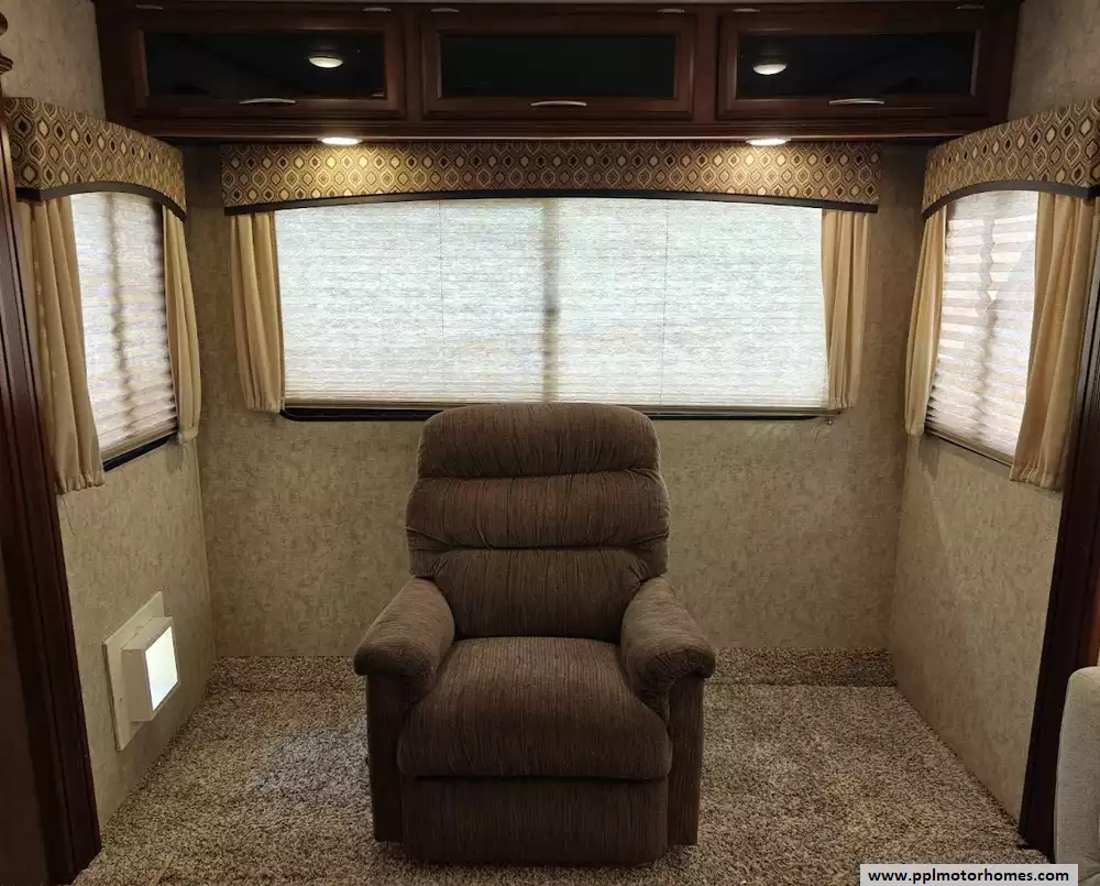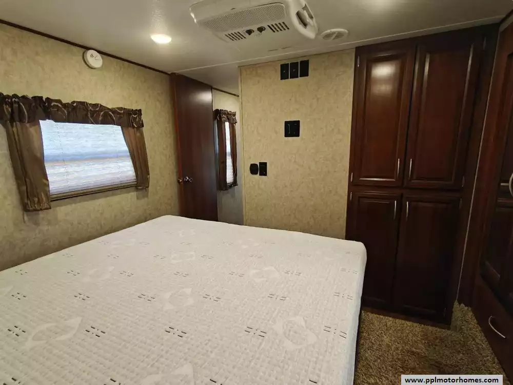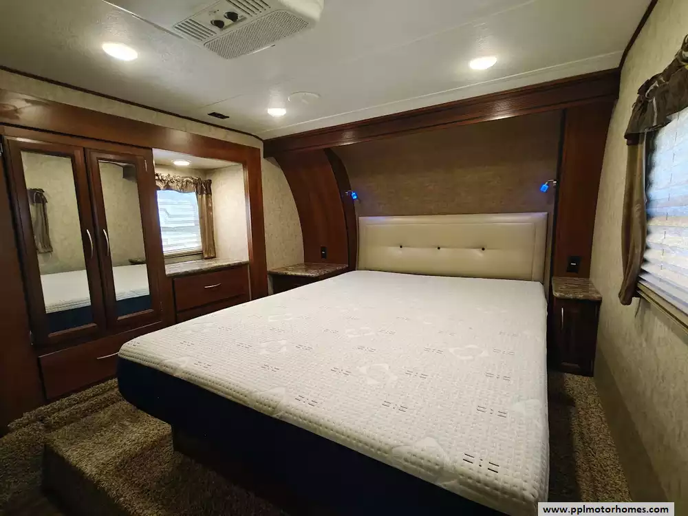 Features include..... Electric Landing Gear, Auto-Leveling, 1 Non-Ducted And 1 Ducted 15,000 BTU Air Conditioner, Double Door Gas/110v Norcold Refrigerator, Washer/Dryer Connections, Portable Solar Panel (under bed) Outside Speakers, TV, DVD Player, Outside Shower, Oxygenics Shower Head In Shower, Fireplace, Remote Contril Ceiling Fan, Microwave, NEW 3 Burner Range, Corian Kitchen Countertop, Tablet with all Manual Preinstalled, Oven and is Back Up Camera Ready. Additionally it has a Flex Armour Roof, Rear Cabinets Have Hydraulic Stuts to Hold in the Open Position, Upgraded Spring Shackles, Bronze Bushing and Lubricatd Shackle Bolts.
