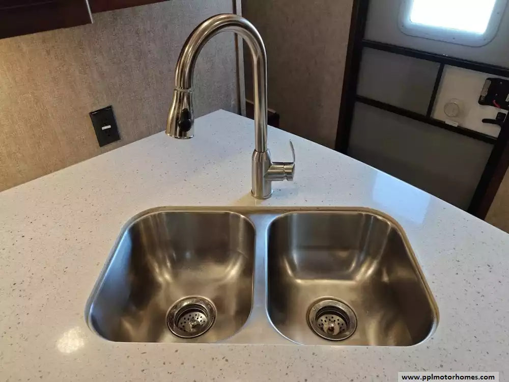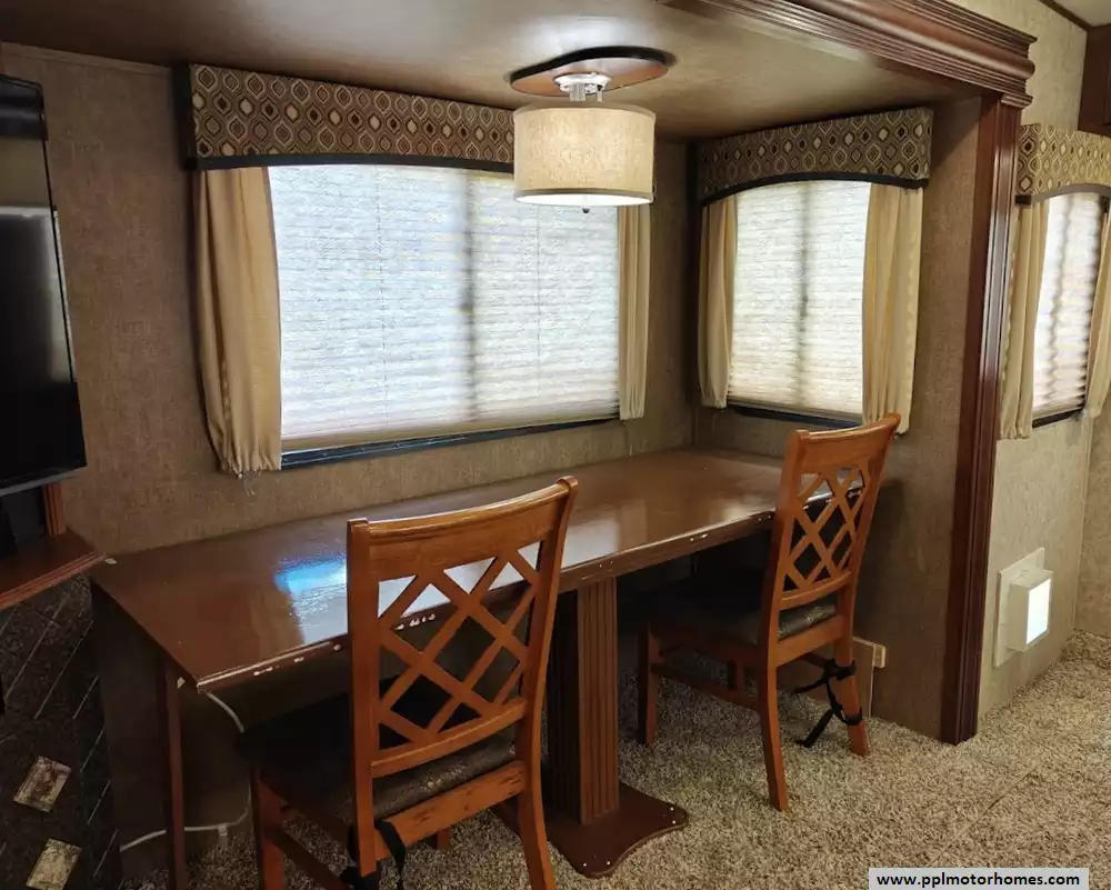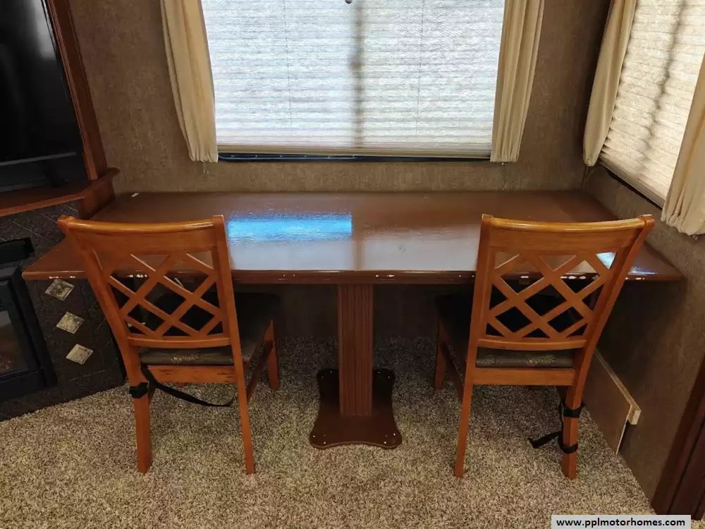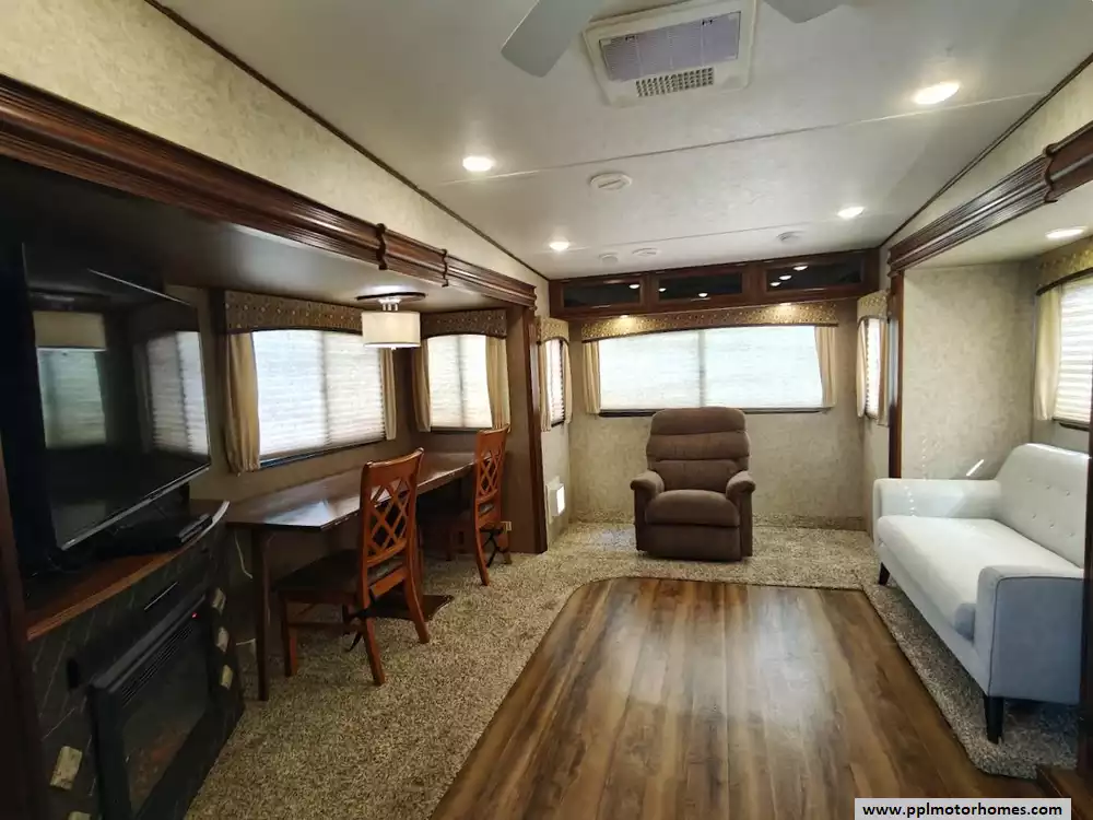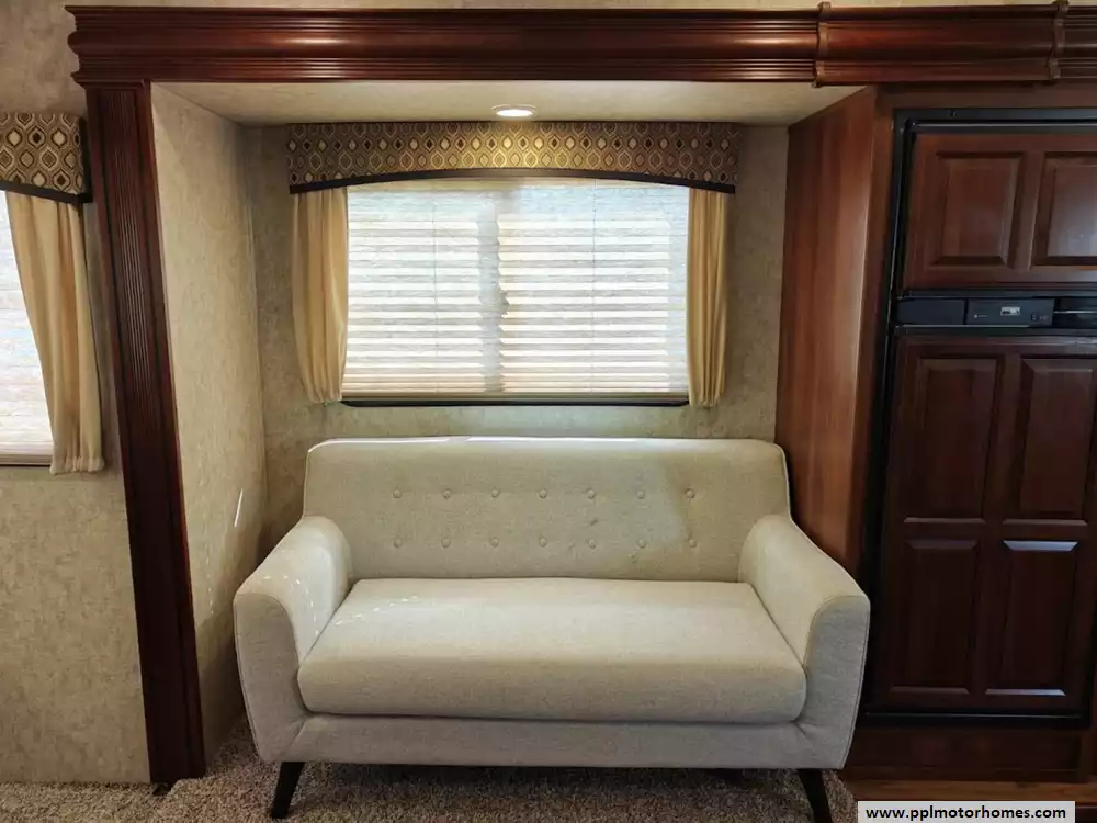 Features include..... Electric Landing Gear, Auto-Leveling, 1 Non-Ducted And 1 Ducted 15,000 BTU Air Conditioner, Double Door Gas/110v Norcold Refrigerator, Washer/Dryer Connections, Portable Solar Panel (under bed) Outside Speakers, TV, DVD Player, Outside Shower, Oxygenics Shower Head In Shower, Fireplace, Remote Contril Ceiling Fan, Microwave, NEW 3 Burner Range, Corian Kitchen Countertop, Tablet with all Manual Preinstalled, Oven and is Back Up Camera Ready. Additionally it has a Flex Armour Roof, Rear Cabinets Have Hydraulic Stuts to Hold in the Open Position, Upgraded Spring Shackles, Bronze Bushing and Lubricatd Shackle Bolts.