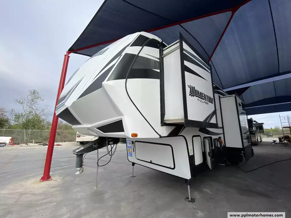 This 2016 Momentum 350M has a Hydraulic Landing Gear, 3 Slide-outs, Onan Gas Generator, 1 Non-Ducted And 1 Ducted Air Conditioner, 4 Door Gas/110v Norcold Refrigerator, Automatic Main Awning And Door Awning, Washer/Dryer Connections, Outside Speakers, 2 TVs, DVD Player, Outside Shower, Fireplace, Microwave, 3 Burner Range, Oven